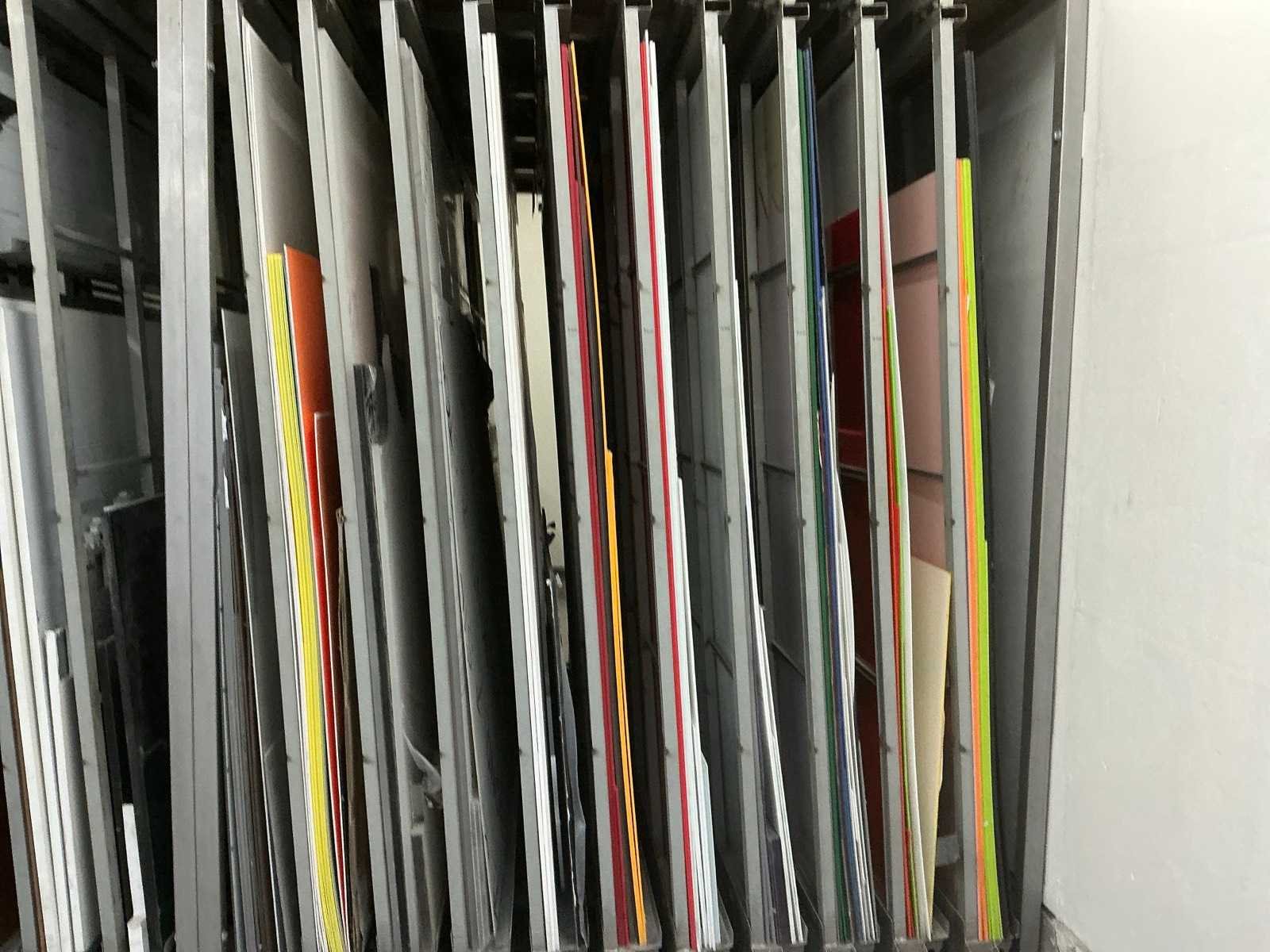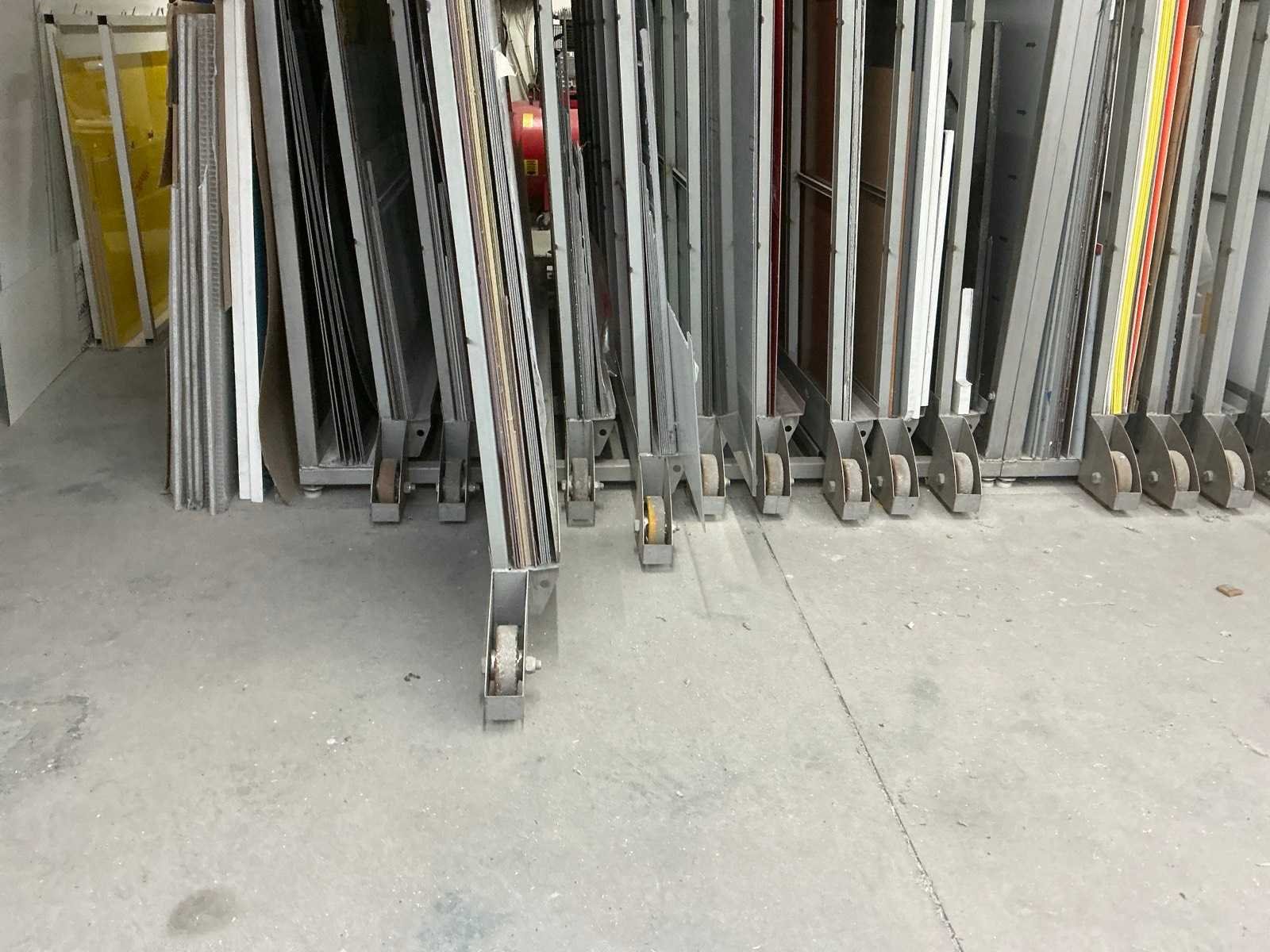 Voorzien van 10 uitrolbare platenhouders elk circa. 300 x 250cm, Inhoudende enige diverse reeds aangebroken alu platen in diverse maten en uitvoeringen Nee Demontabel: true Totale afmeting L: 300cm Totale afmeting Breedte: 390cm Totale afmeting Hoogte: 250cm