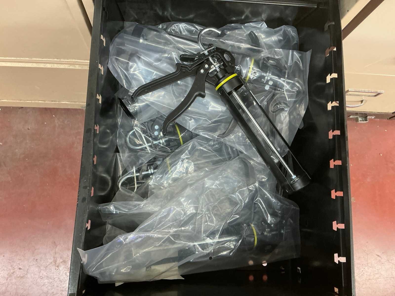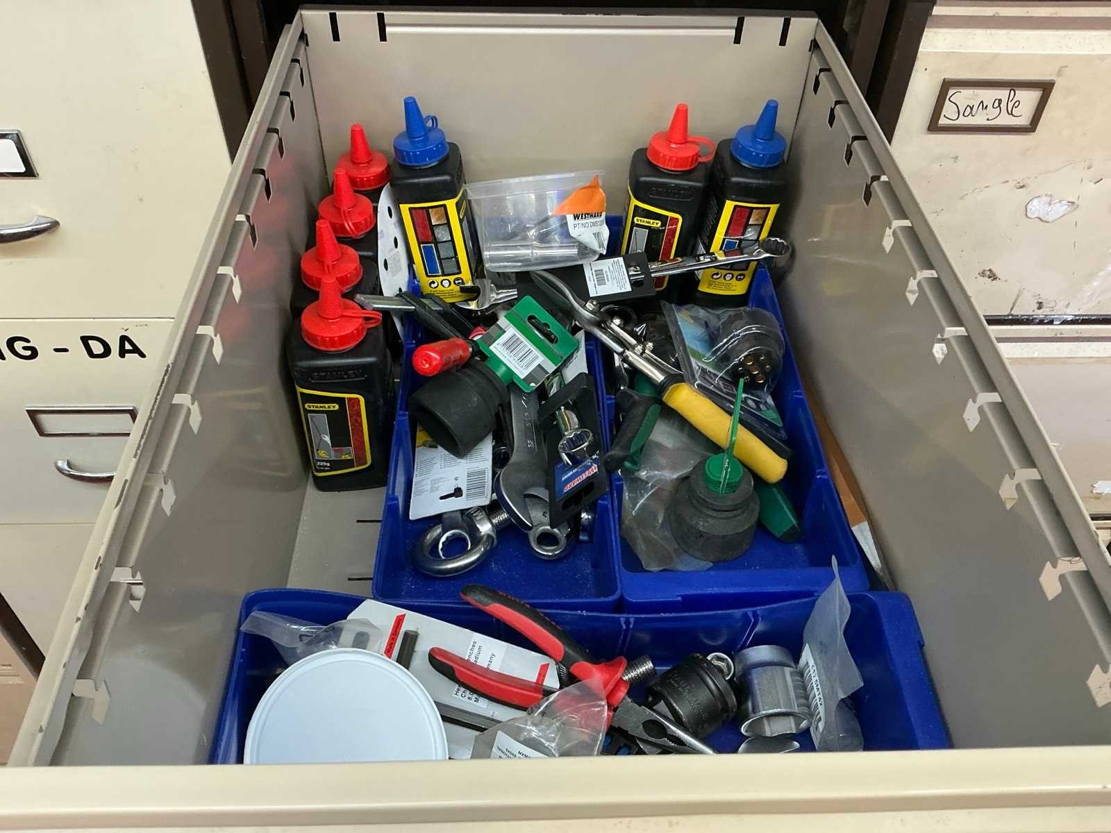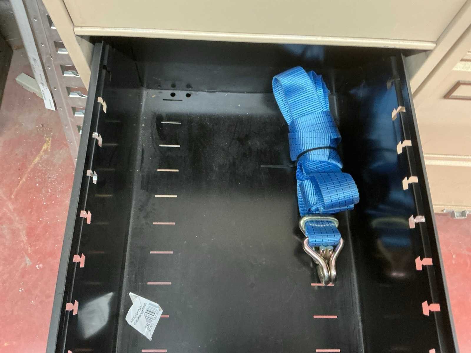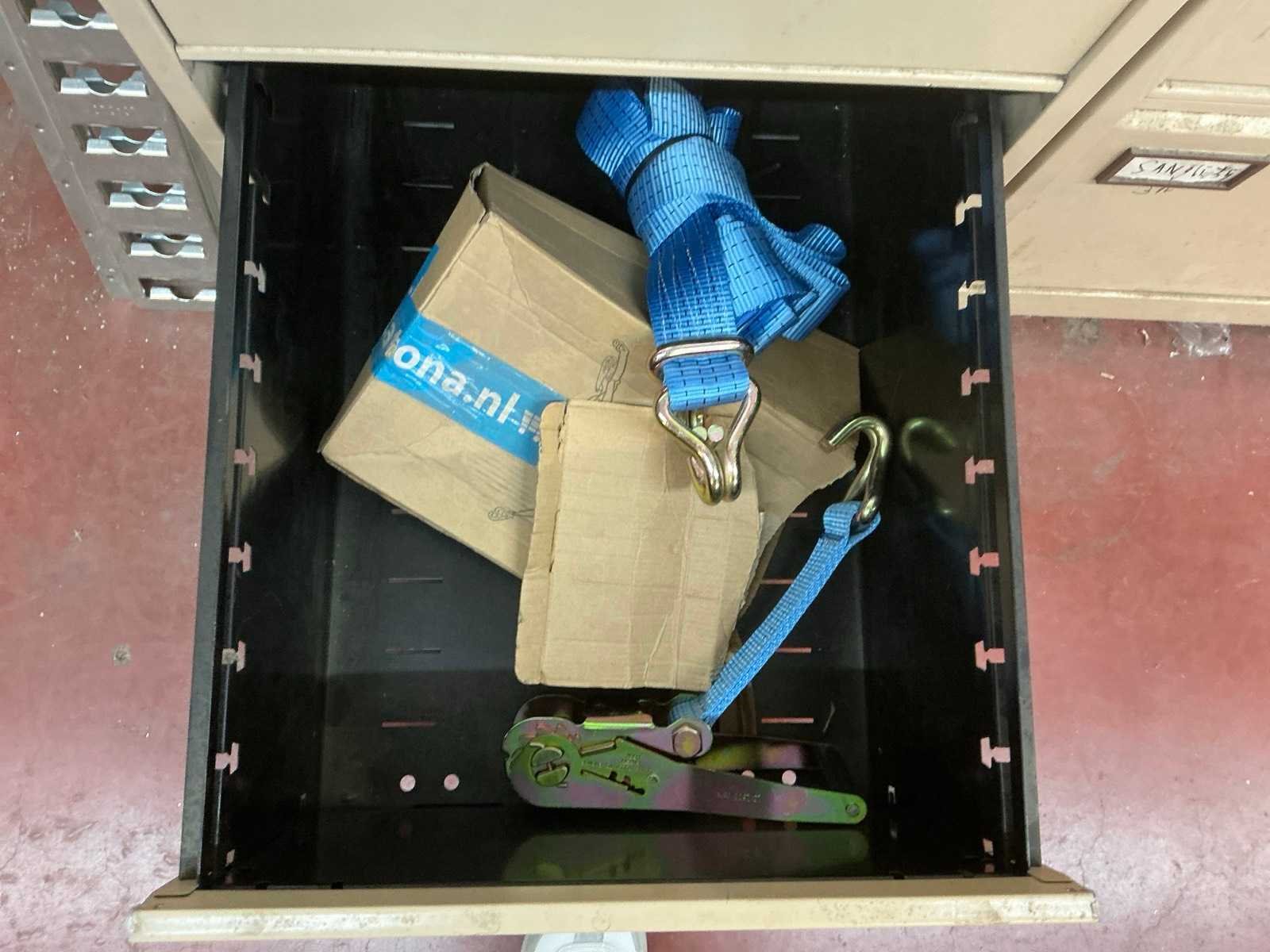 Waaronder afmeting 47 x 62 x 135 cm en 48 x 62 x 105 cm Compleet met inhoud zijnde, partij divers handgereedschap waaronder dopsleutels en bits, diverse spanbanden, siliconespuiten, diverse stroppen, partij houtlijm, aanhangwagen net, tangen, scharen, steeksleutels, hoekklemmen, partij diverse powersupplies, divers elektrotoebehoren, enzovoort Nee