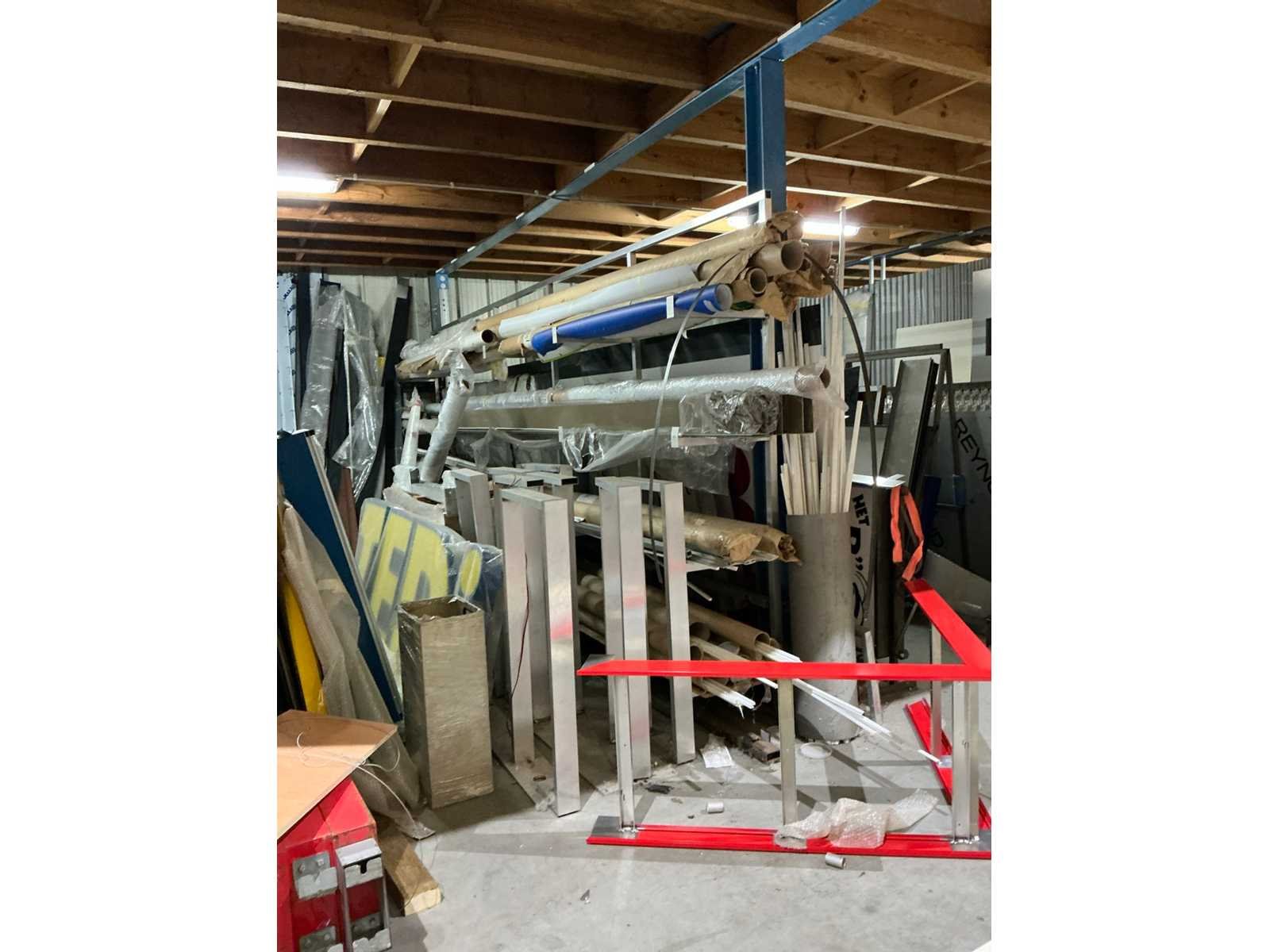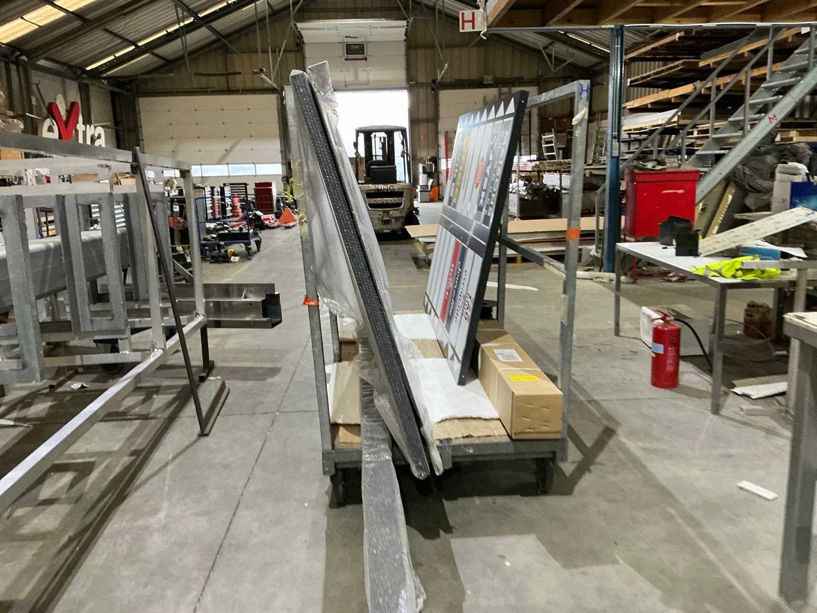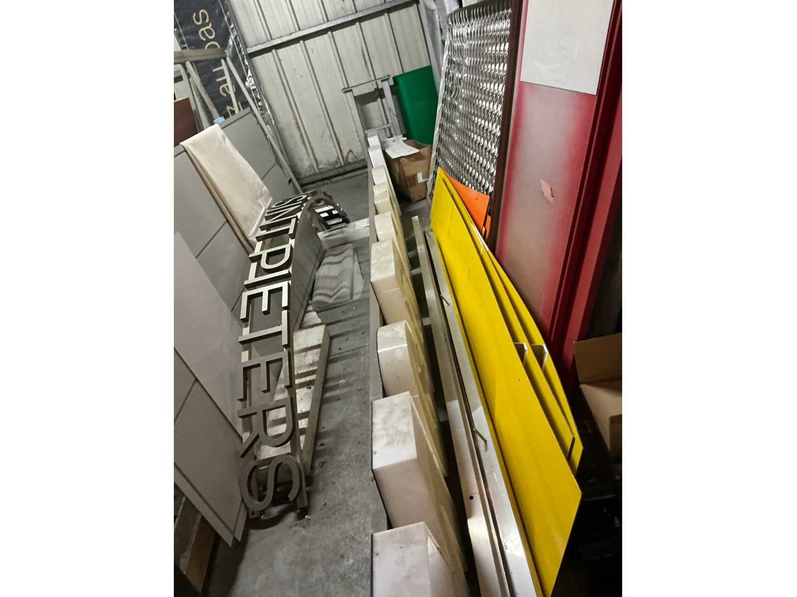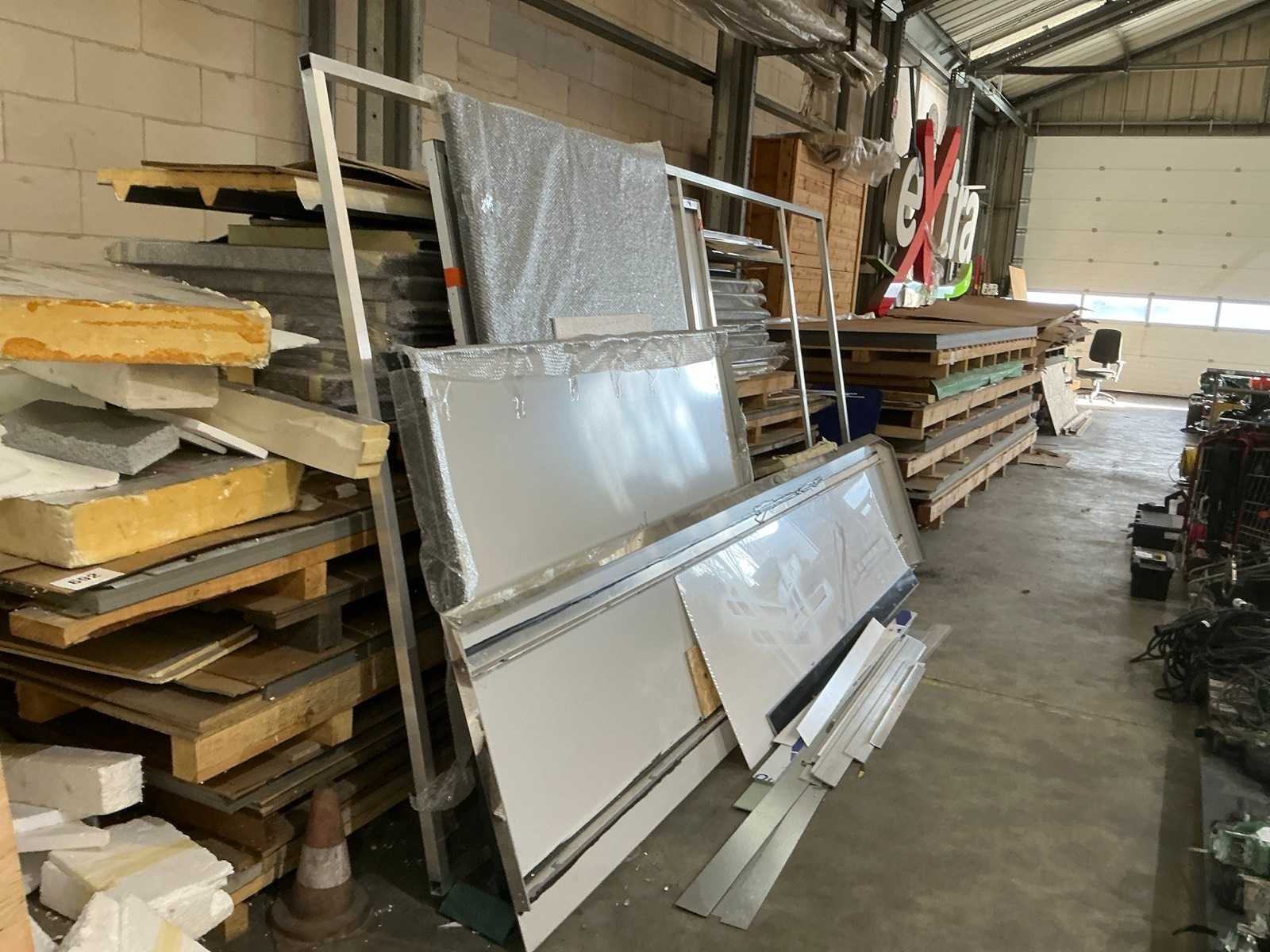 Waaronder bestaande uit partij logo’s , logoletters , alu en pvc platen, alu frames, metalen en alu profielen, in diverse afmetingen en uitvoeringen waaronder profielen met maximale lengte 310 cm en diverse logo’s met maximale afmeting 330 x 175 cm, en alu profielen tot maximale lengte van 250 x 60 cm, compleet met enige rollen folie waaronder aangesproken en diverse lichtbakken waaronder LADBROKES, uitgezonderd genummerde kavels, liggende in 2 houten bokken, 2 metalen dubbelzijdige bokken, 2 verrijdbare transportkarren ( zonder kar), tegen wand onder vlonder en alu draagarmstelling (inclusief), afgifte volgens aanwijzing Nee