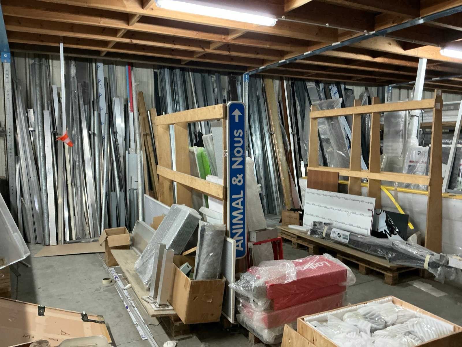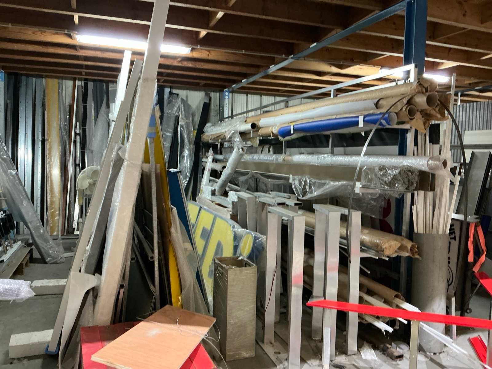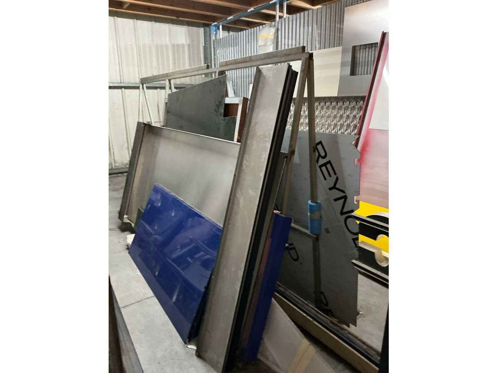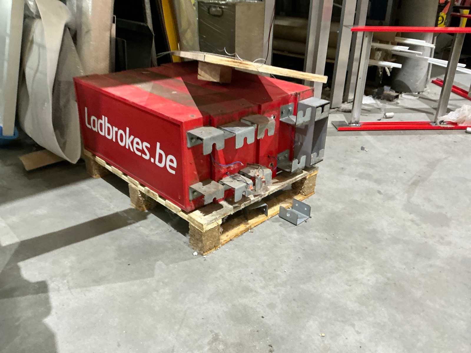 Waaronder bestaande uit partij logo’s , logoletters , alu en pvc platen, alu frames, metalen en alu profielen, in diverse afmetingen en uitvoeringen waaronder profielen met maximale lengte 310 cm en diverse logo’s met maximale afmeting 330 x 175 cm, en alu profielen tot maximale lengte van 250 x 60 cm, compleet met enige rollen folie waaronder aangesproken en diverse lichtbakken waaronder LADBROKES, uitgezonderd genummerde kavels, liggende in 2 houten bokken, 2 metalen dubbelzijdige bokken, 2 verrijdbare transportkarren ( zonder kar), tegen wand onder vlonder en alu draagarmstelling (inclusief), afgifte volgens aanwijzing Nee