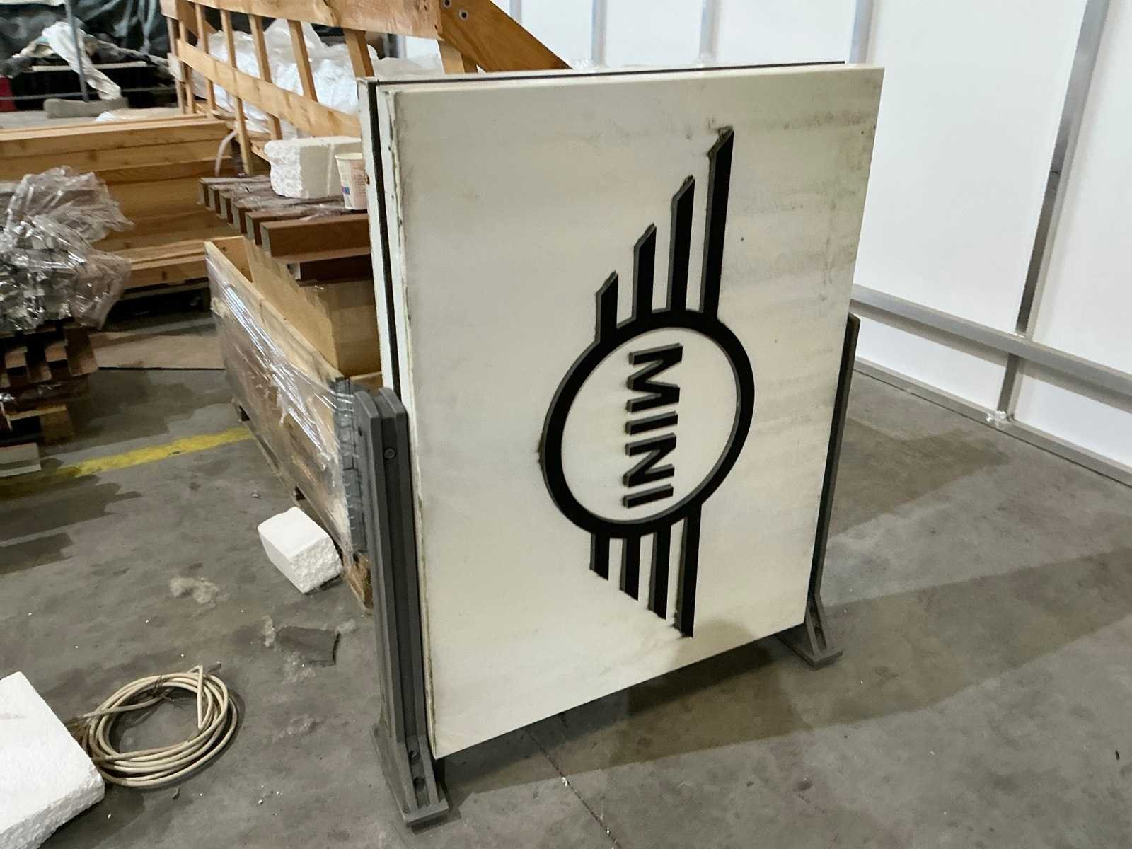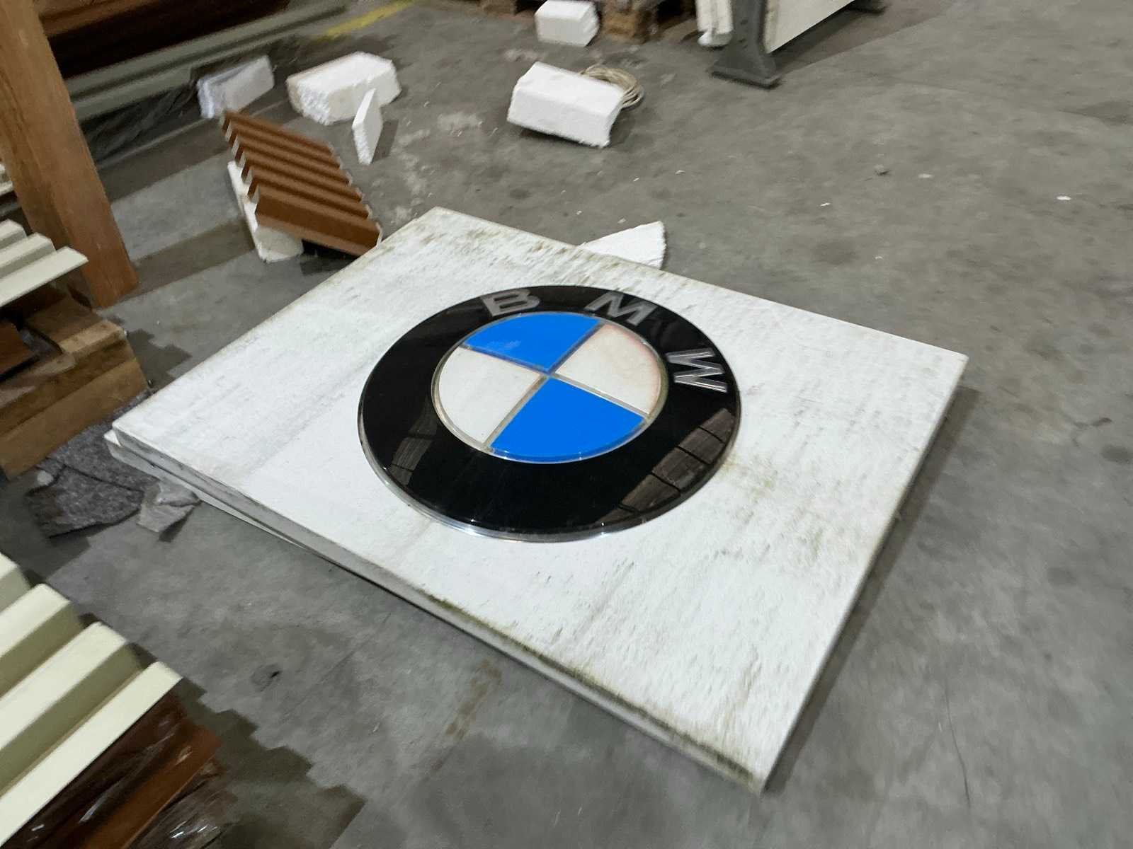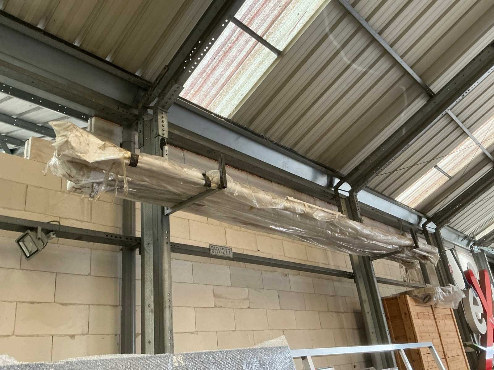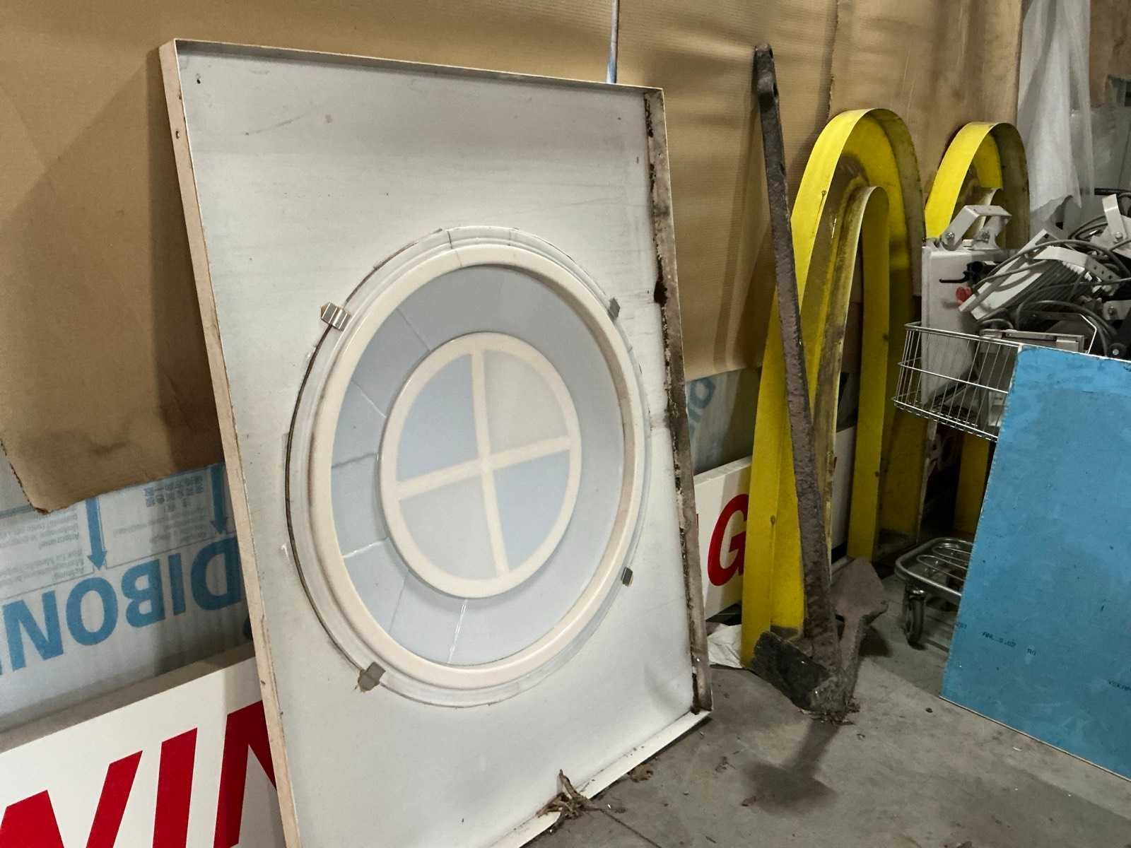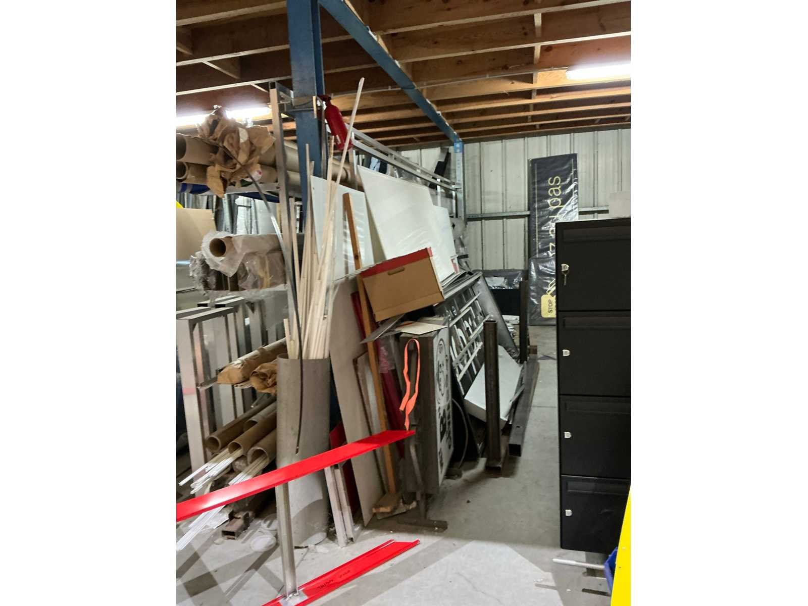 Waaronder bestaande uit partij logo’s , logoletters , alu en pvc platen, alu frames, metalen en alu profielen, in diverse afmetingen en uitvoeringen waaronder profielen met maximale lengte 310 cm en diverse logo’s met maximale afmeting 330 x 175 cm, en alu profielen tot maximale lengte van 250 x 60 cm, compleet met enige rollen folie waaronder aangesproken en diverse lichtbakken waaronder LADBROKES, uitgezonderd genummerde kavels, liggende in 2 houten bokken, 2 metalen dubbelzijdige bokken, 2 verrijdbare transportkarren ( zonder kar), tegen wand onder vlonder en alu draagarmstelling (inclusief), afgifte volgens aanwijzing Nee