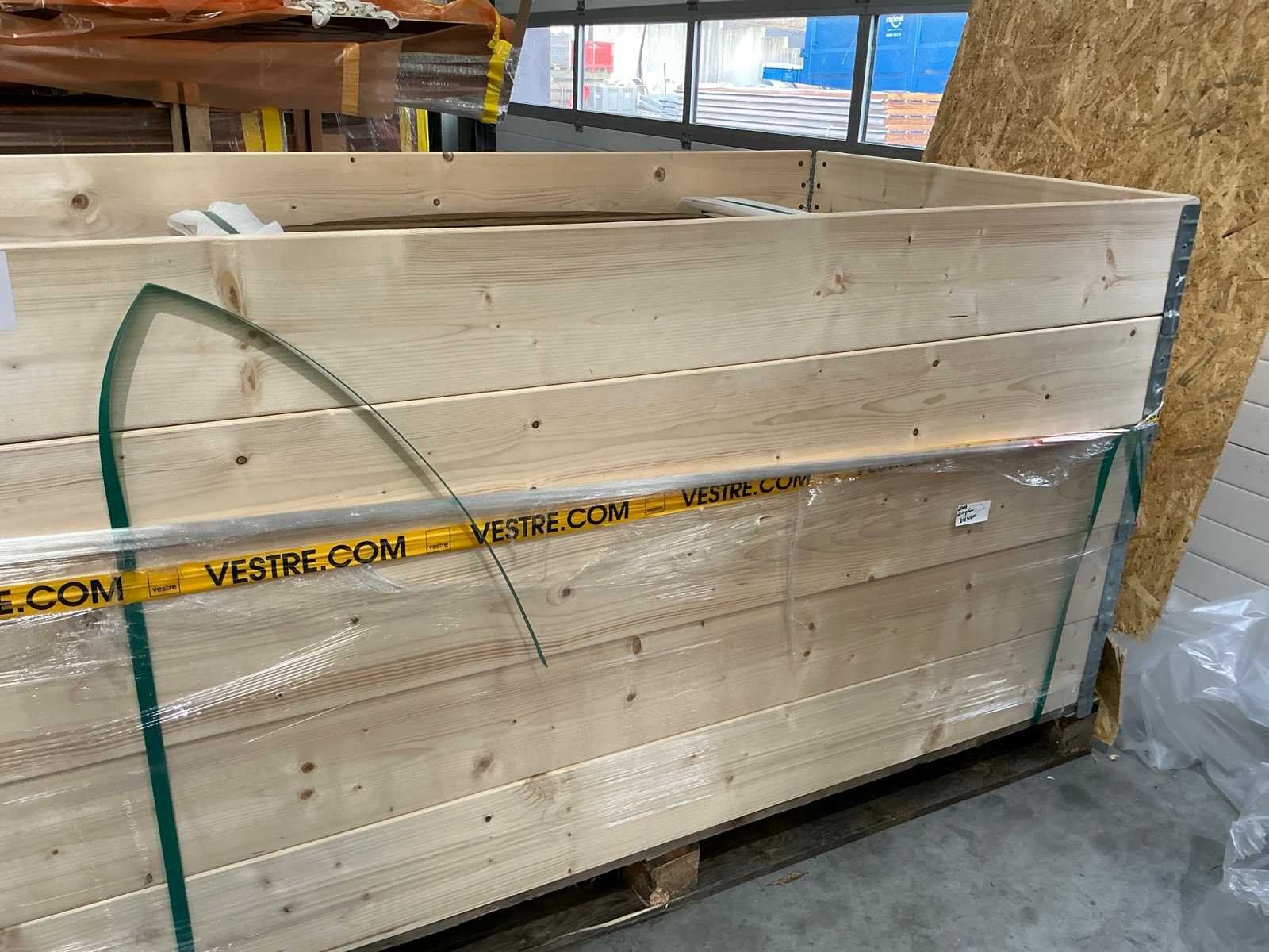 Bestaande uit 2 halfronde delen, voorzien van metalen frame en houten zitting, nieuw in originele verpakking/krat Nee Lengte: 178cm Breedte: 88cm Hoogte: 45cm Zithoogte: 45
