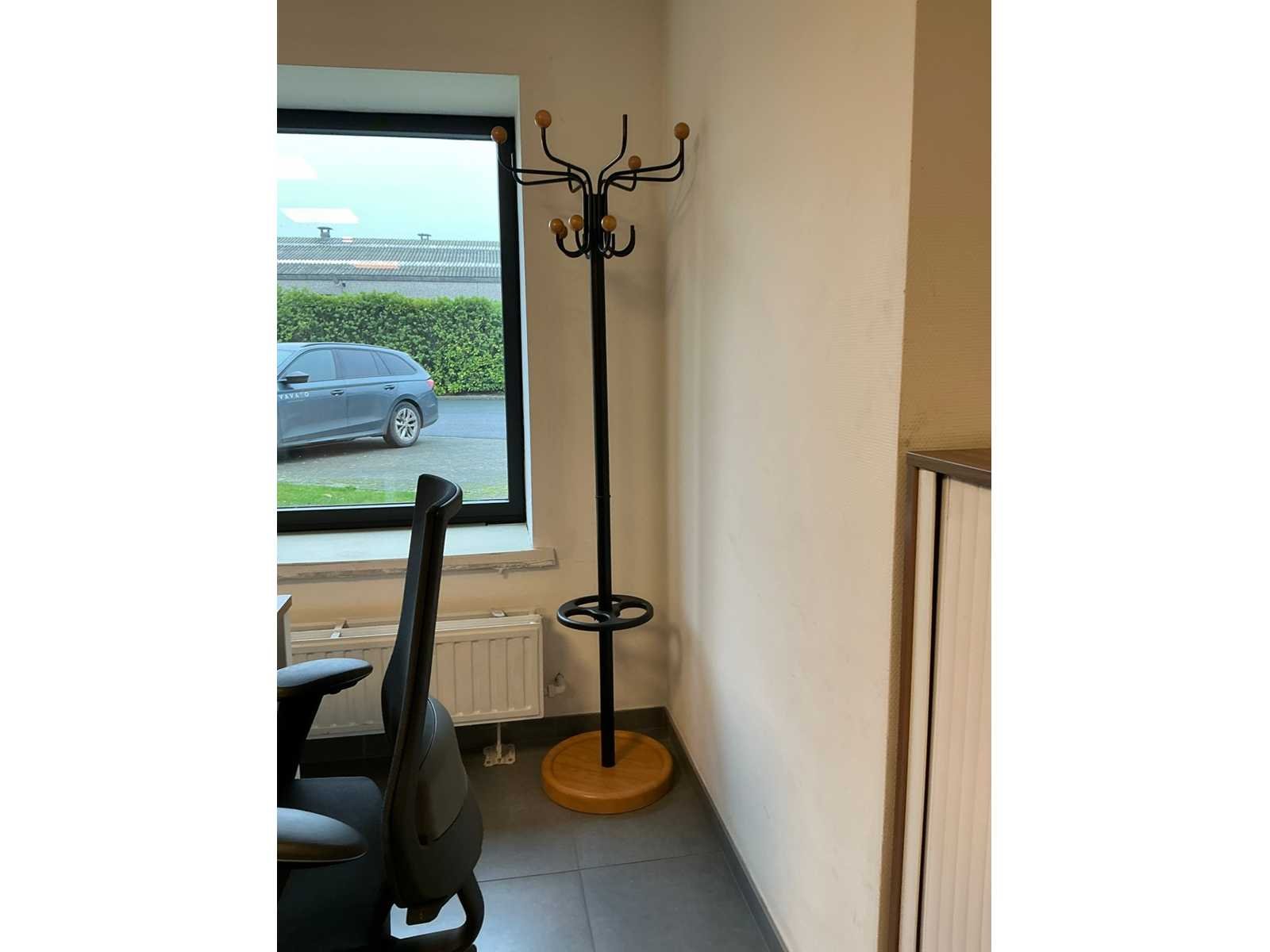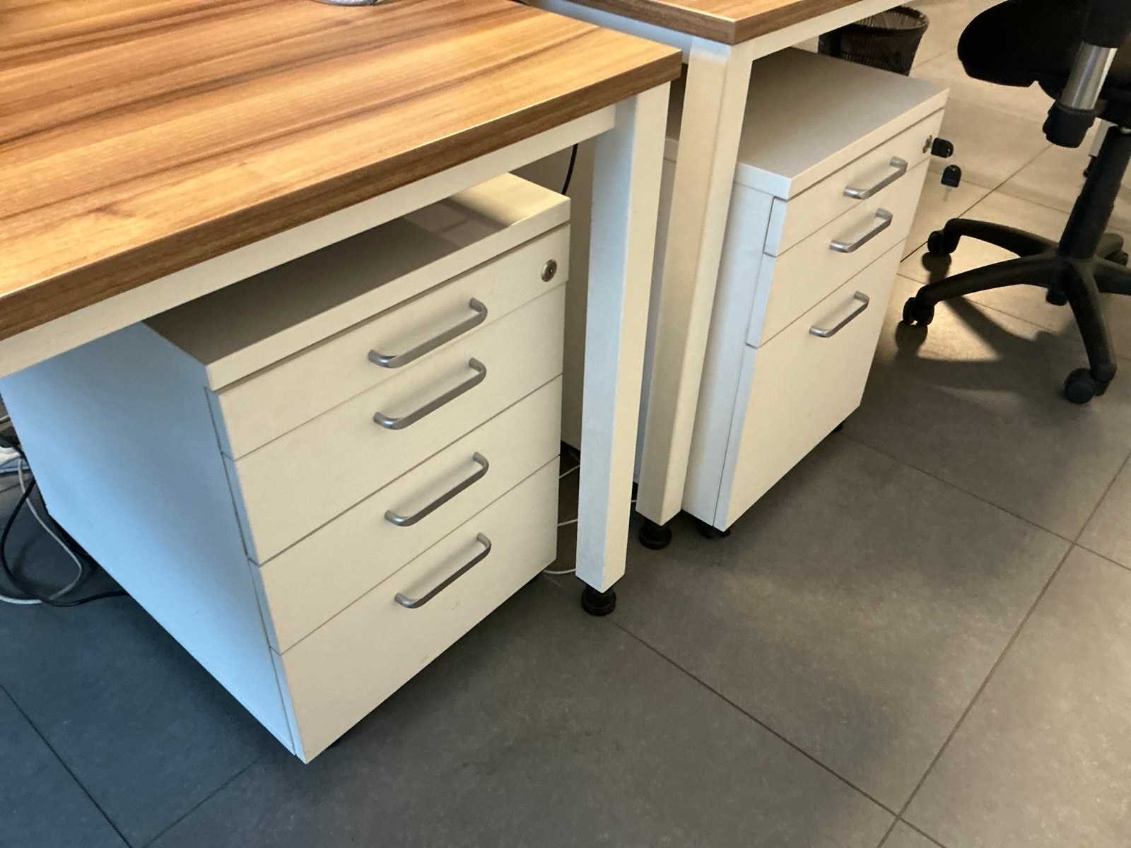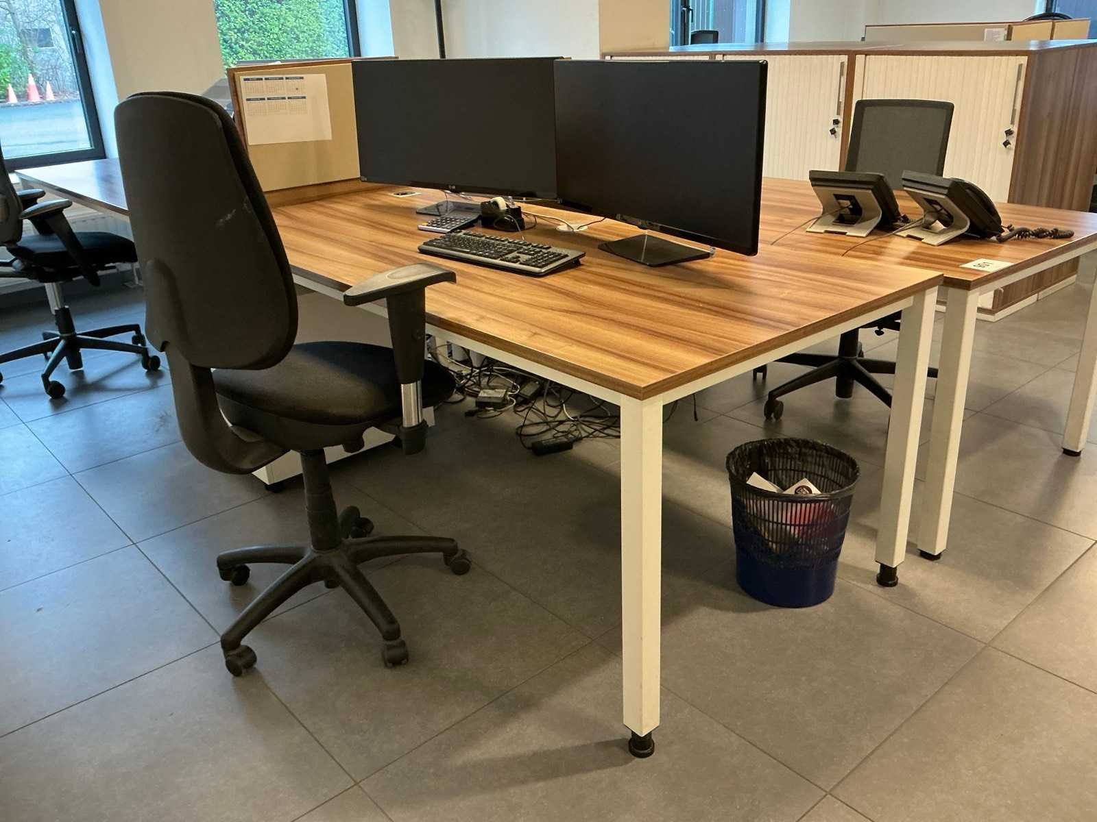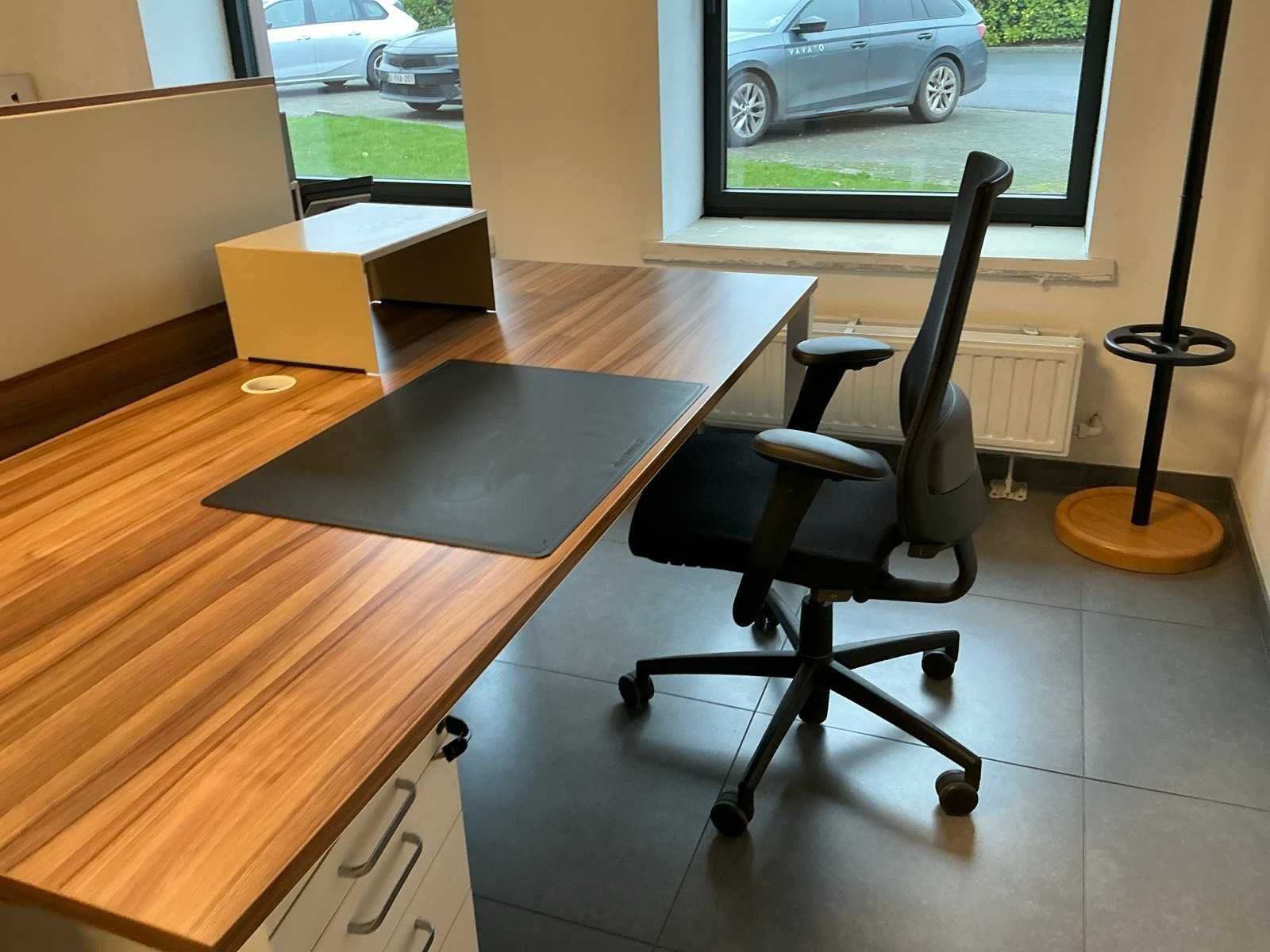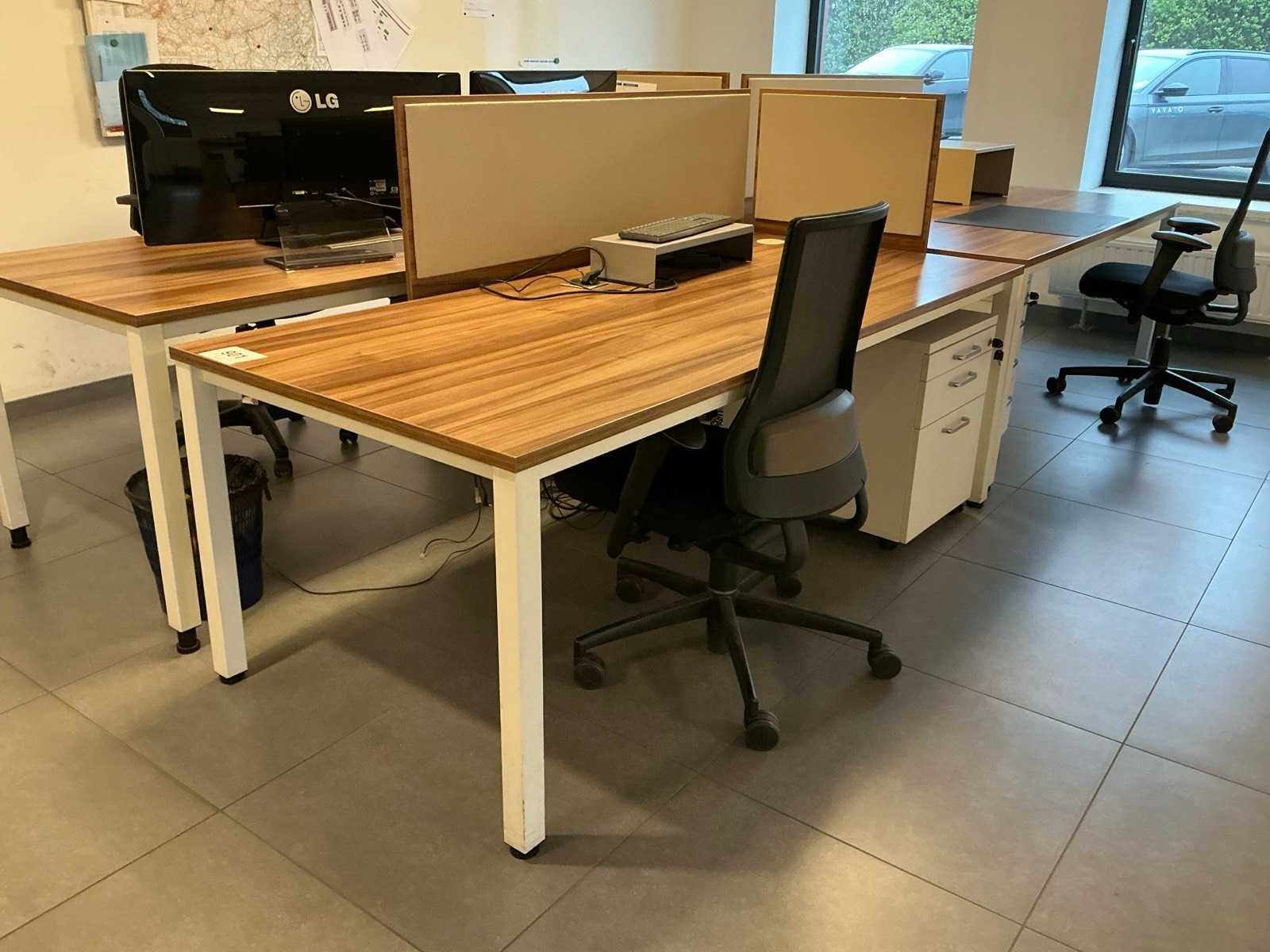 Bestaande uit 4 delen elk van afmeting circa 200 x 90 x 76 cm waaronder 2 voorzien van tussenwanden, 2 monitors LG 34UM65,2 diverse toetsenborden, 4 diverse laptopstanden, 4 ladenblokken waaronder 2 voorzien van 4 laden en 2 voorzien van 3 laden, 4 diverse bureaustoelen voorzien van stoffen bekleding compleet met metalen staande kapstok Nee