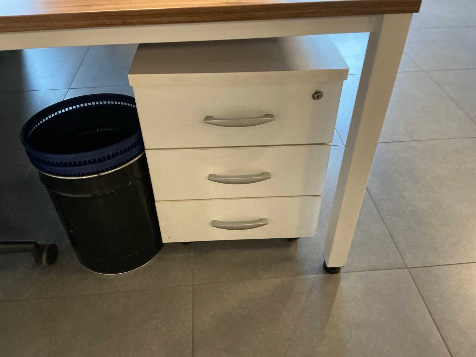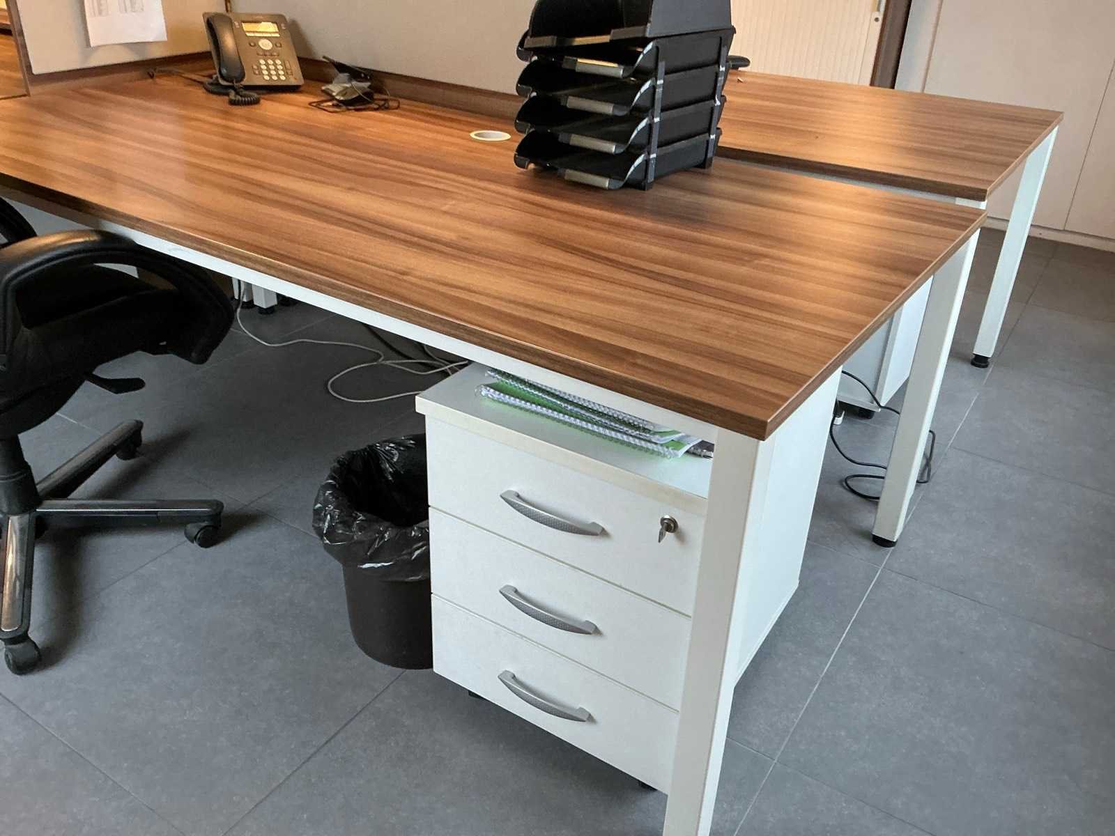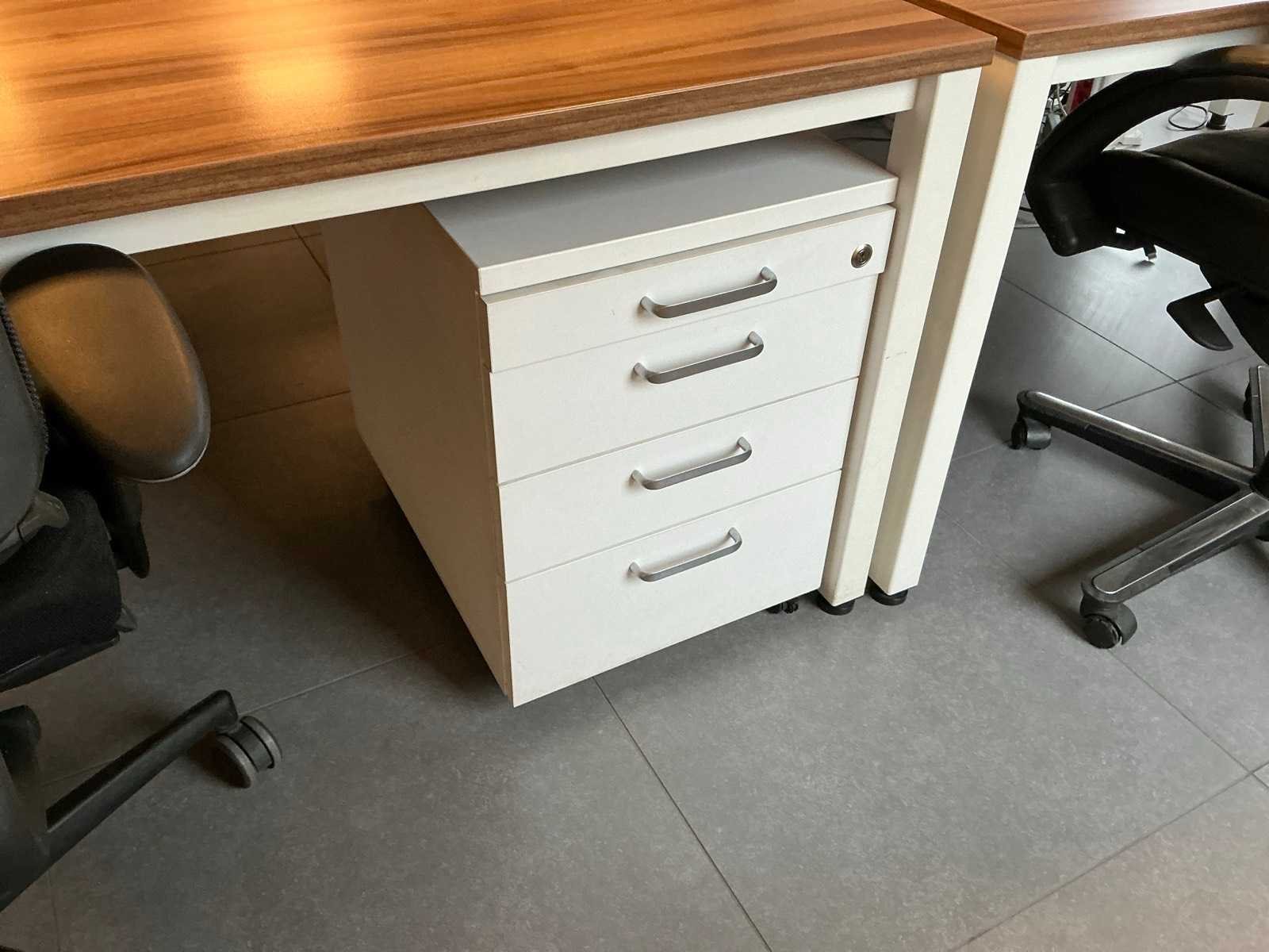 Bestaande uit 4 delen elk van afmeting circa 200 x 90 x 76 cm waaronder 2 voorzien van tussenwanden, 2 monitors LG 34UM65,4 ladenblokken waaronder 2 voorzien van 4 laden en 2 voorzien van 3 laden, 4 diverse bureaustoelen waaronder voorzien van stoffen bekleding Nee