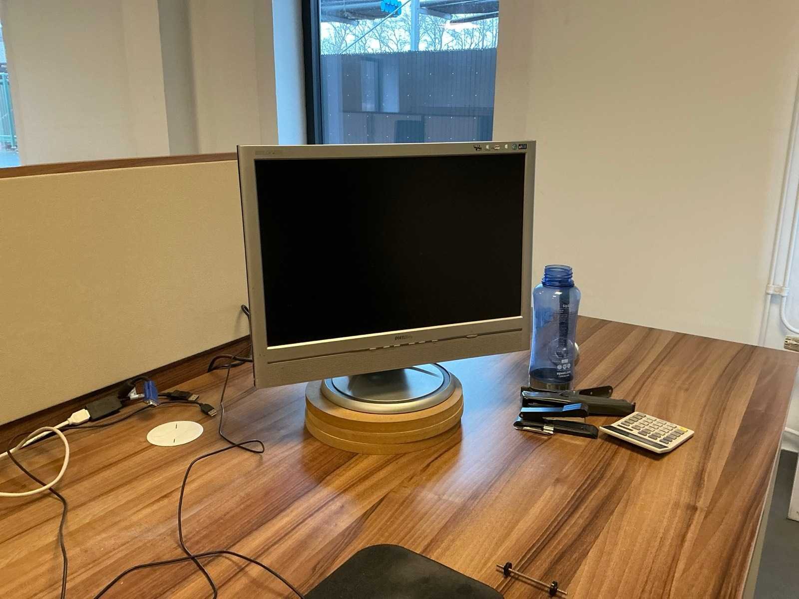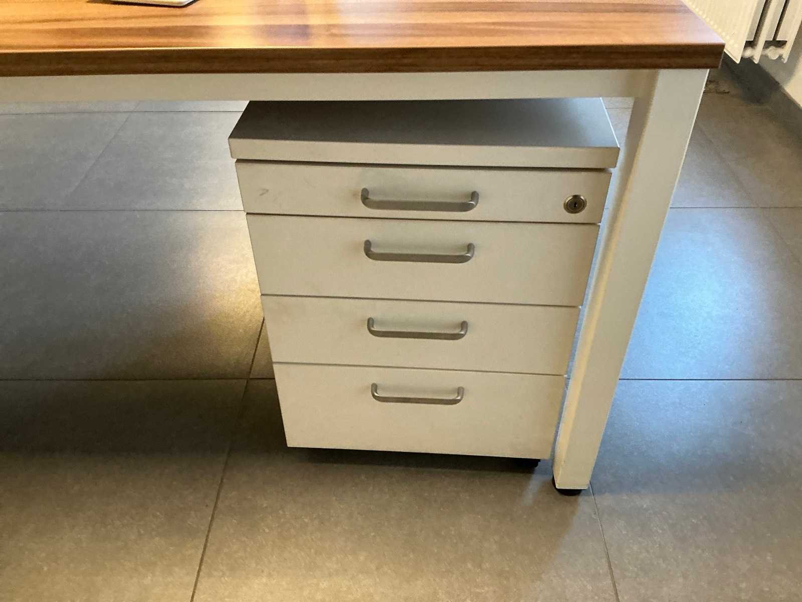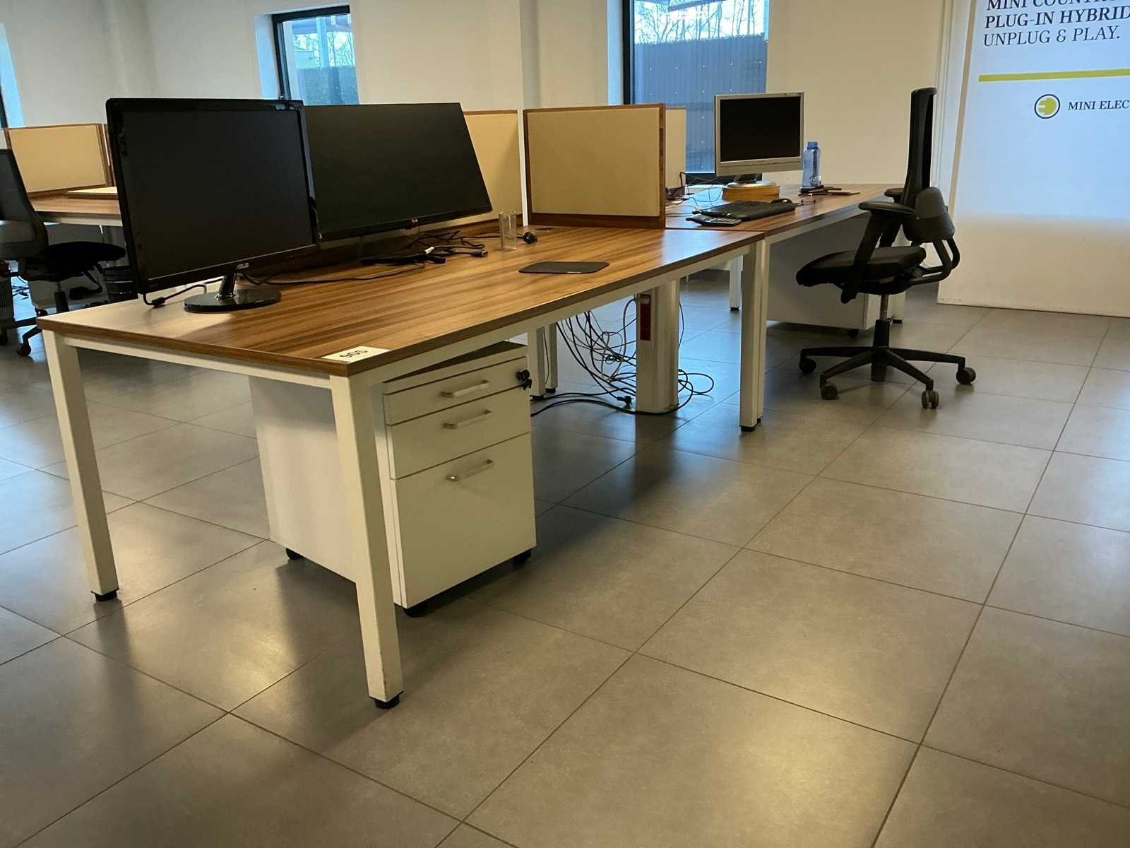 Bestaande uit 2 delen elk van afmeting circa 200 x 90 x 76 cm waaronder 2 voorzien van tussenwanden, 3 diverse monitors LG 34UM65, PHILIPS, ASUS, toetsenbord en muis DELL, 2 ladenblokken waaronder 1 voorzien van 4 laden en 1 voorzien van 3 laden, 1 bureaustoel waaronder voorzien van stoffen bekleding Nee