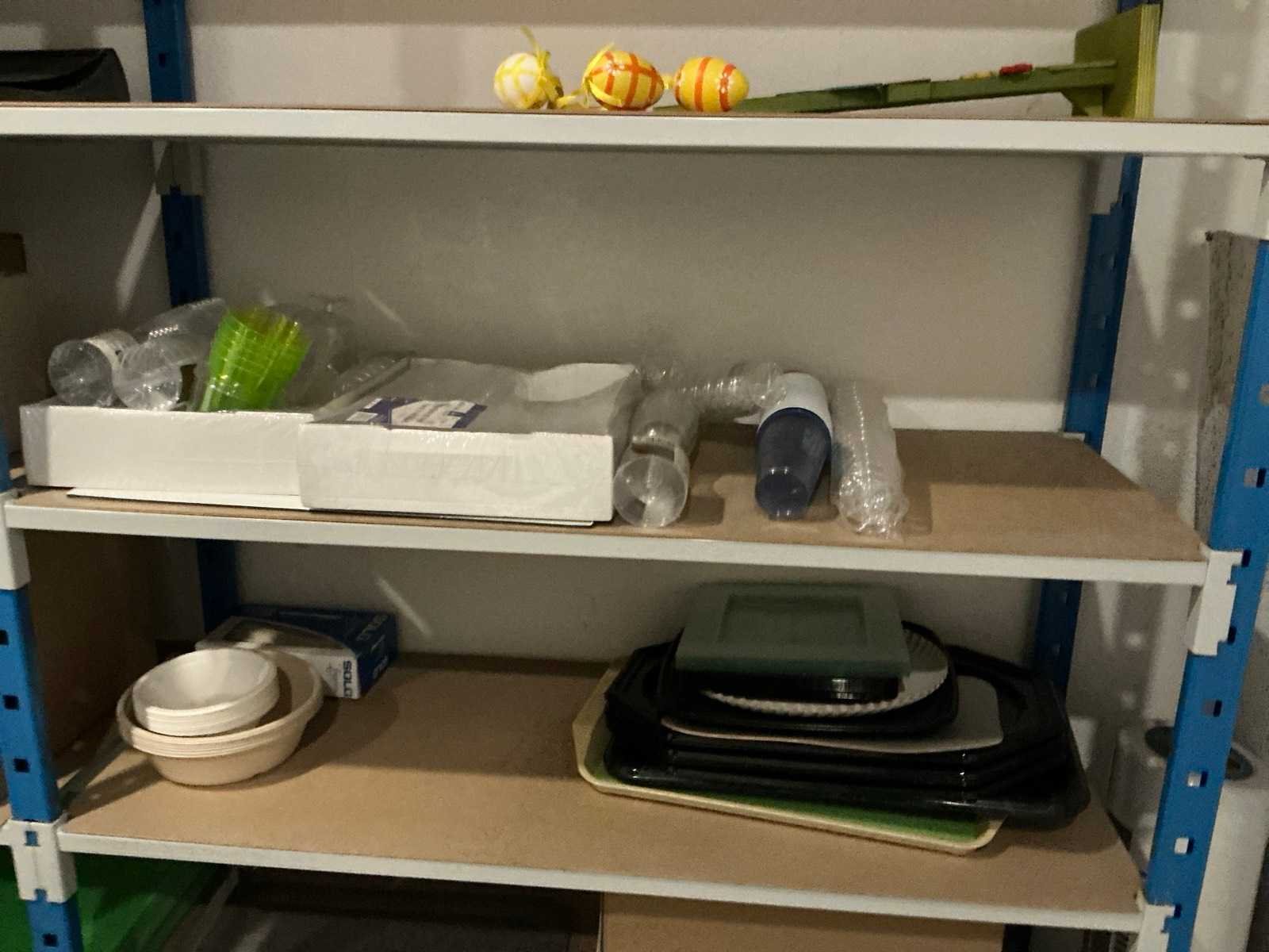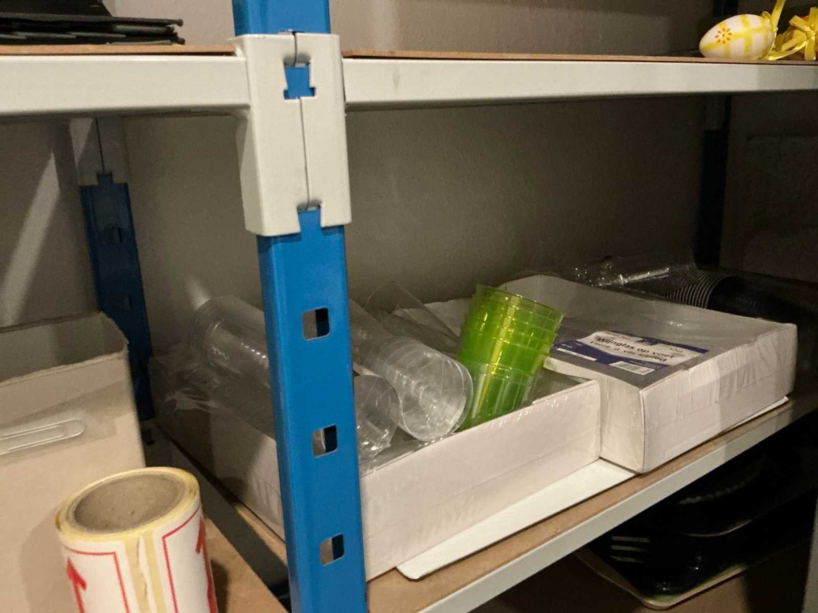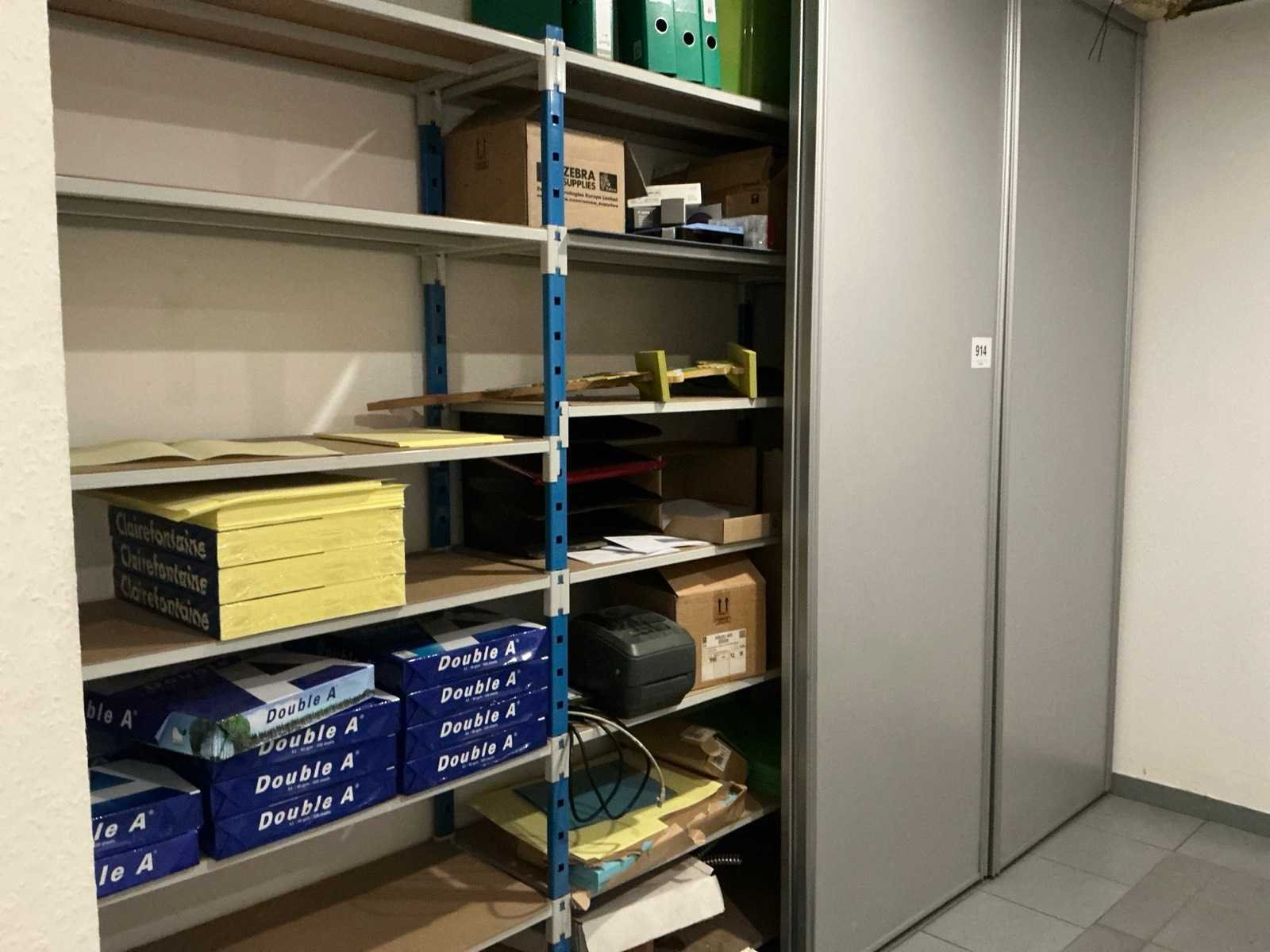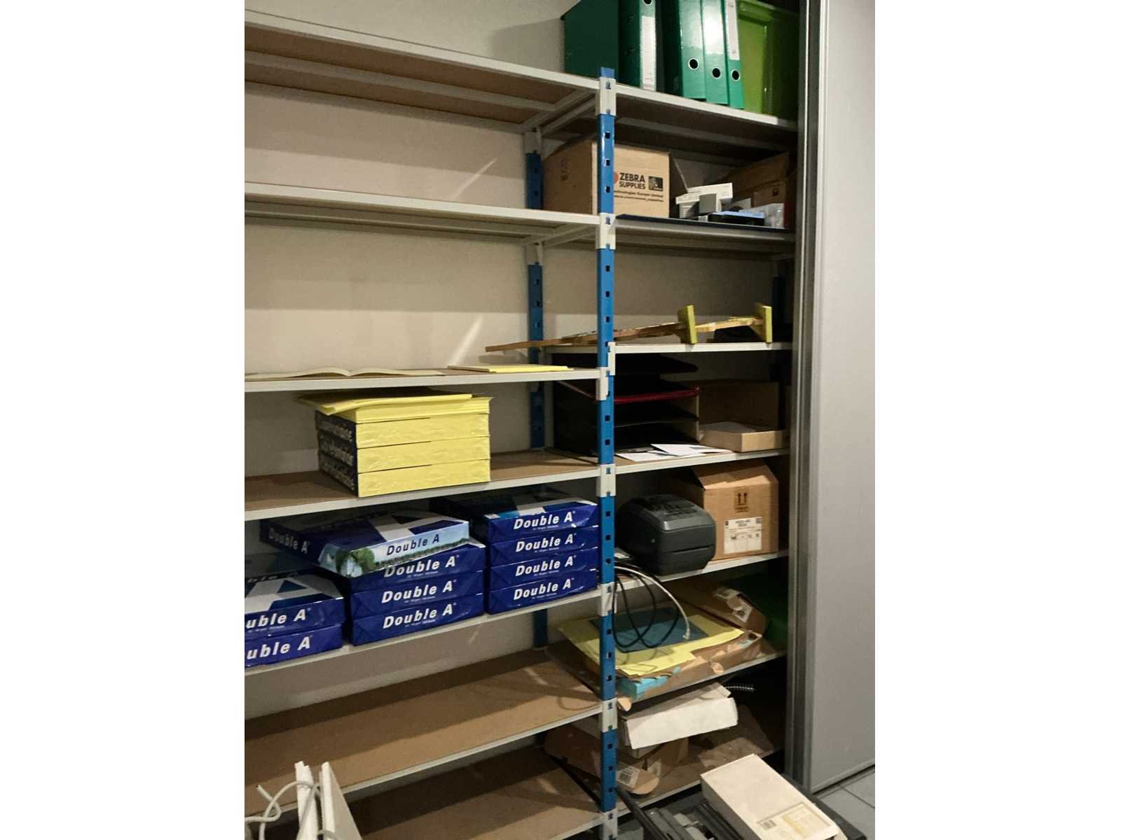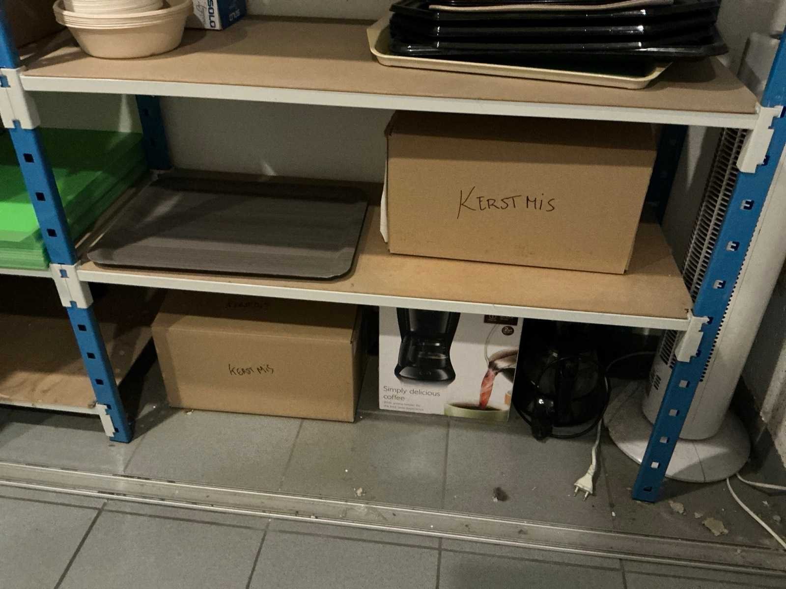 Met afmeting circa 300 x 40 x 200 cm, voorzien van 8 staanders en 27 leggers, compleet met inhoud bestaande uit enig printpapier waaronder A4 en A3, ticketprinter ZEBRA GK420T, inbindtoestel SPC RBX-60, diverse envellopes, 2x koffiezetapparaat PHILIPS, ventilator DOMO, wegwerpbekers, en seizoensgebonden decoratie, enzovoort Nee