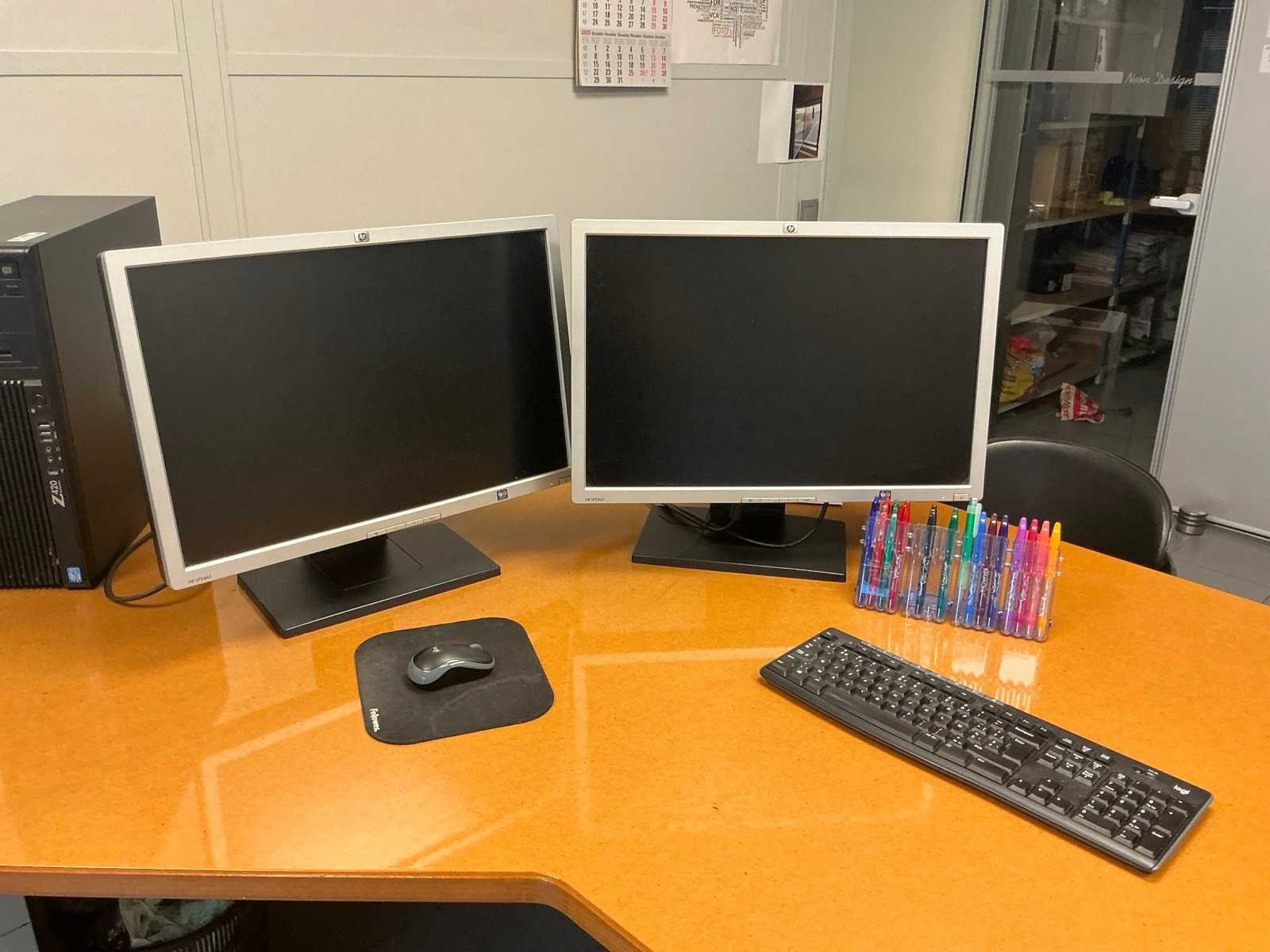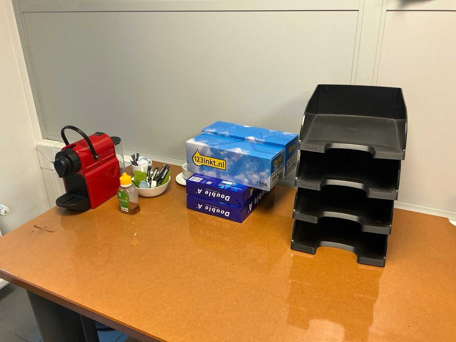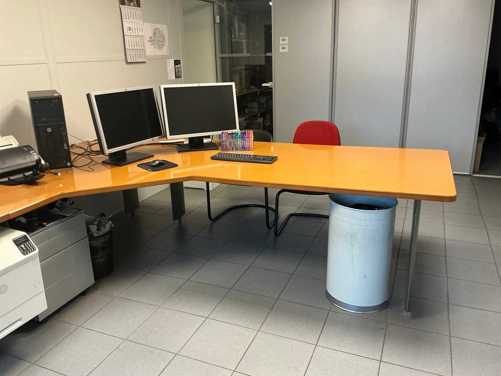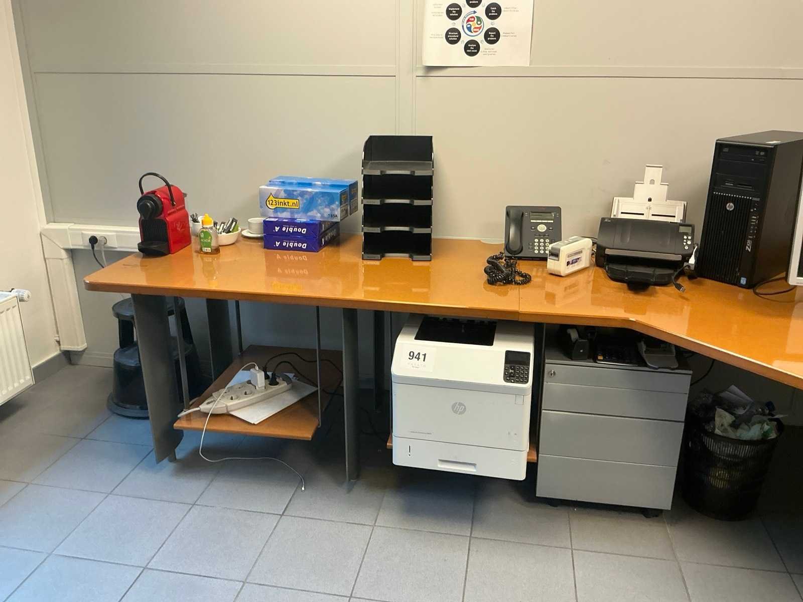 Bestaande uit: metalen hoekbureau voorzien houten bovenblad en aanbouwmeubel, totale afmeting: 270x320x75cm, 2x monitor HP LP2465 en toetsenbord en muis Logi, scanner Fujitsu Fi-7160, Pc beletteringssysteem Brother P-Touch 2430PC, 4-schuifs ladeblok, koffiemachine Nespresso, 2 diverse bijzetstoelen, ergonomische bureaustoel, 2 diverse vuilnisemmers en opstapje Hailo, uitgezonderd genummerde loten, Desktop HP Z420 en boekhouding Nee