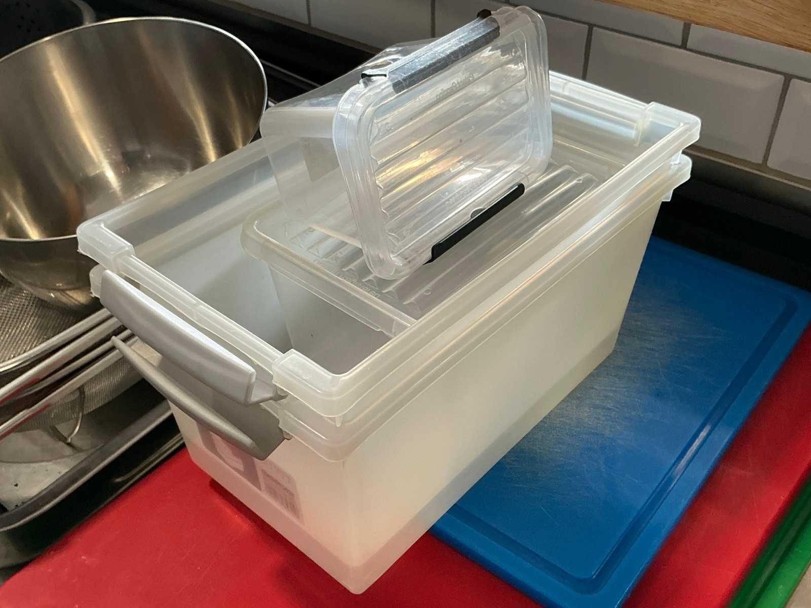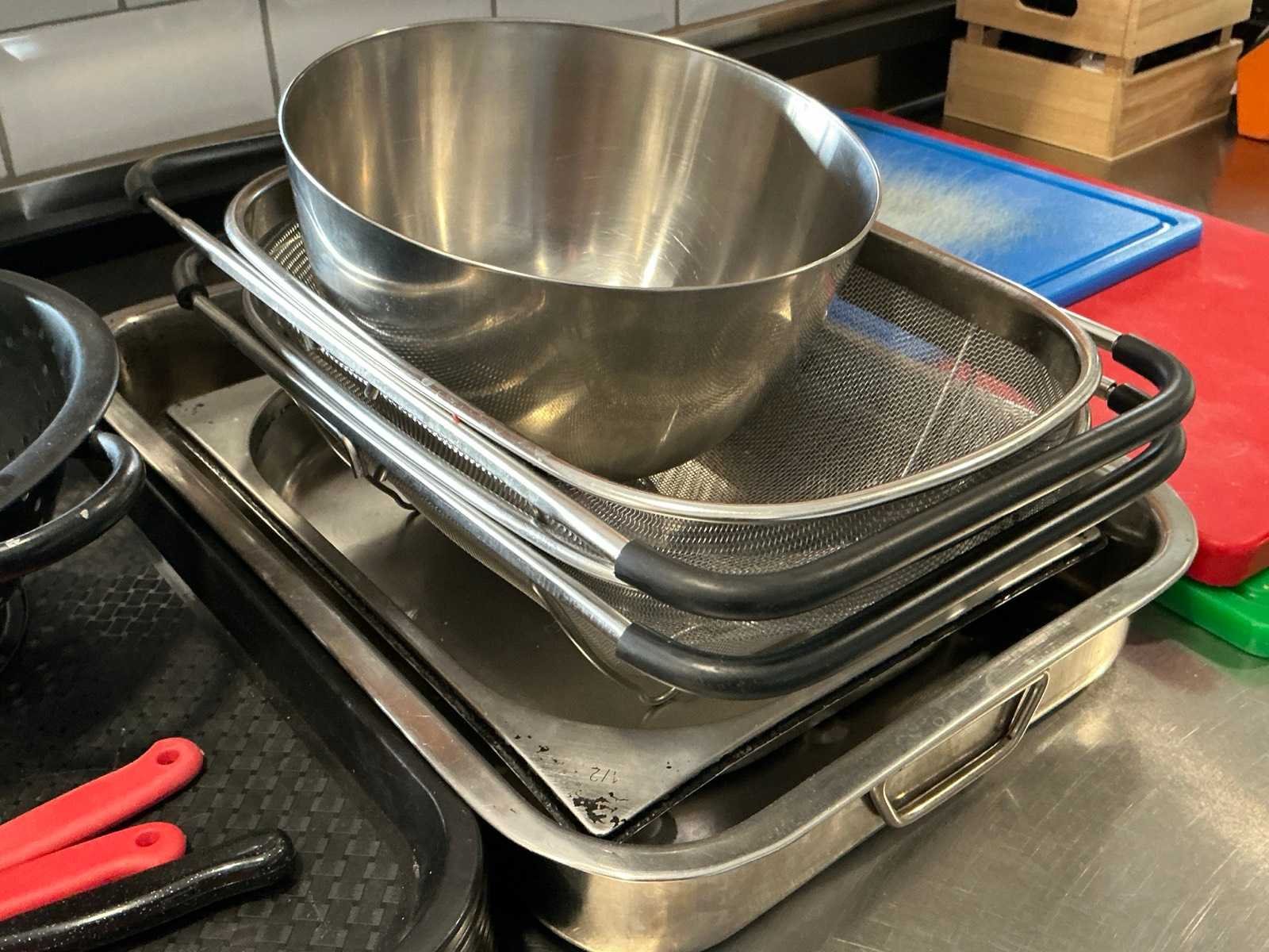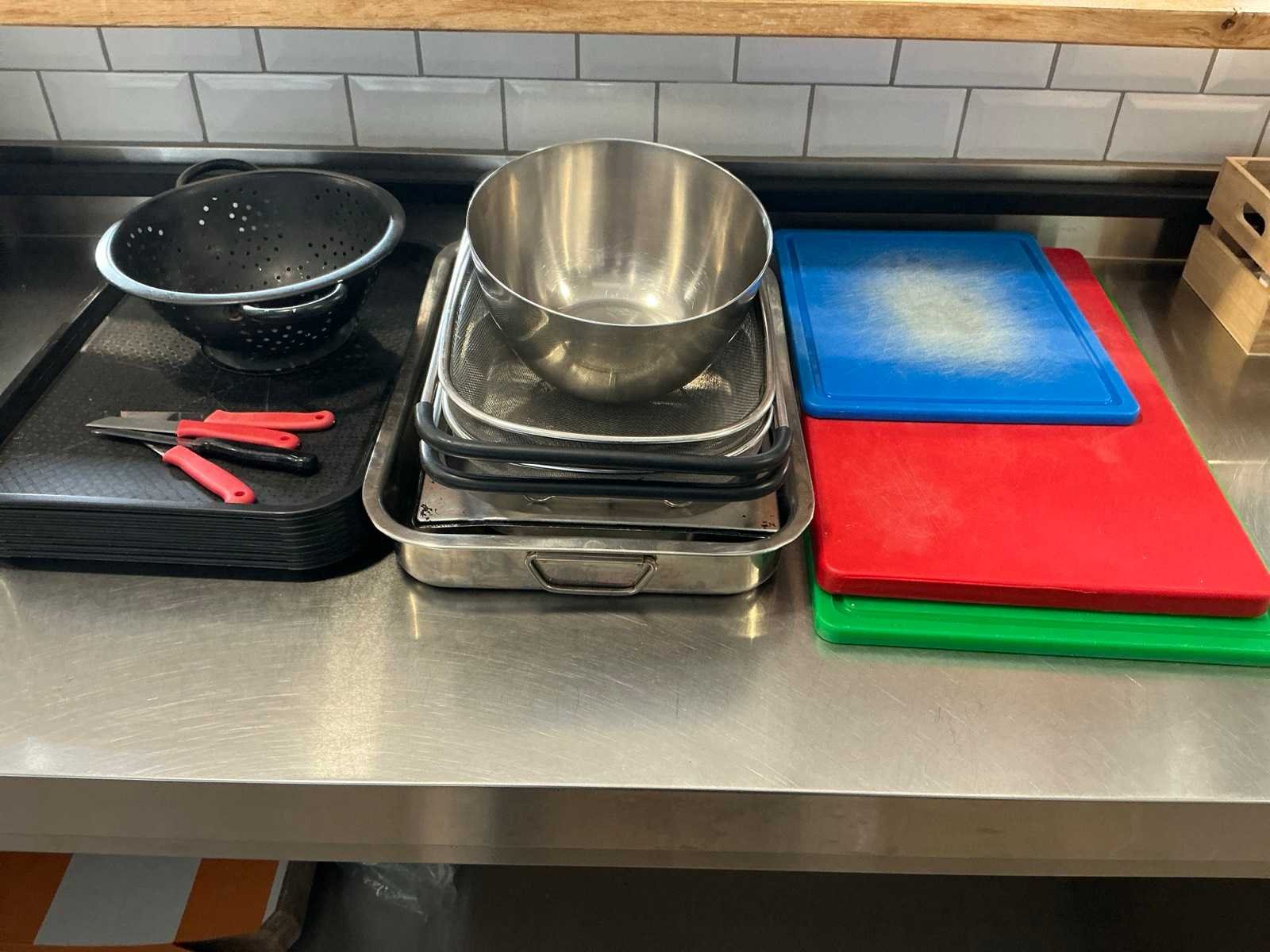 Waaronder bestaande uit: 3 diverse kunststof snijplanken, 2 rechthoekige zeven voorzien van inox frame, 2 diverse inox schalen compleet met inox mengkom, 8 kunststof dienbladen, 3 diverse metalen sausfleshouders waaronder getekend VANDEMOORTELE, enige diverse onderhoudsproducten en 1 draagbare radio Pulsar, Afgifte volgens aanwijzing Nee Model: Partij