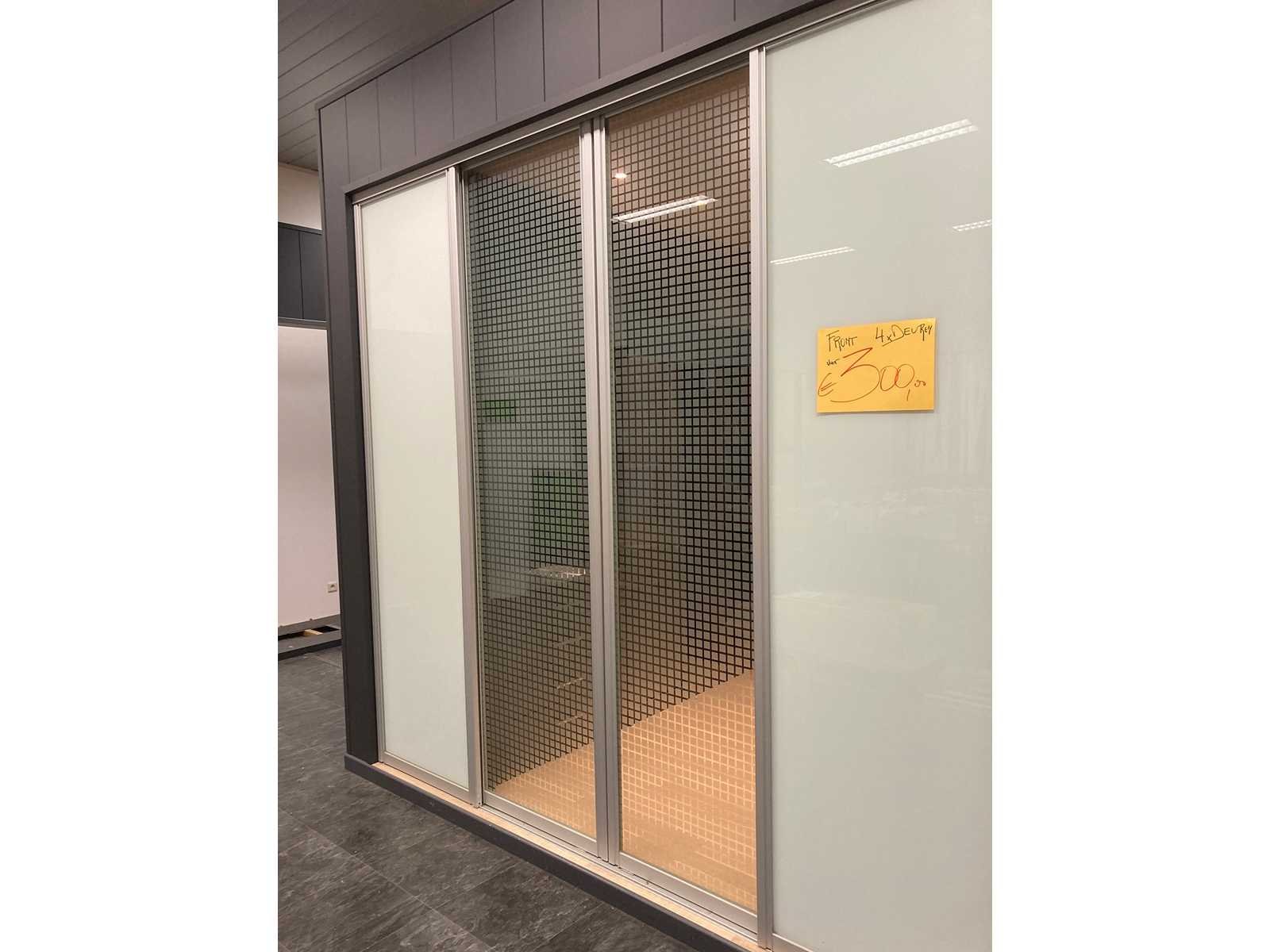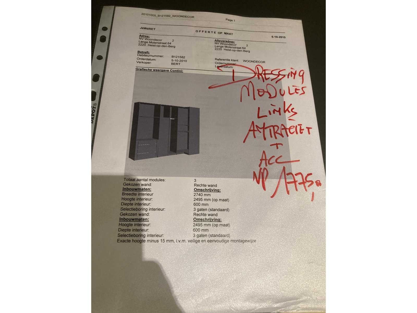 Presentatie blok met alle inhoud : (Blok is 300cm hoog, 373cm diep en 605cm breed) Inbouwkasten (dressings) en 23 schuifdeuren (zelf demonteren bij afhaling). Dressing 1 : B270xH245x66,5cm (inclusief deuren) Dressing 2 en 3 : D275xD101,5cmxH250cm (meer info op fotos) Deuren : B80xH238xD2of3cm (afhankelijk van de deur) => alles zélf demonteren bij ophaling! Nee