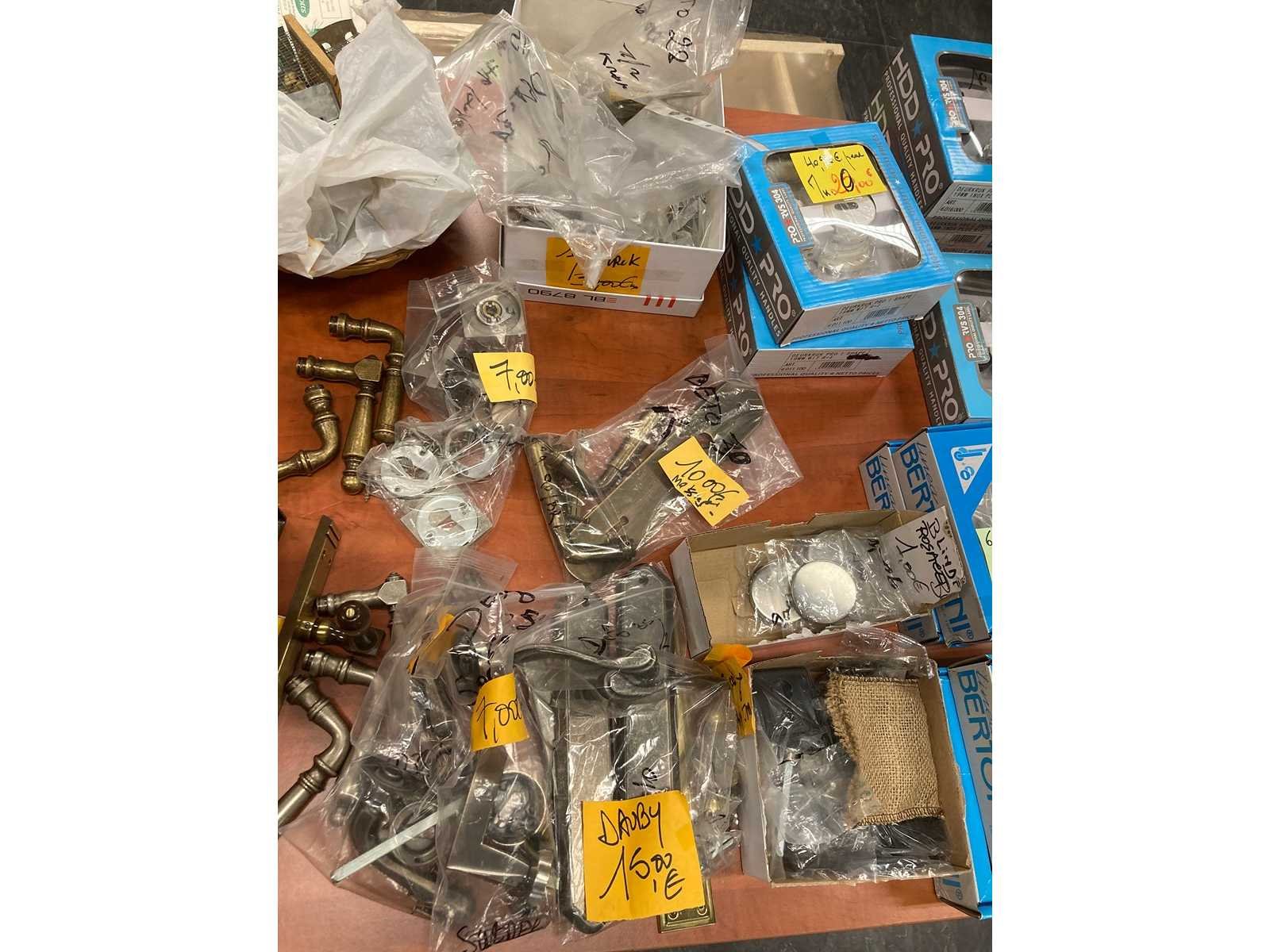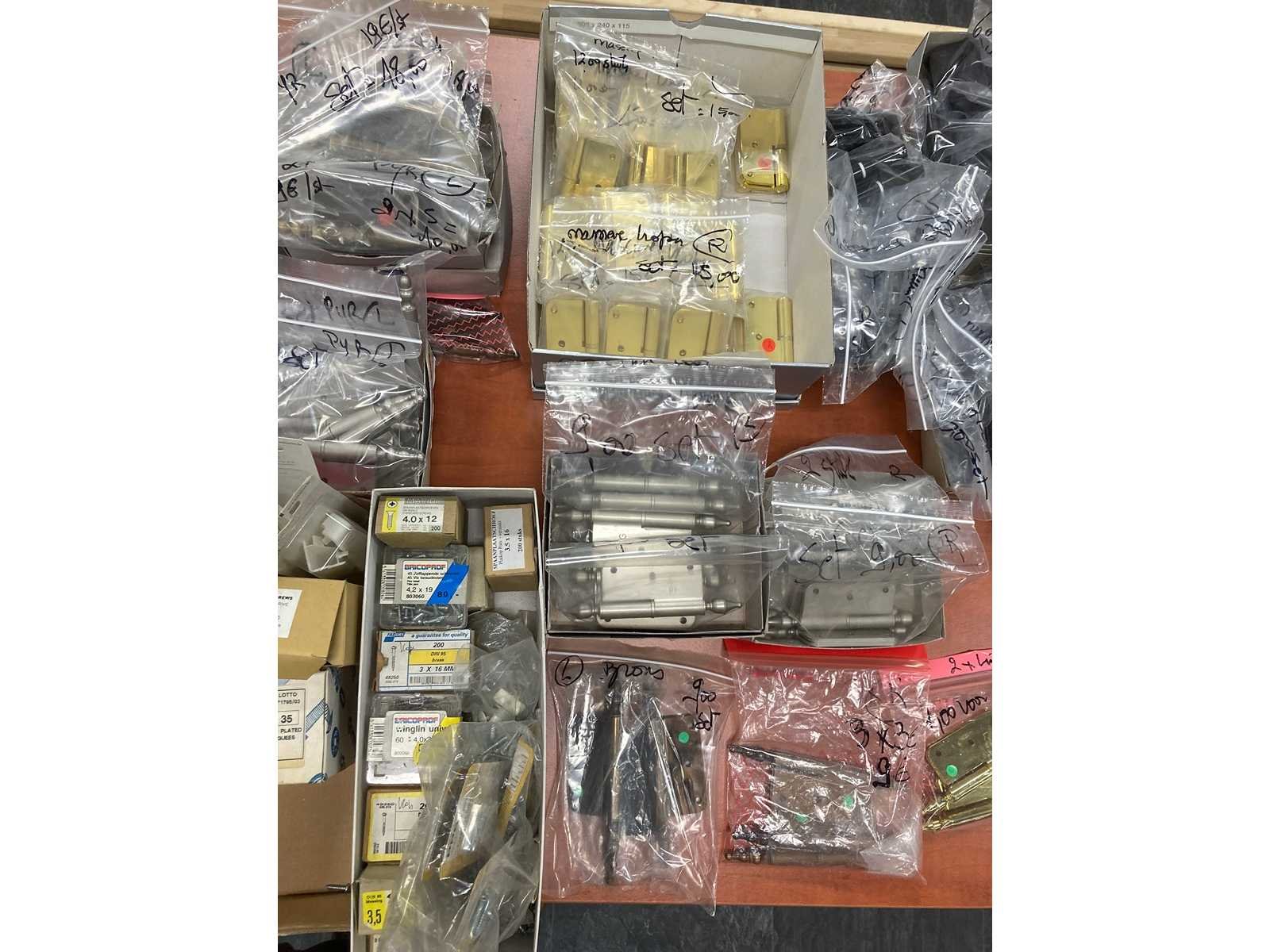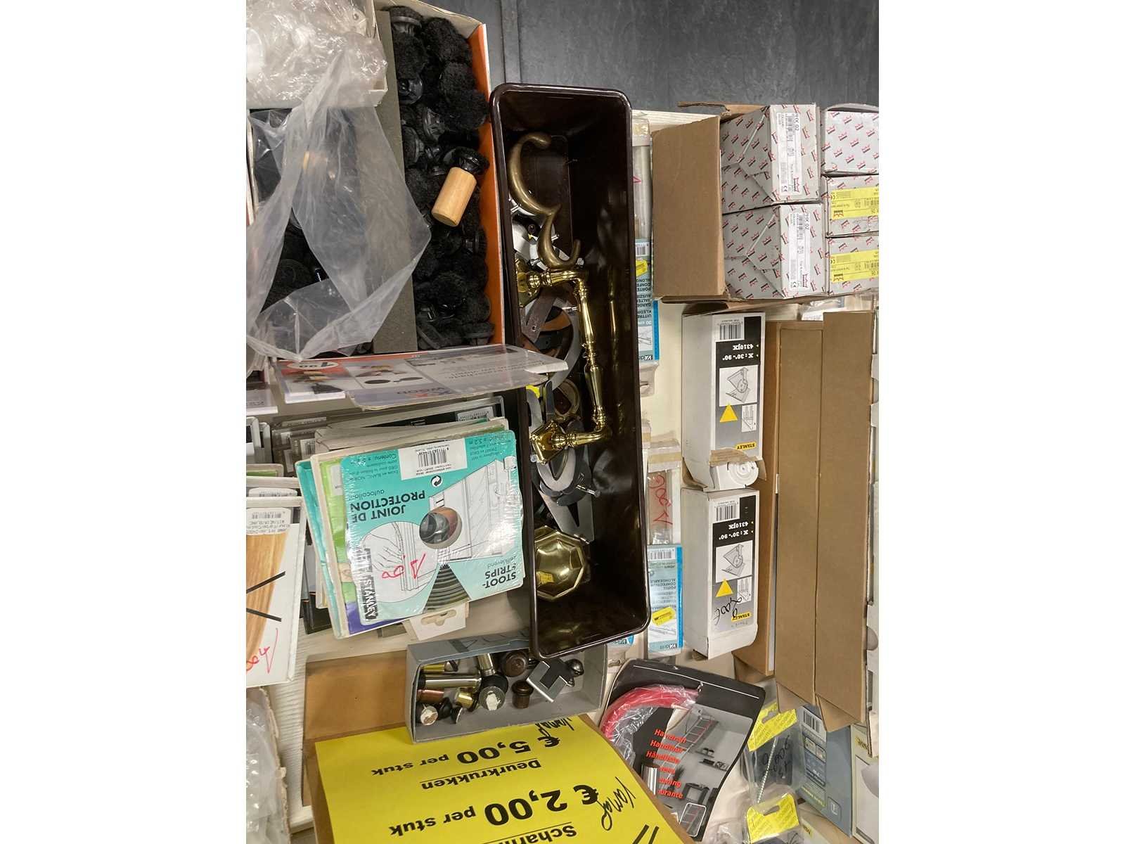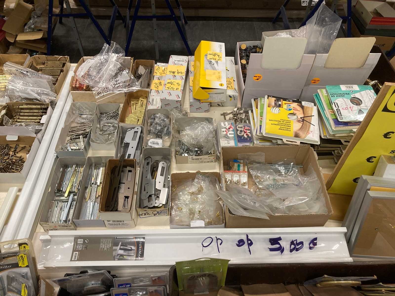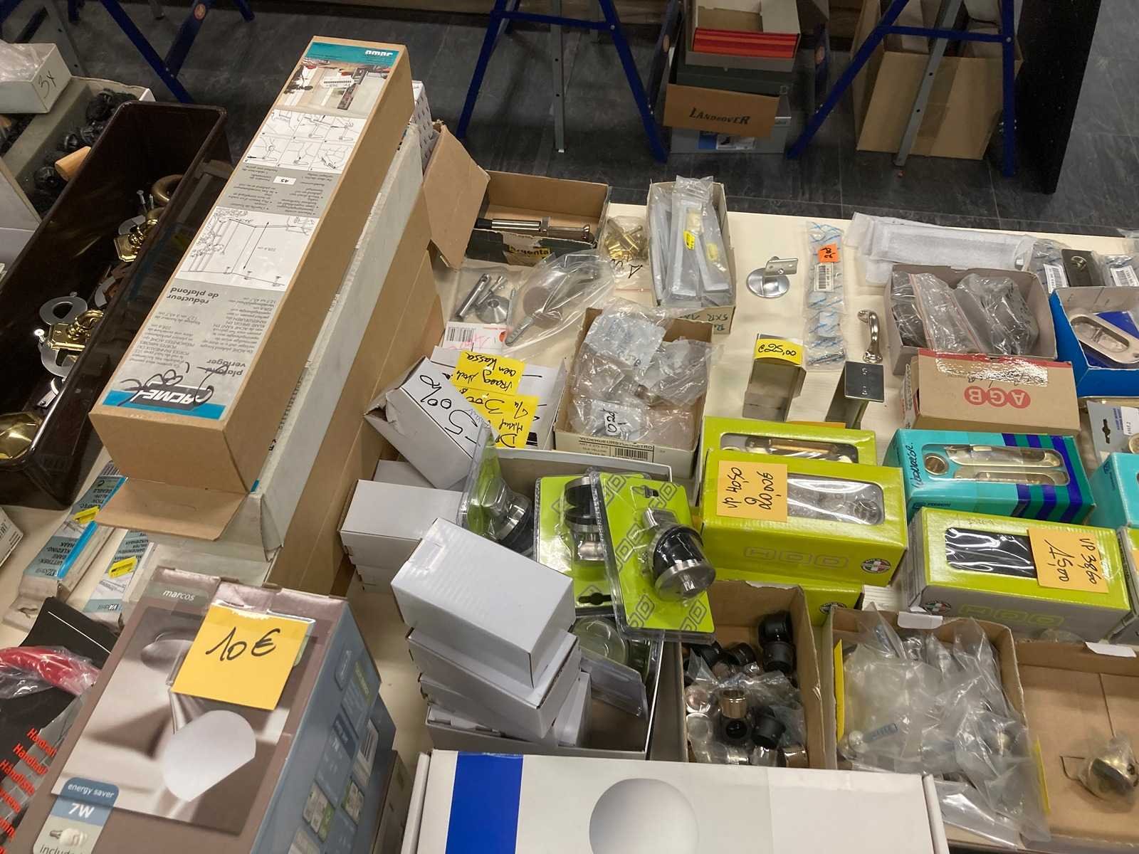 Partij scharnieren, klinken, deursloten, deurklinken, lampen, watergoten schuurmiddelen, enzovoorts (zie fotos). Tafels zijn inbegrepen. Nee