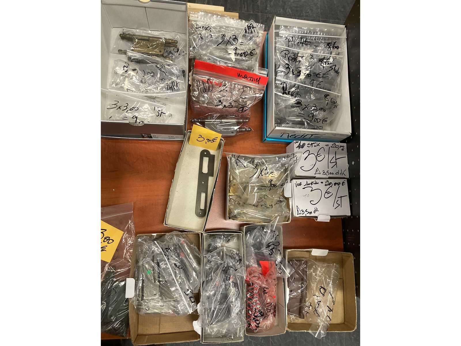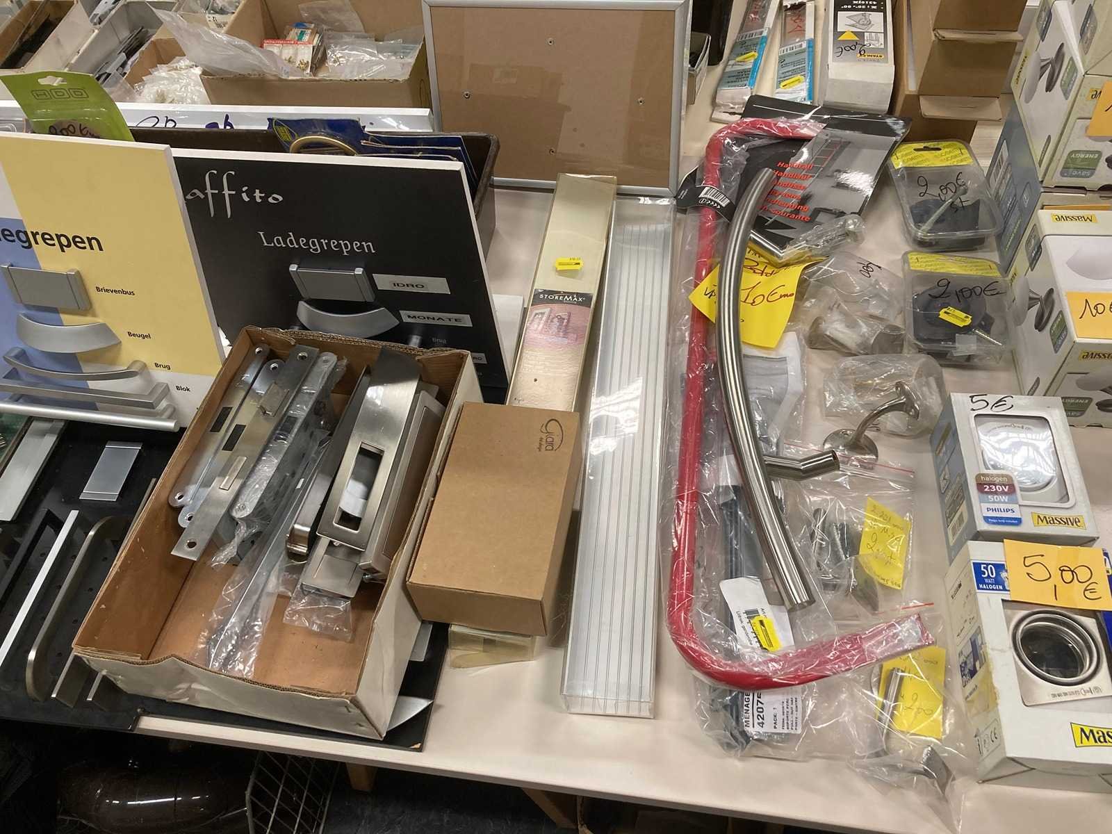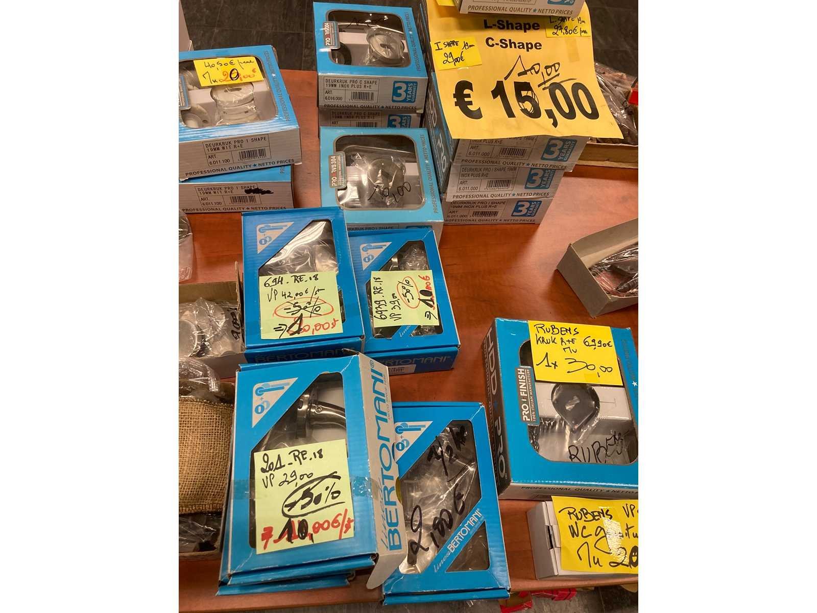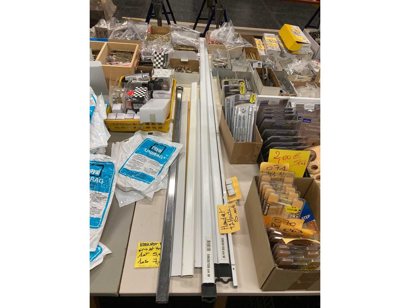 Partij scharnieren, klinken, deursloten, deurklinken, lampen, watergoten schuurmiddelen, enzovoorts (zie fotos). Tafels zijn inbegrepen. Nee