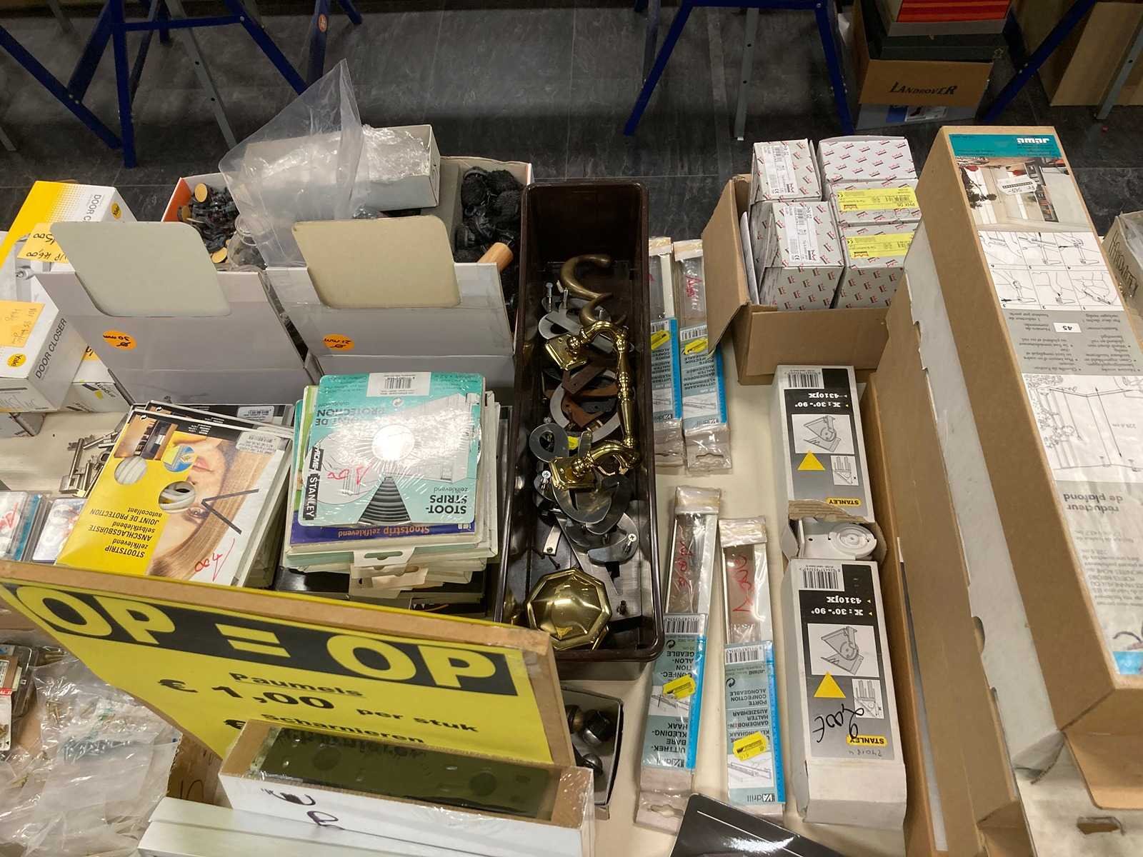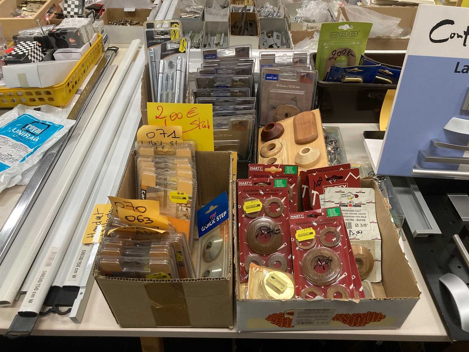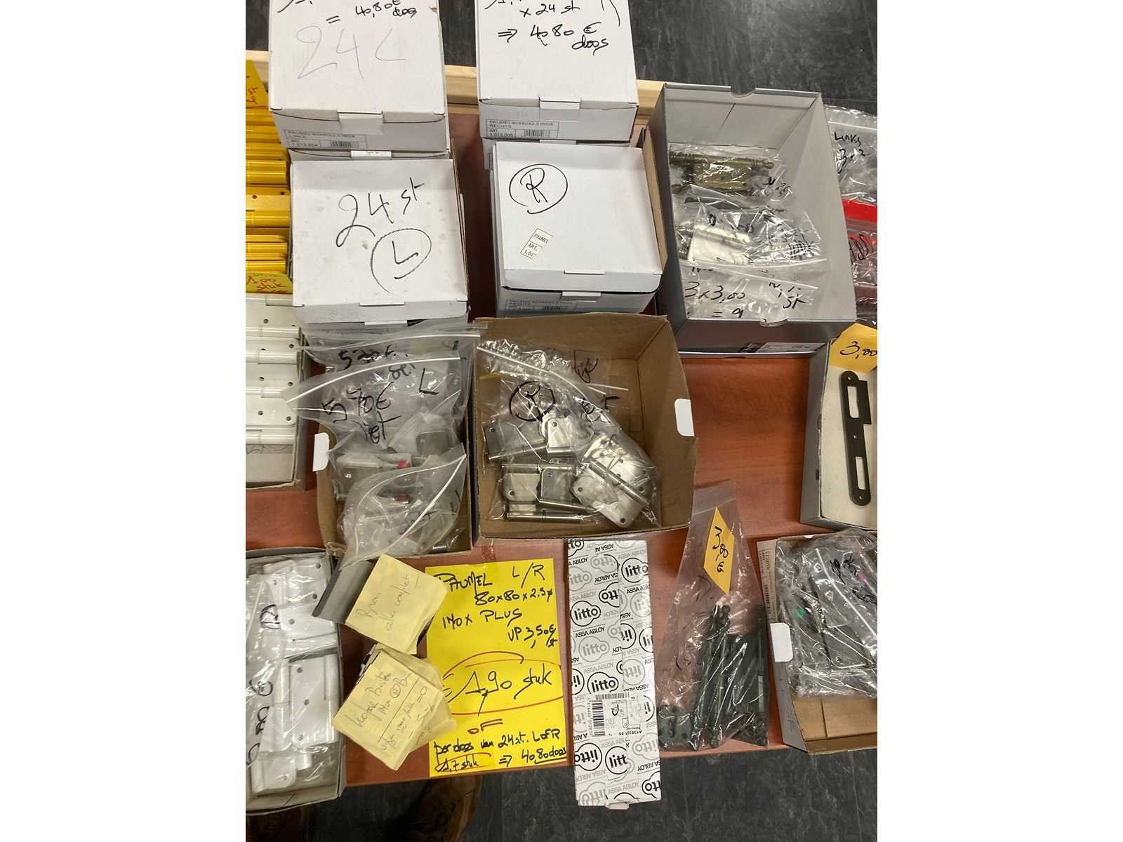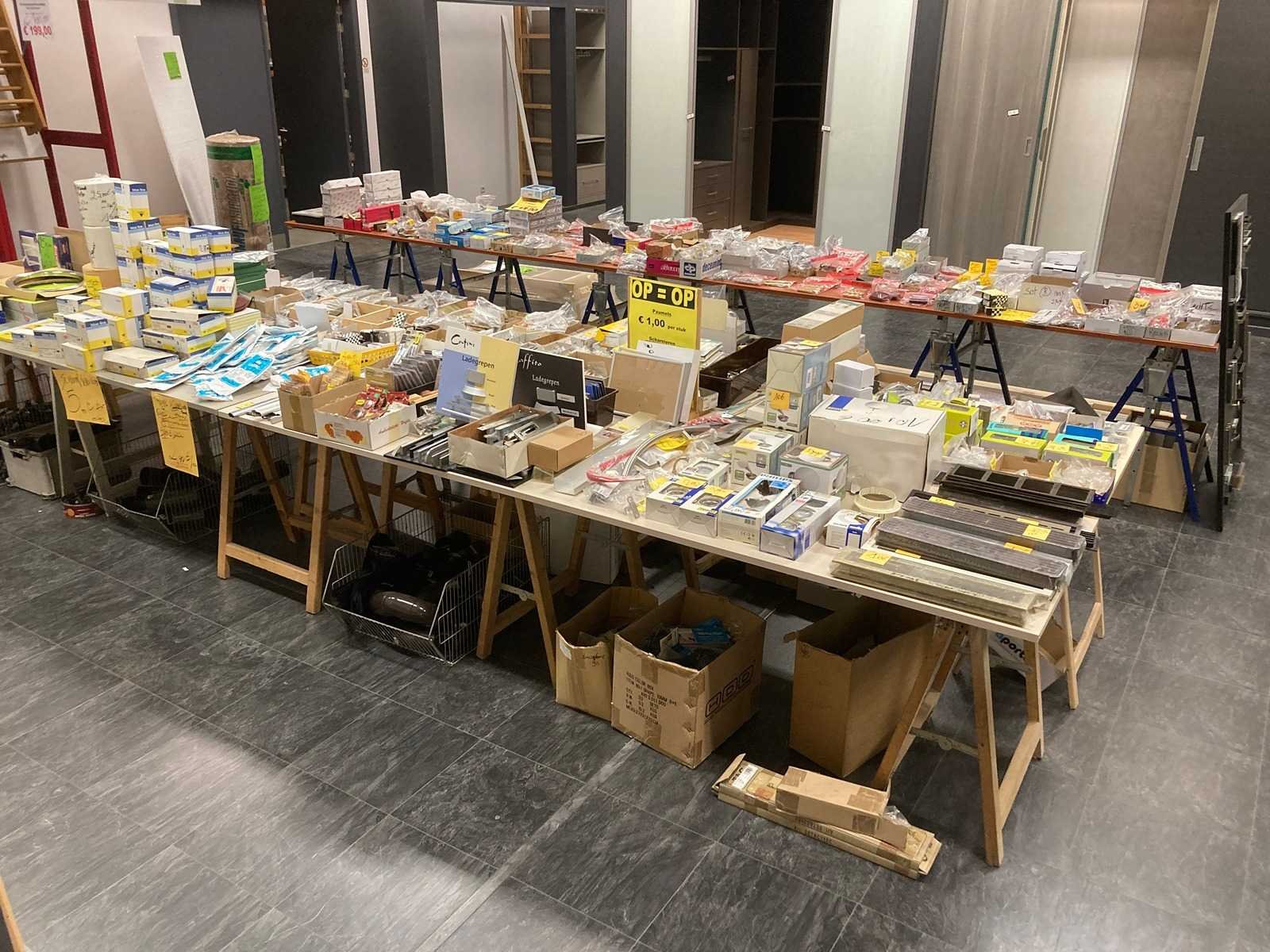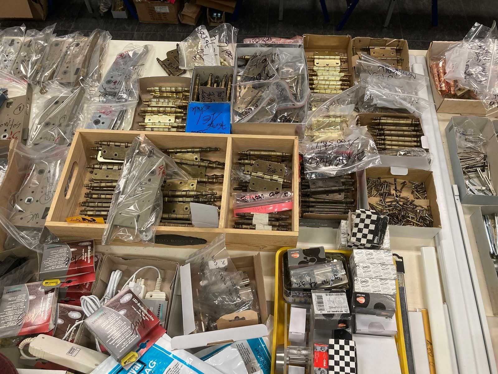 Partij scharnieren, klinken, deursloten, deurklinken, lampen, watergoten schuurmiddelen, enzovoorts (zie fotos). Tafels zijn inbegrepen. Nee