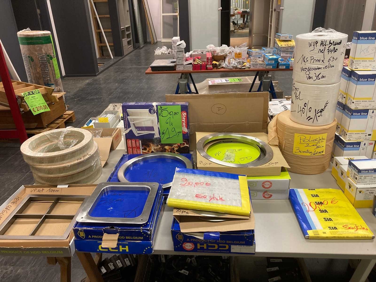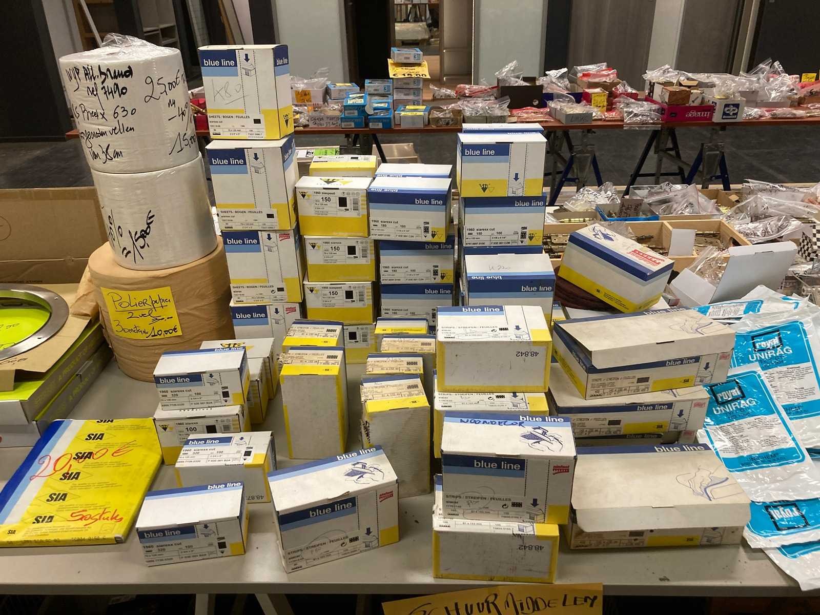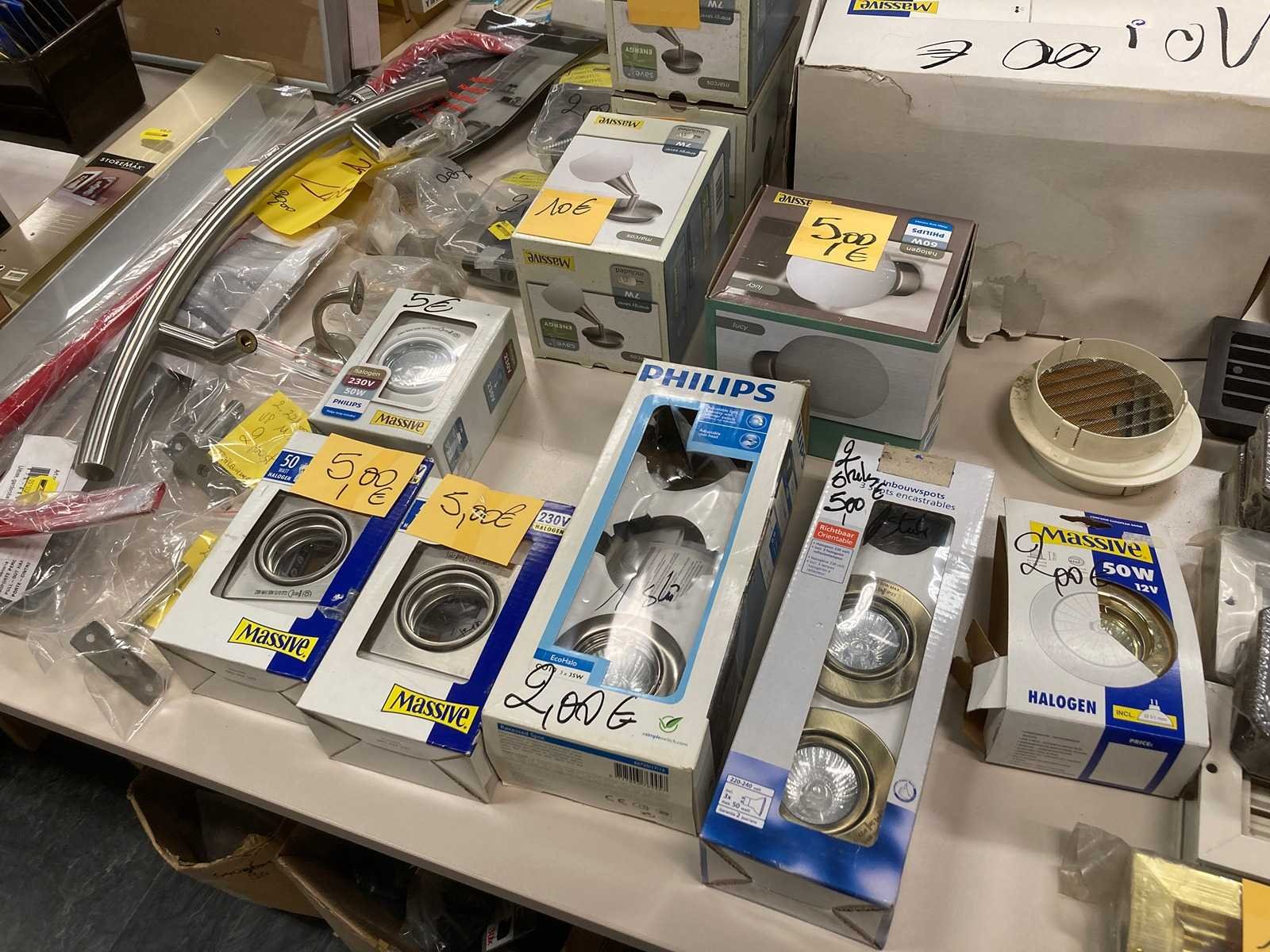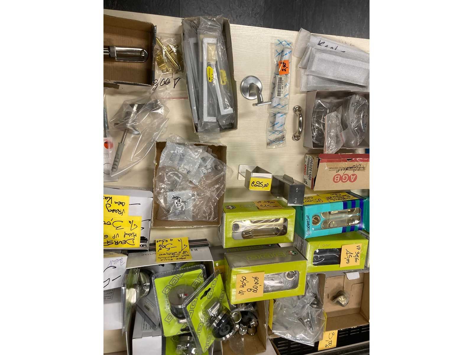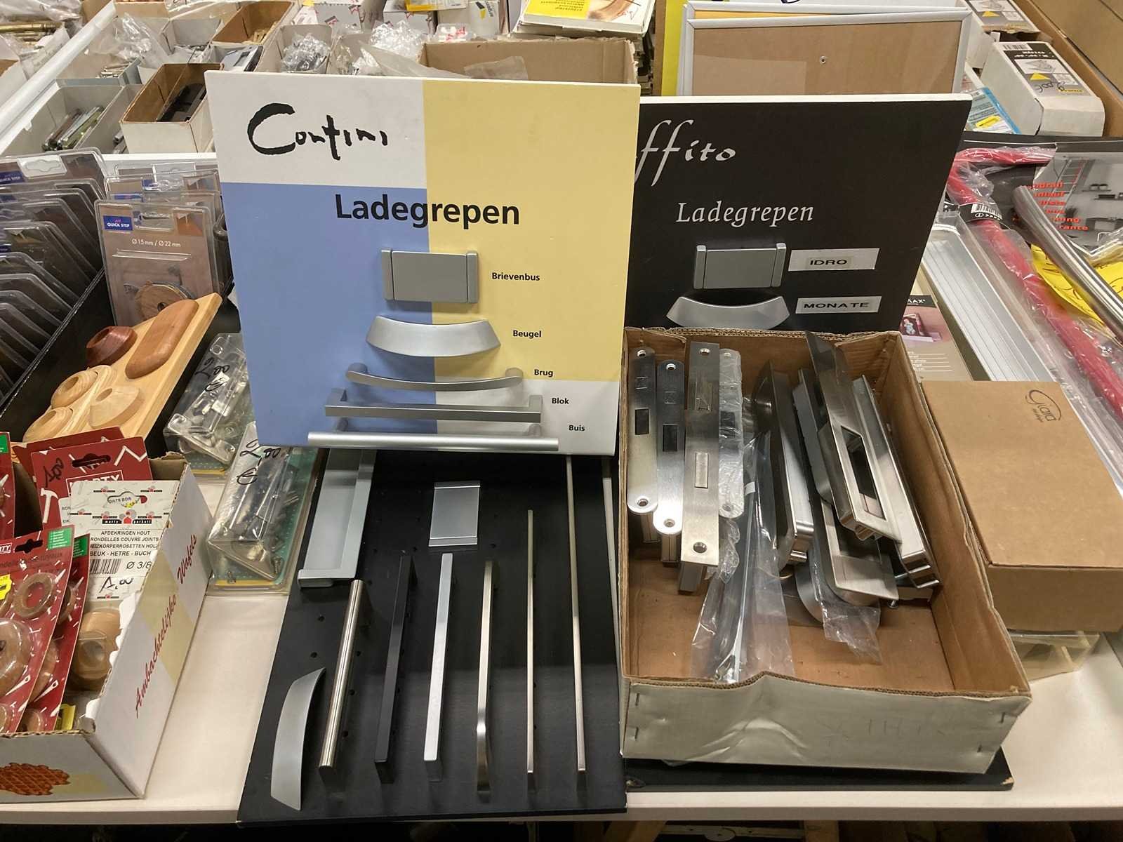 Partij scharnieren, klinken, deursloten, deurklinken, lampen, watergoten schuurmiddelen, enzovoorts (zie fotos). Tafels zijn inbegrepen. Nee