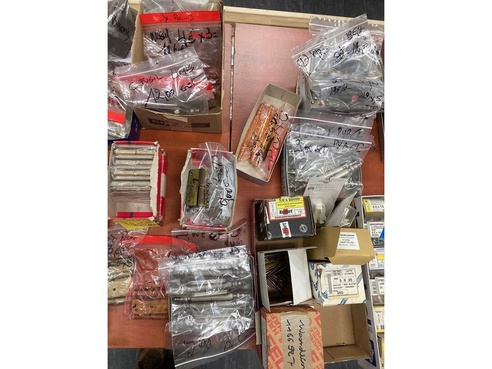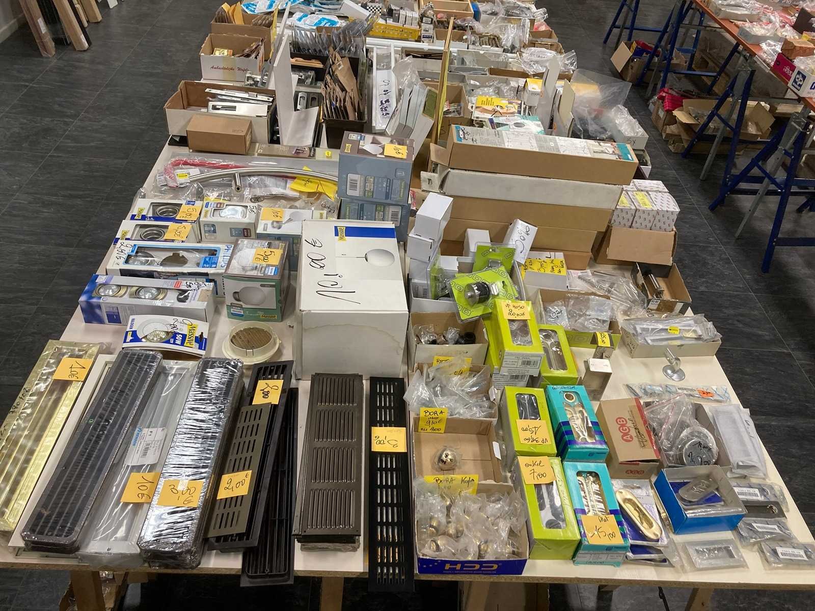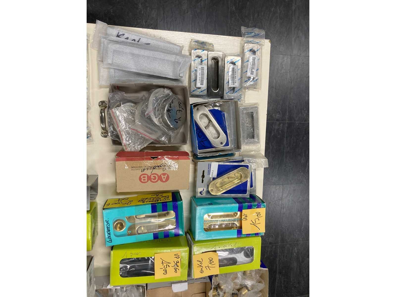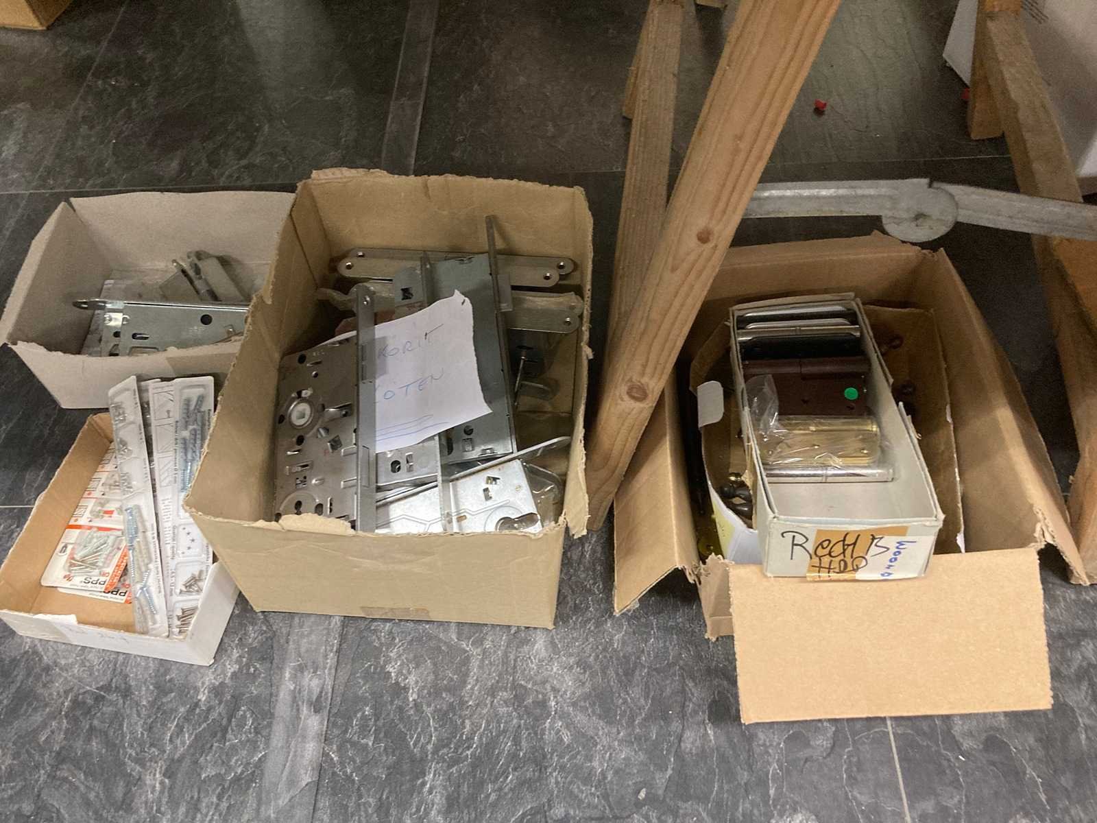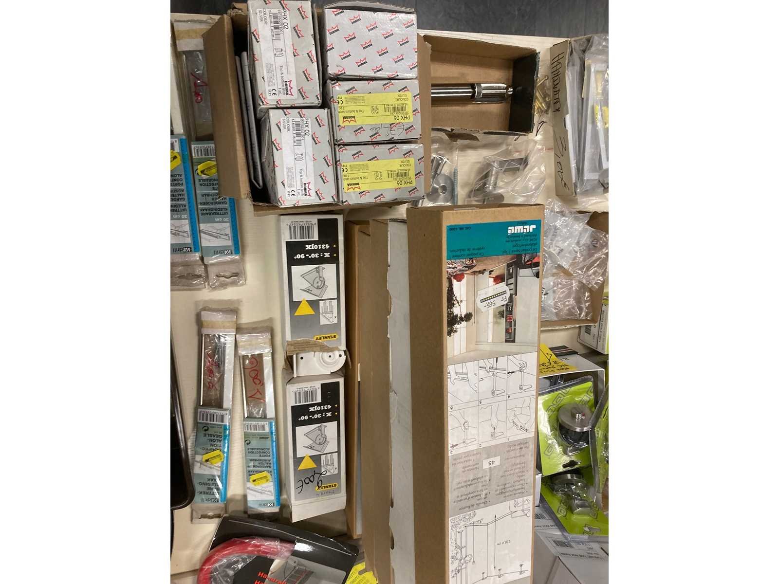 Partij scharnieren, klinken, deursloten, deurklinken, lampen, watergoten schuurmiddelen, enzovoorts (zie fotos). Tafels zijn inbegrepen. Nee