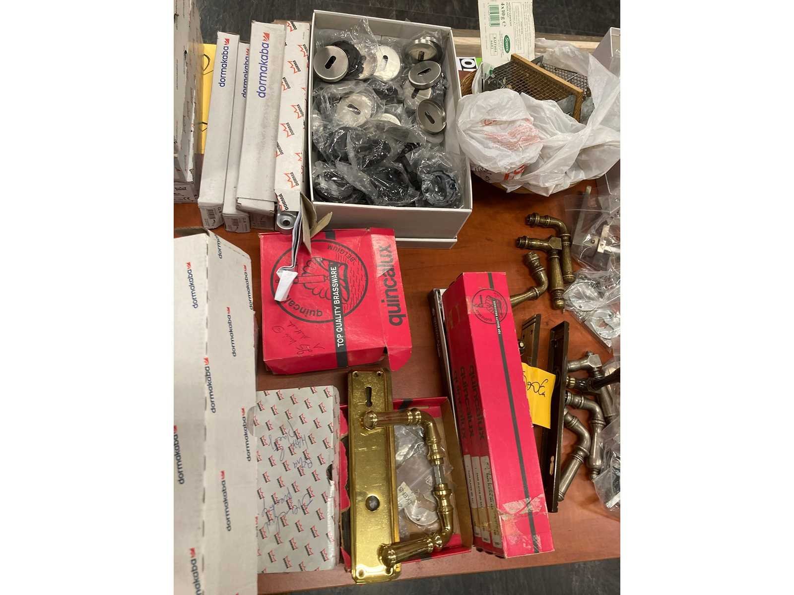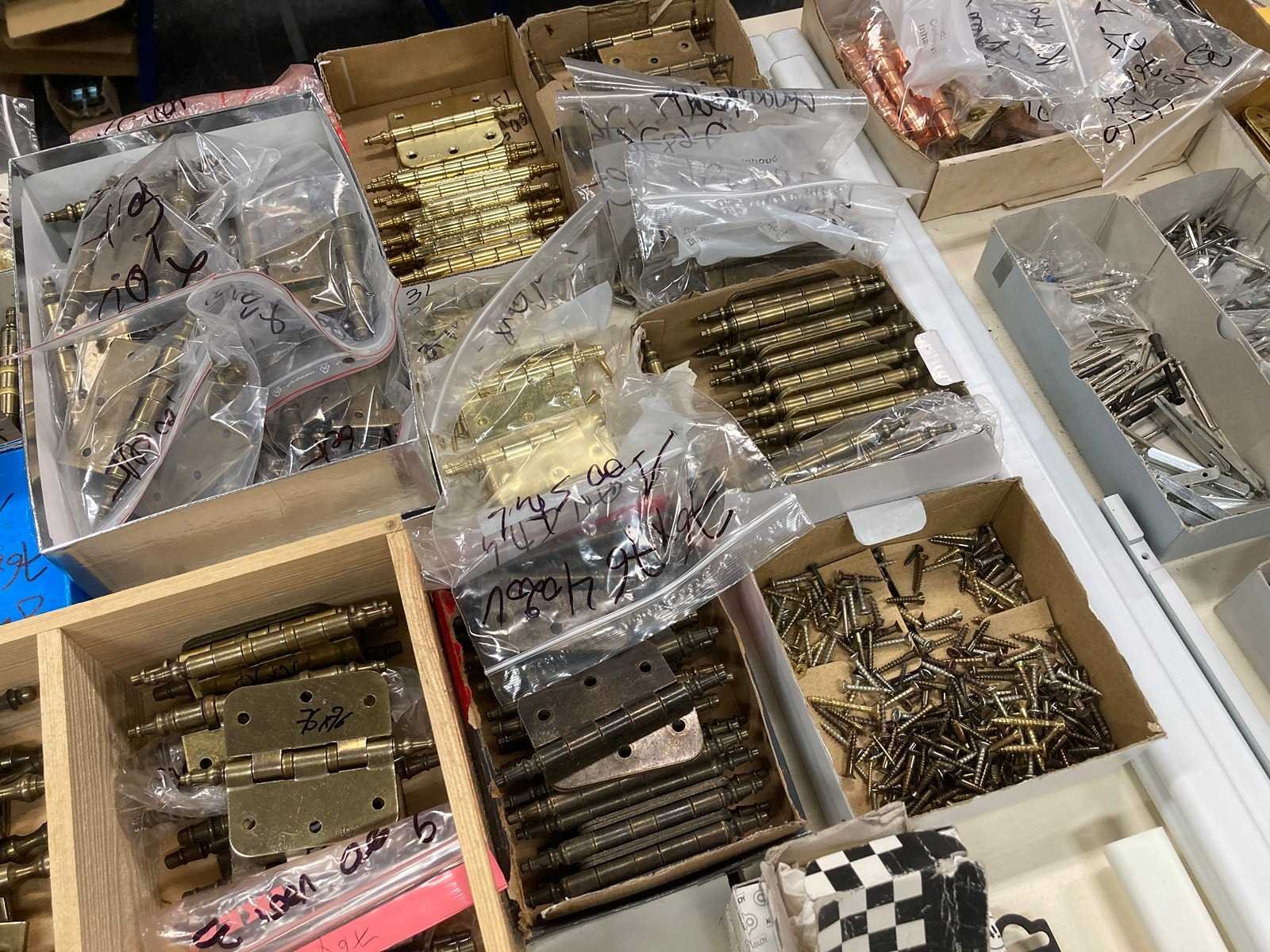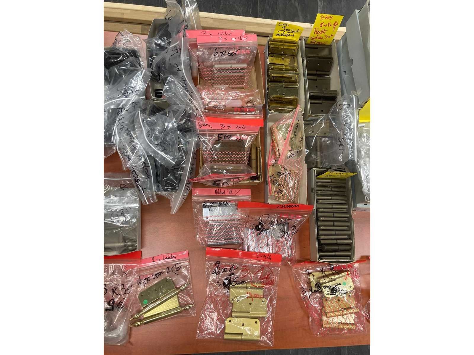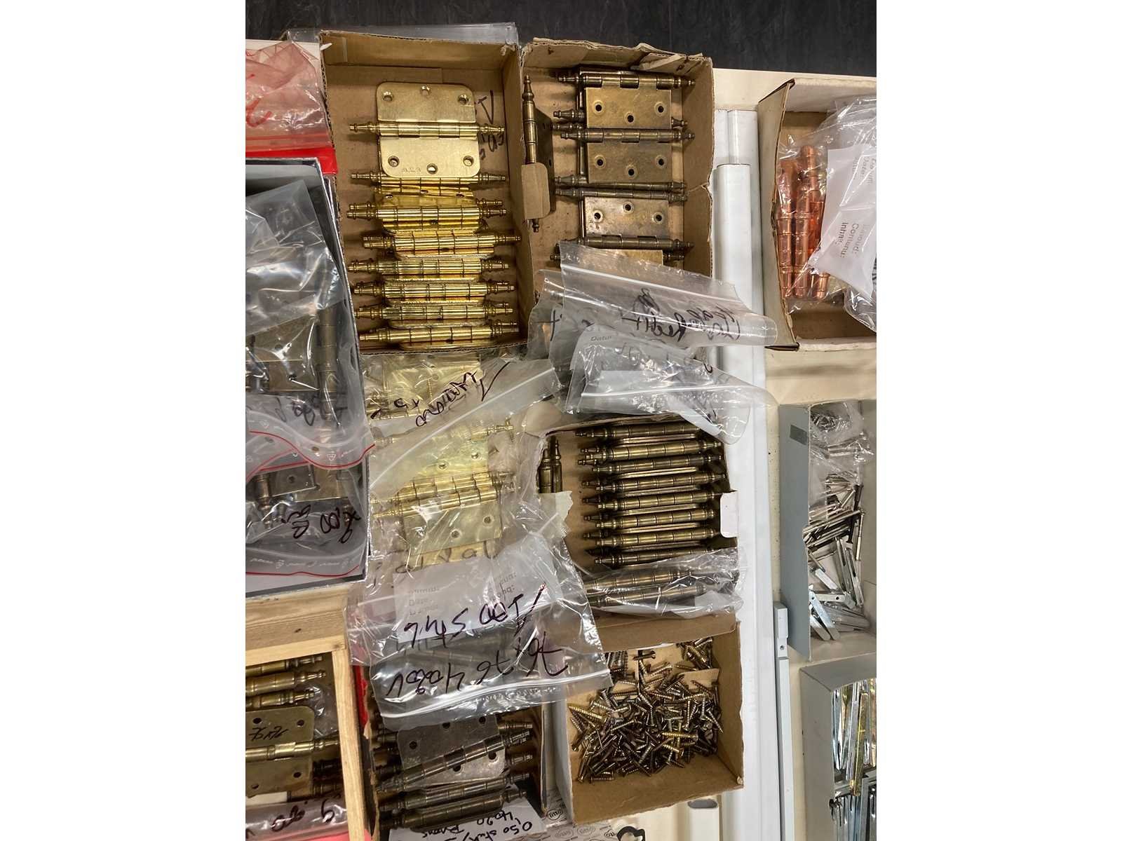 Partij scharnieren, klinken, deursloten, deurklinken, lampen, watergoten schuurmiddelen, enzovoorts (zie fotos). Tafels zijn inbegrepen. Nee