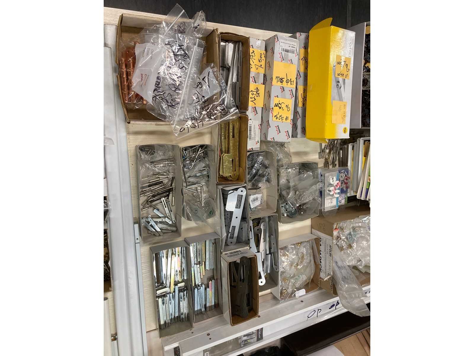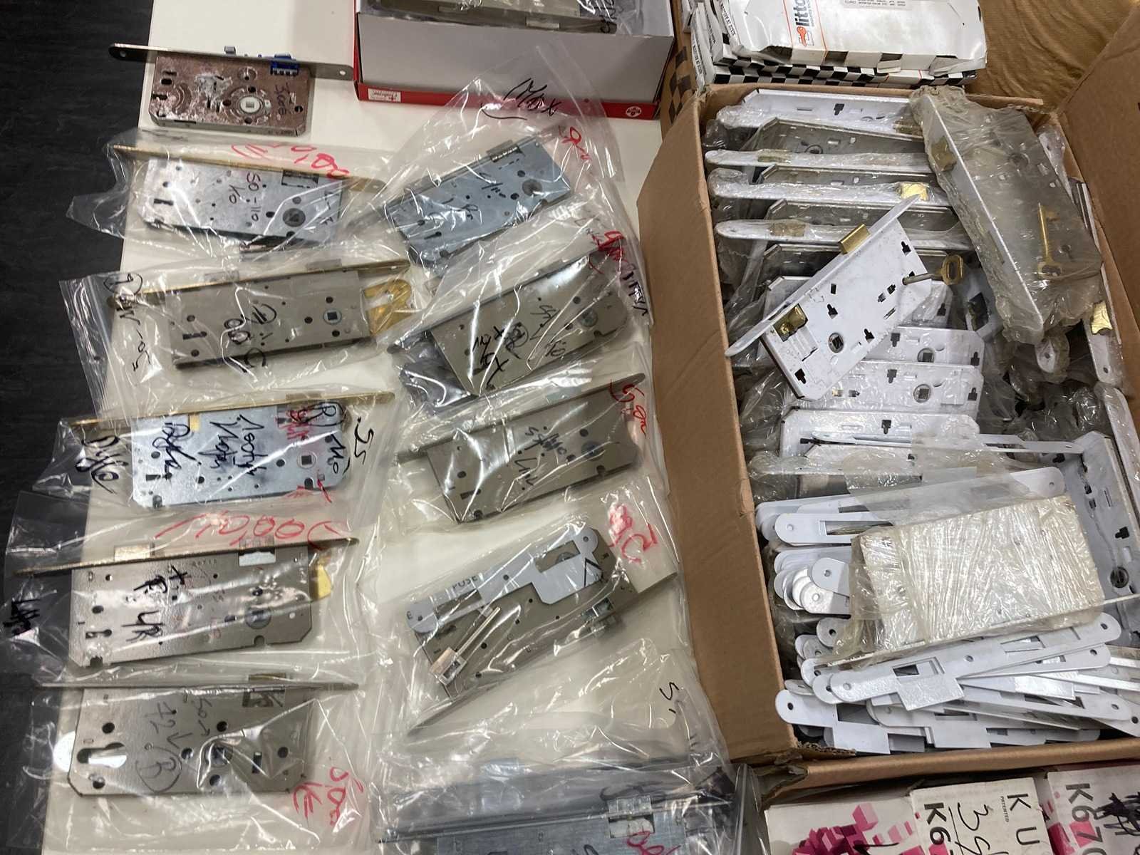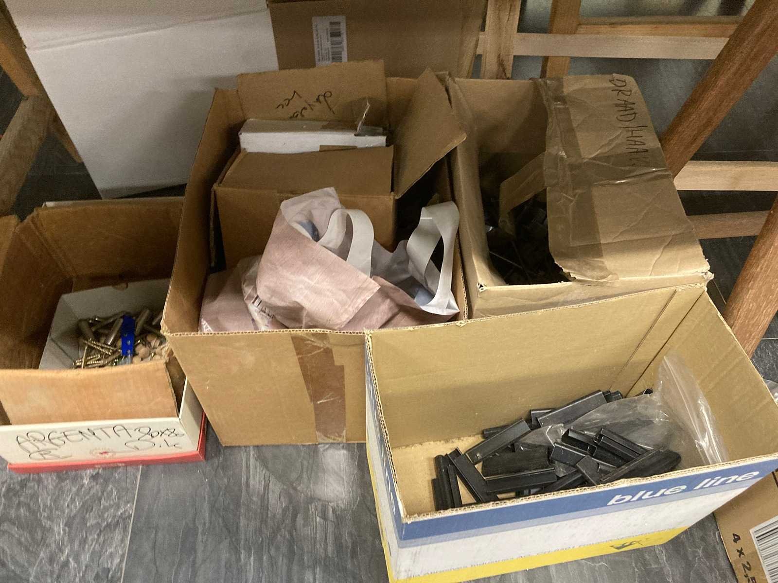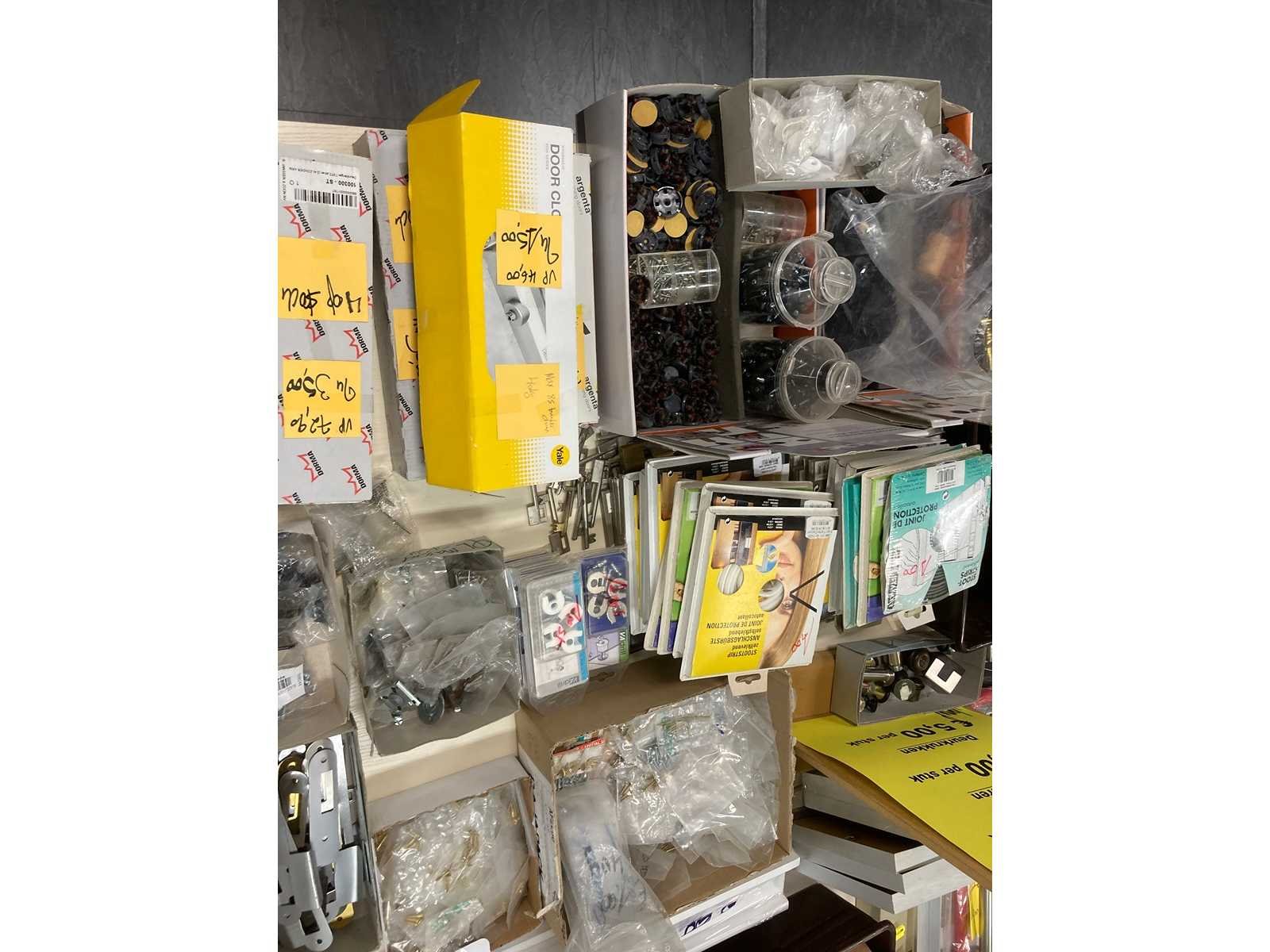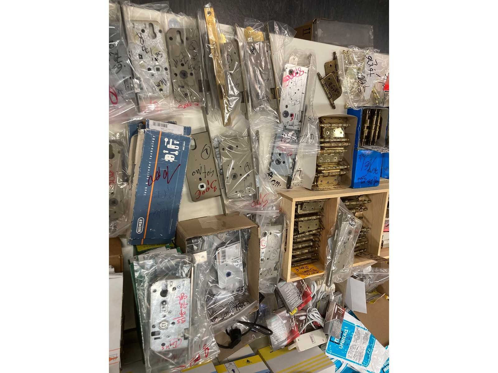 Partij scharnieren, klinken, deursloten, deurklinken, lampen, watergoten schuurmiddelen, enzovoorts (zie fotos). Tafels zijn inbegrepen. Nee
