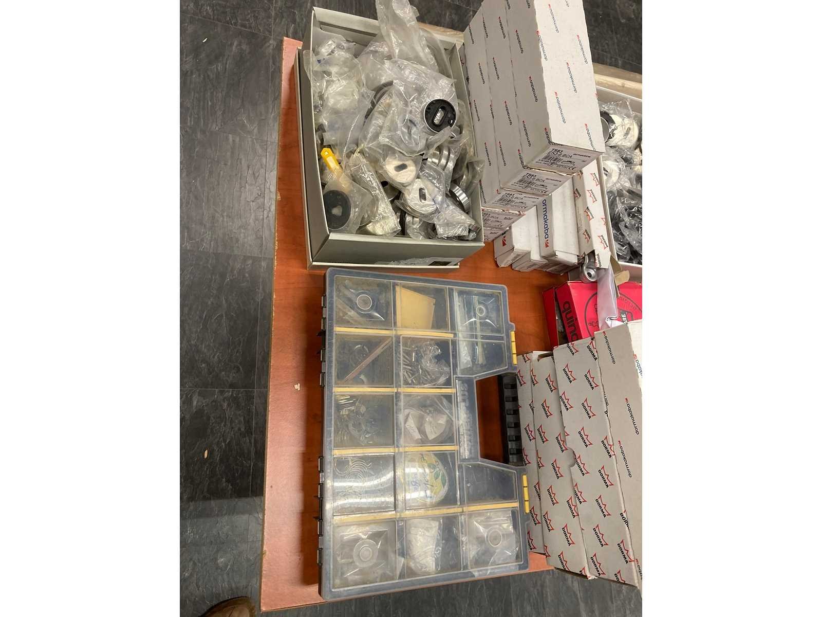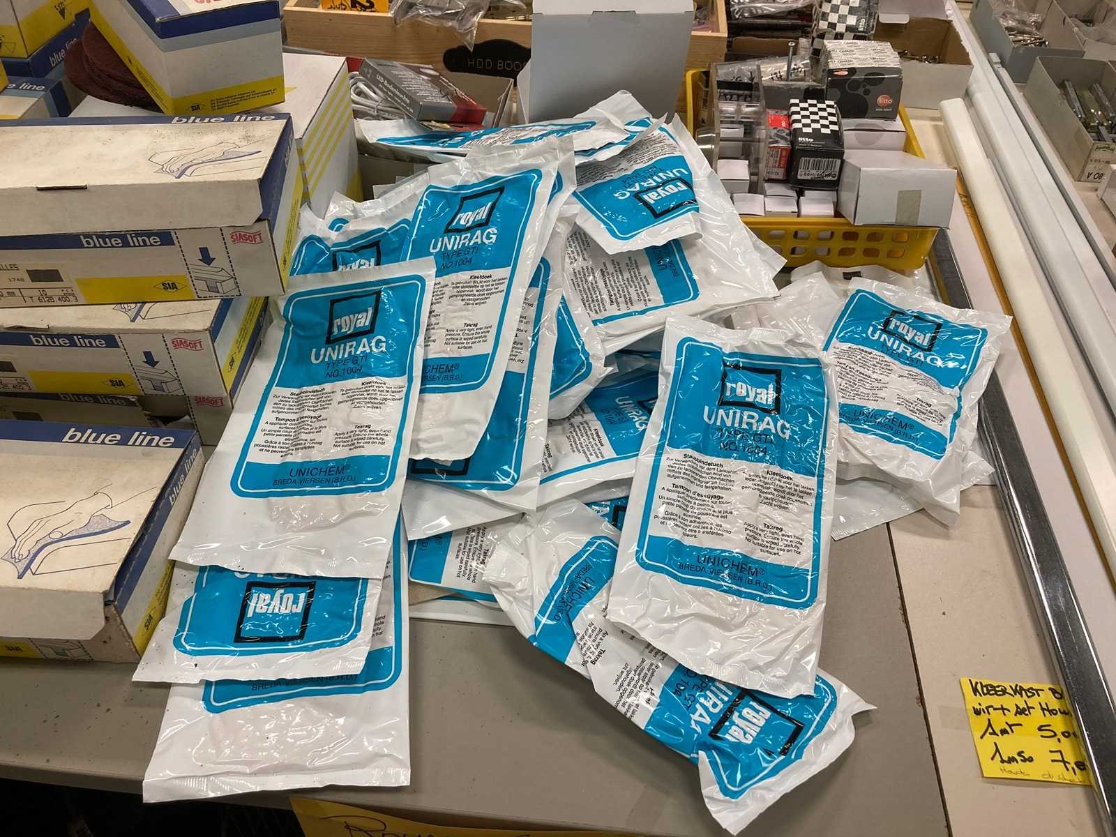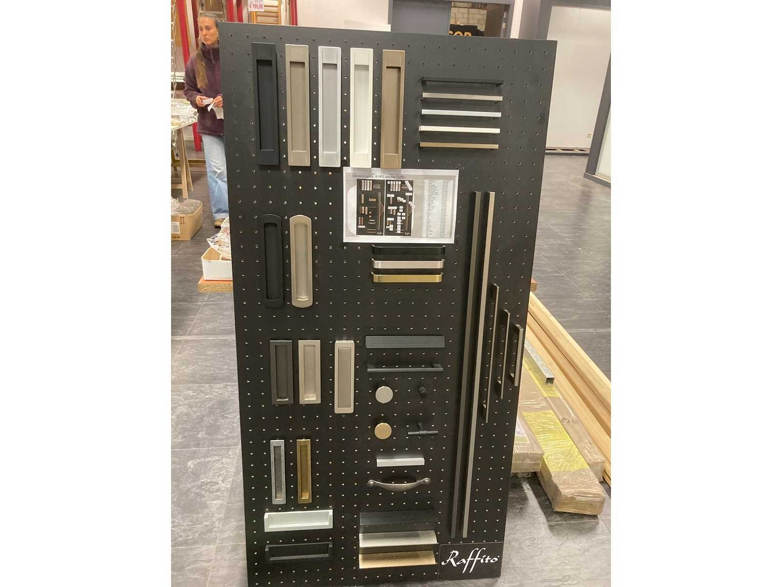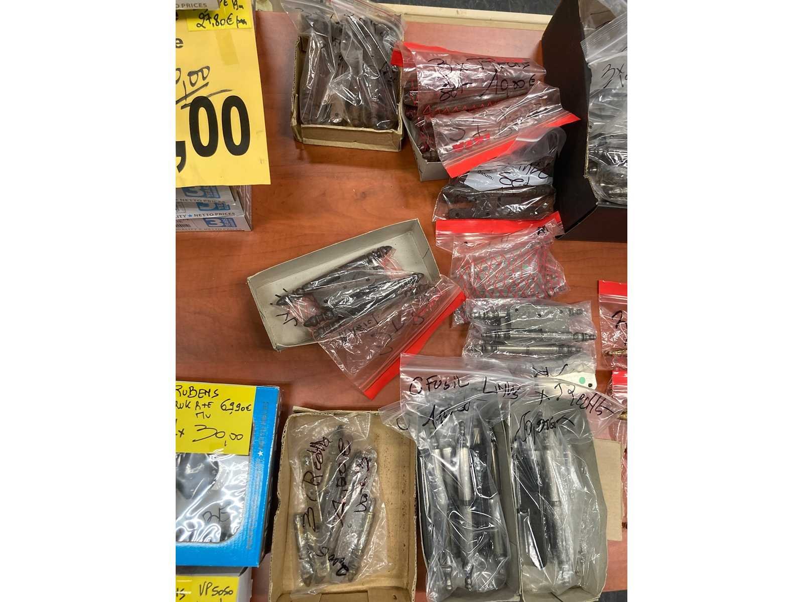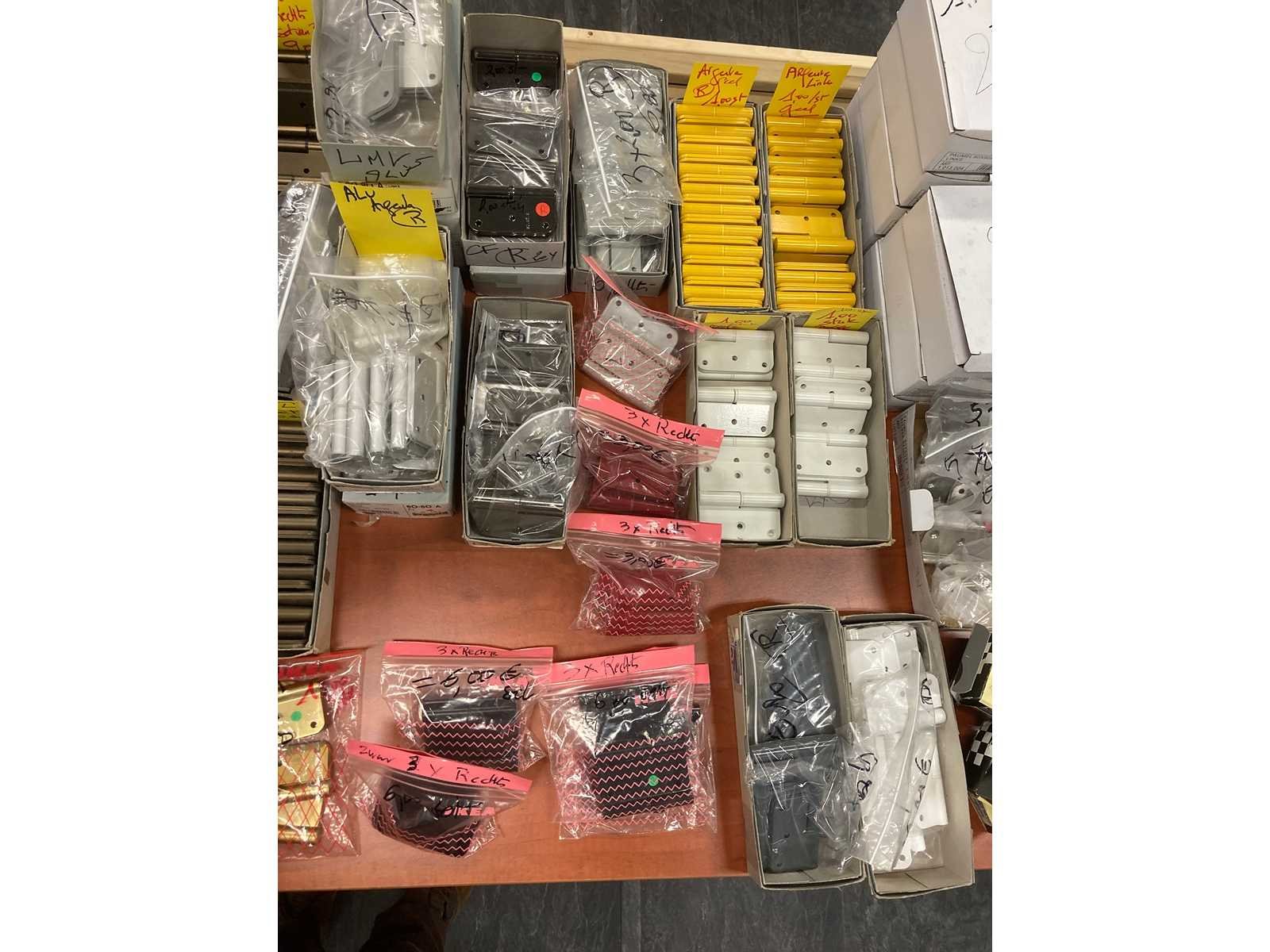 Partij scharnieren, klinken, deursloten, deurklinken, lampen, watergoten schuurmiddelen, enzovoorts (zie fotos). Tafels zijn inbegrepen. Nee