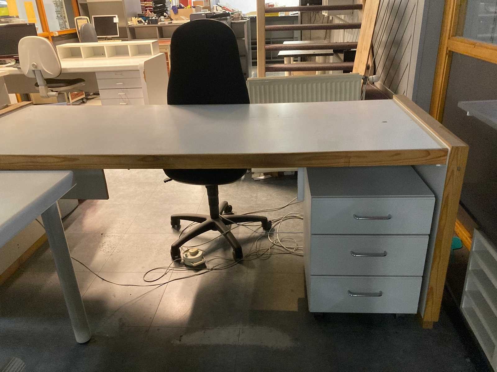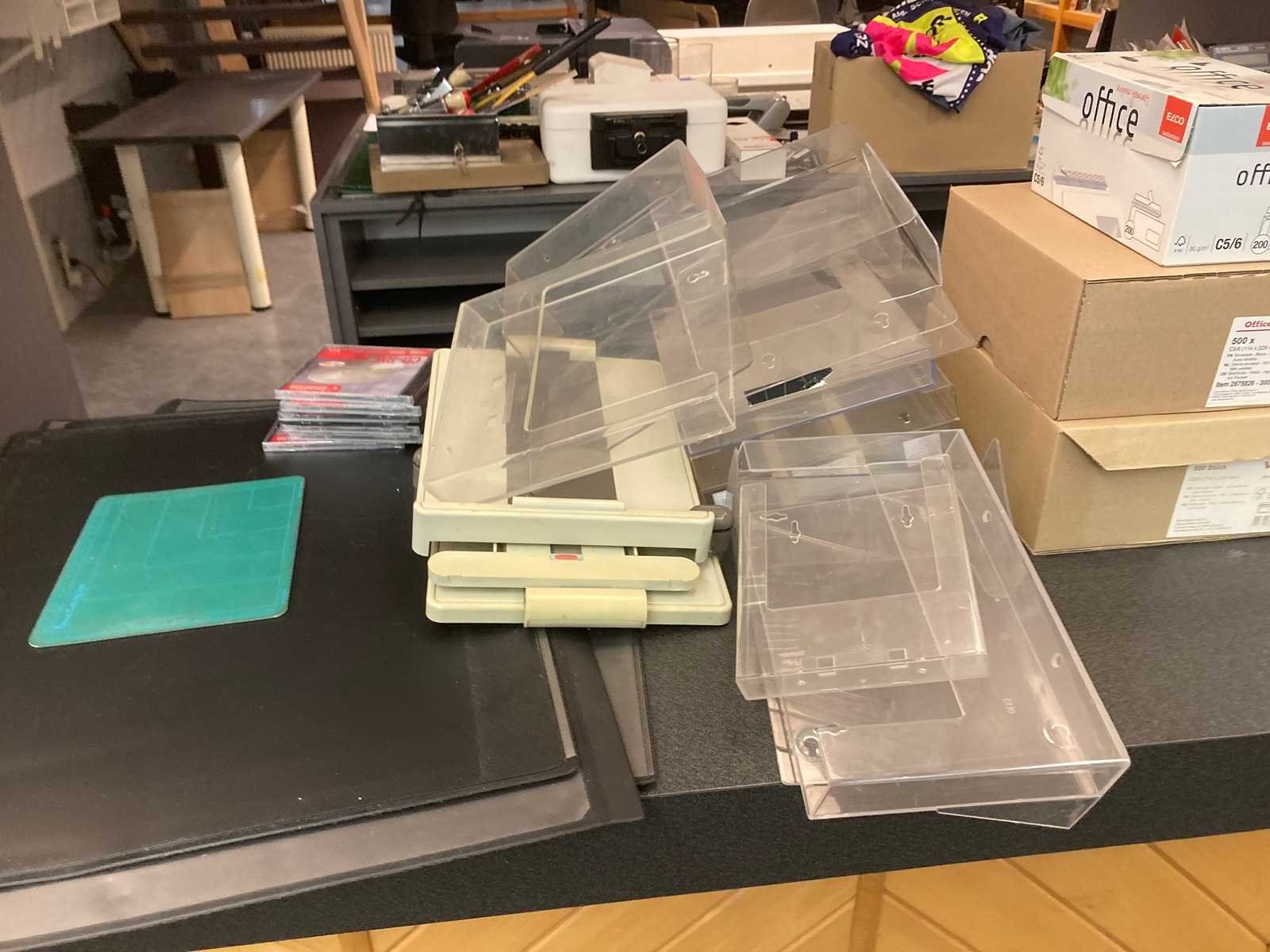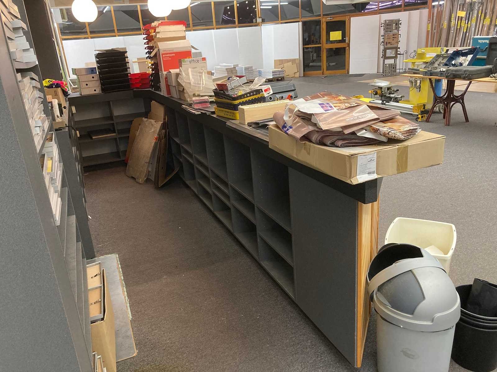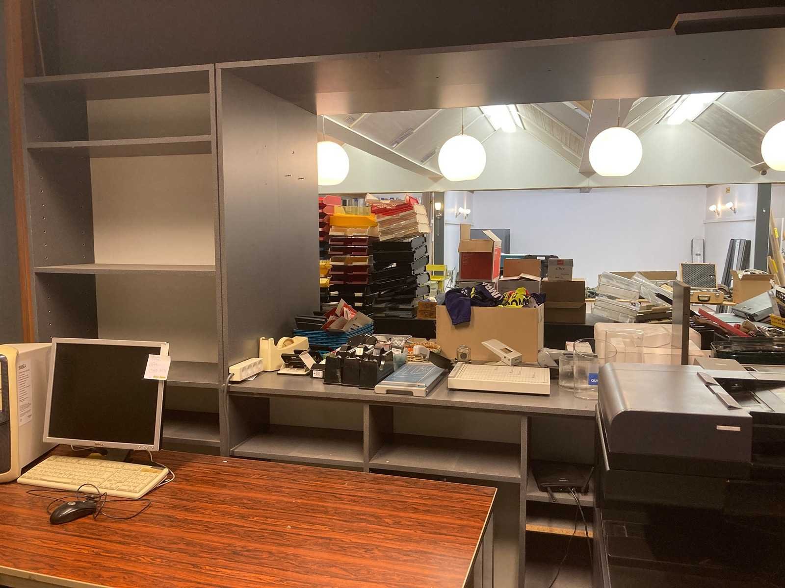2x inkombalie 1x wand open kast systeem met planken 15 hanglampen, 1 bureaulamp, 6 bureaus met bijhorende kasten, 6 bureaustoelen, 3 computers, 6 schermen, 1 grote Kyocera printer, 1 radio, 1 kassa, 2 kleinere Brother printers, en bureaumateriaal (zie fotos) Inkombalie 1 (met korte hoek en kasten achter gebouwd): B520xD60(met hoek160)xH100cm Inkombalie 2 (grote hoek balie) : 1 kant is L460xD60xH100cm / Andere kant is L340cmxD60xH100cm => alles zélf demonteren bij ophaling! Nee