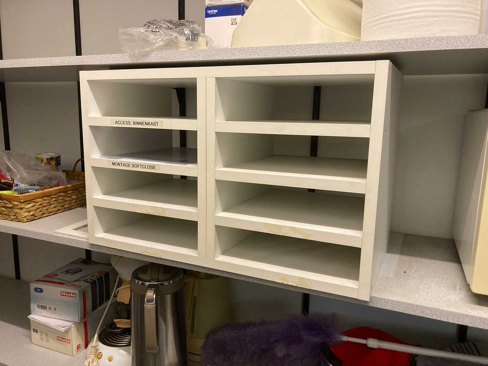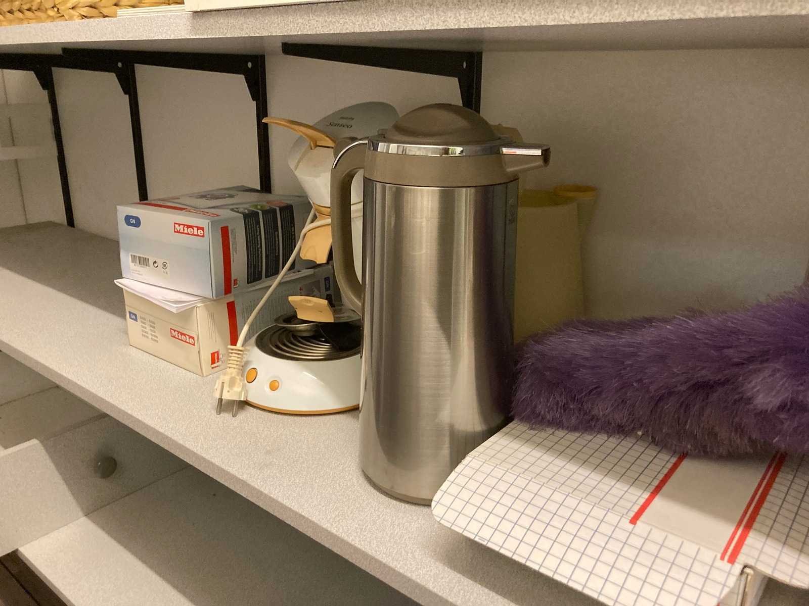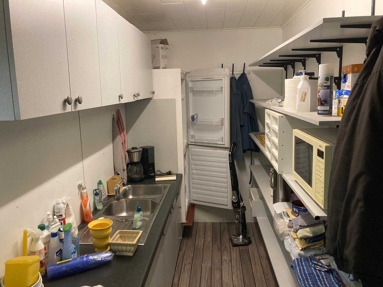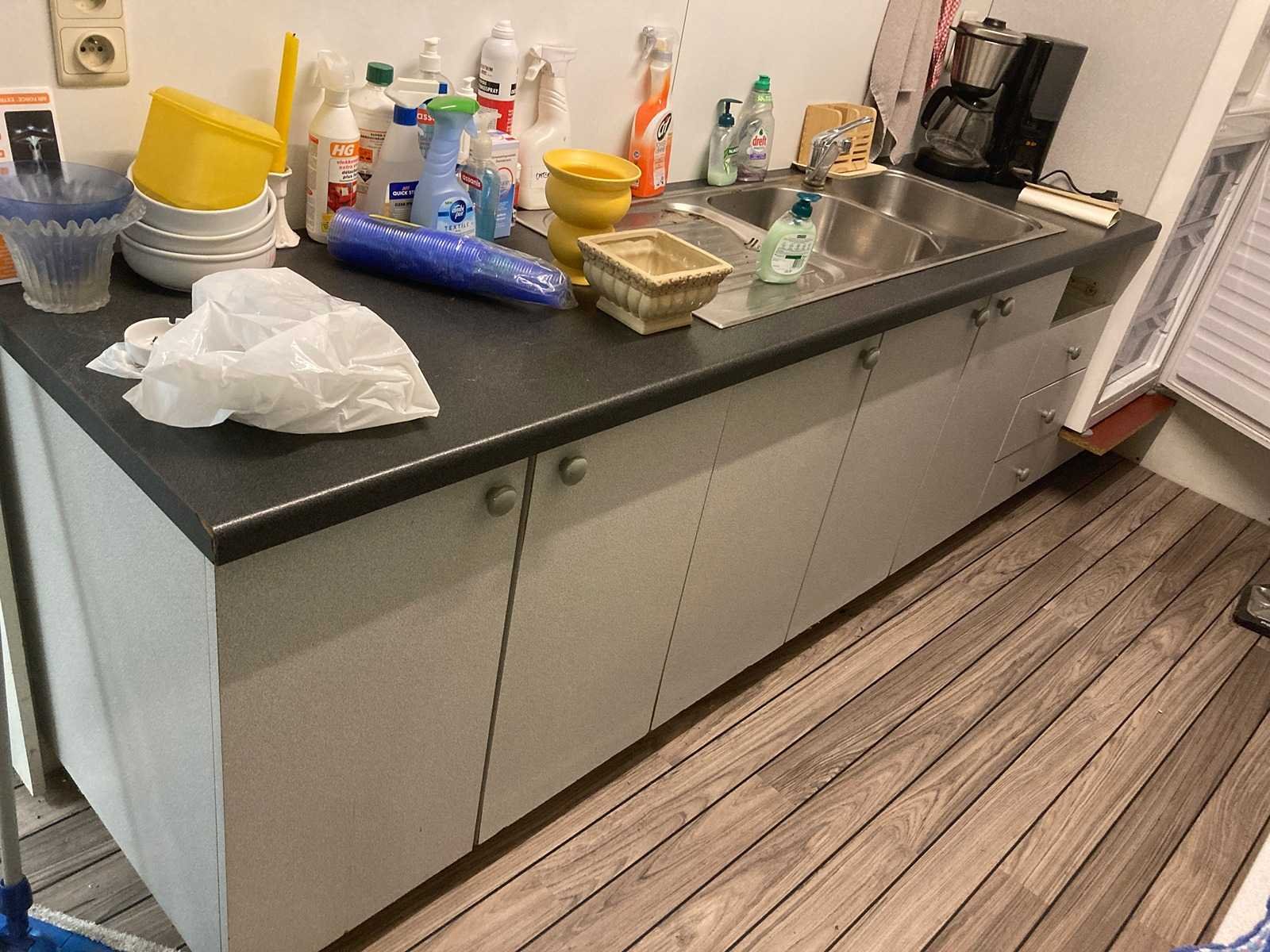 Keukentoebehoren : 1 ijskast met groot diepvries vak, 1 microgolf oven, 1 koffiemachine, thermos, handoeken, glazen en borden, wand opbergsysteem met planken (zelf te demonteren bij ophaling). Wand opbergsysteem : 8 latten om op de muur te bevestigen, 28 plankenhouders, 5 planken van L250xD40cm Nee