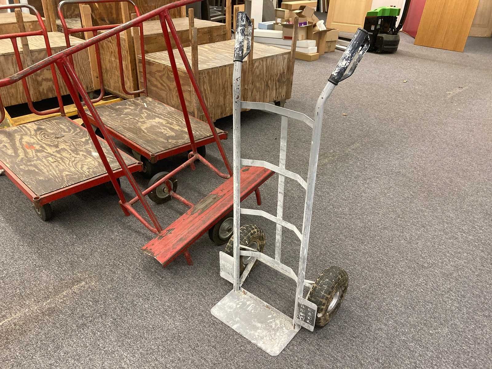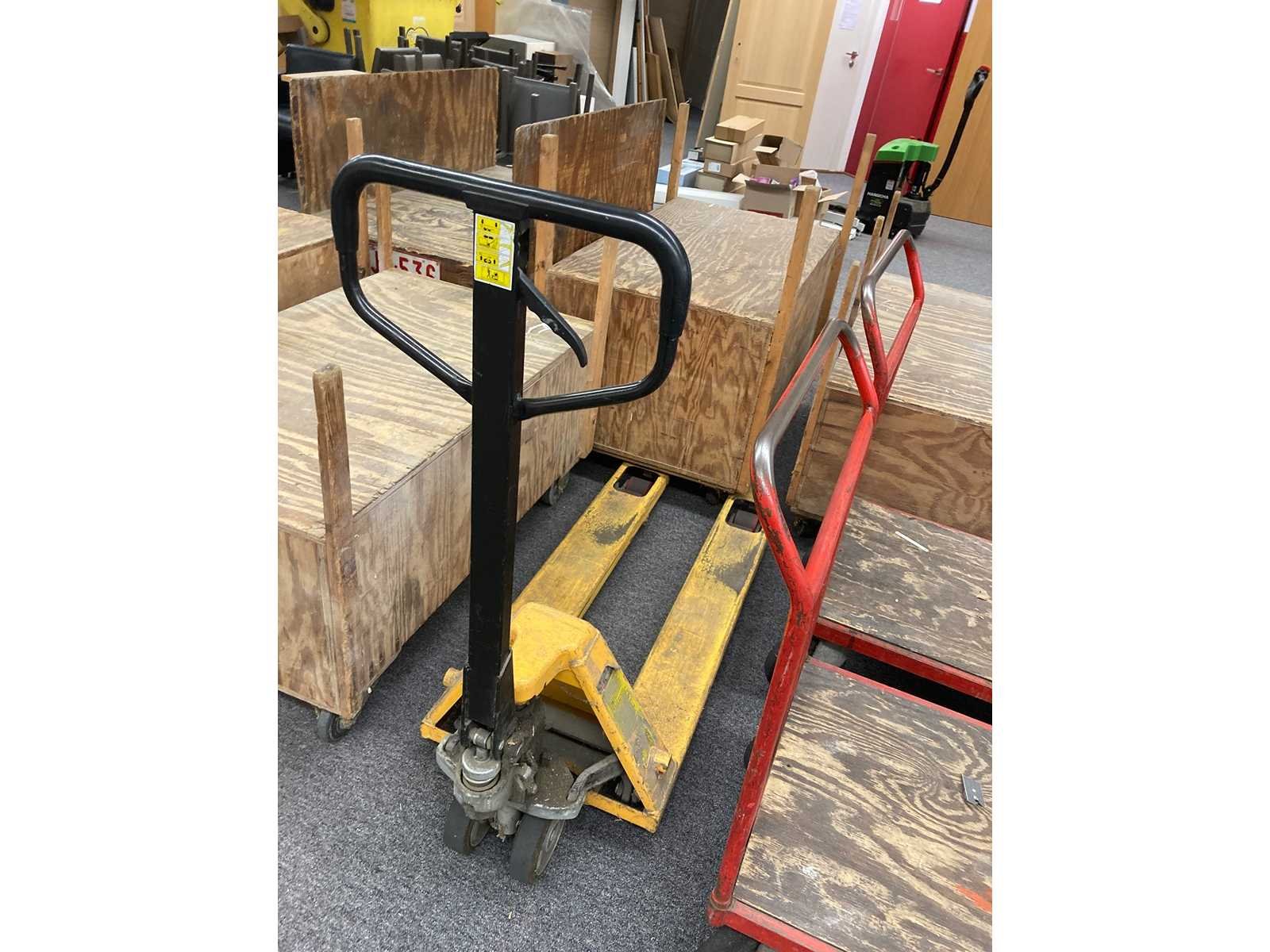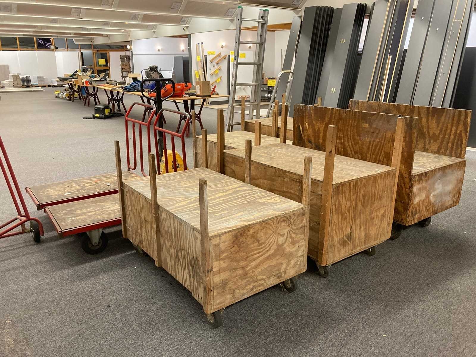 Transpalet, carren, steekwagen, panneelwagen, ladders en houten kisten op wielen