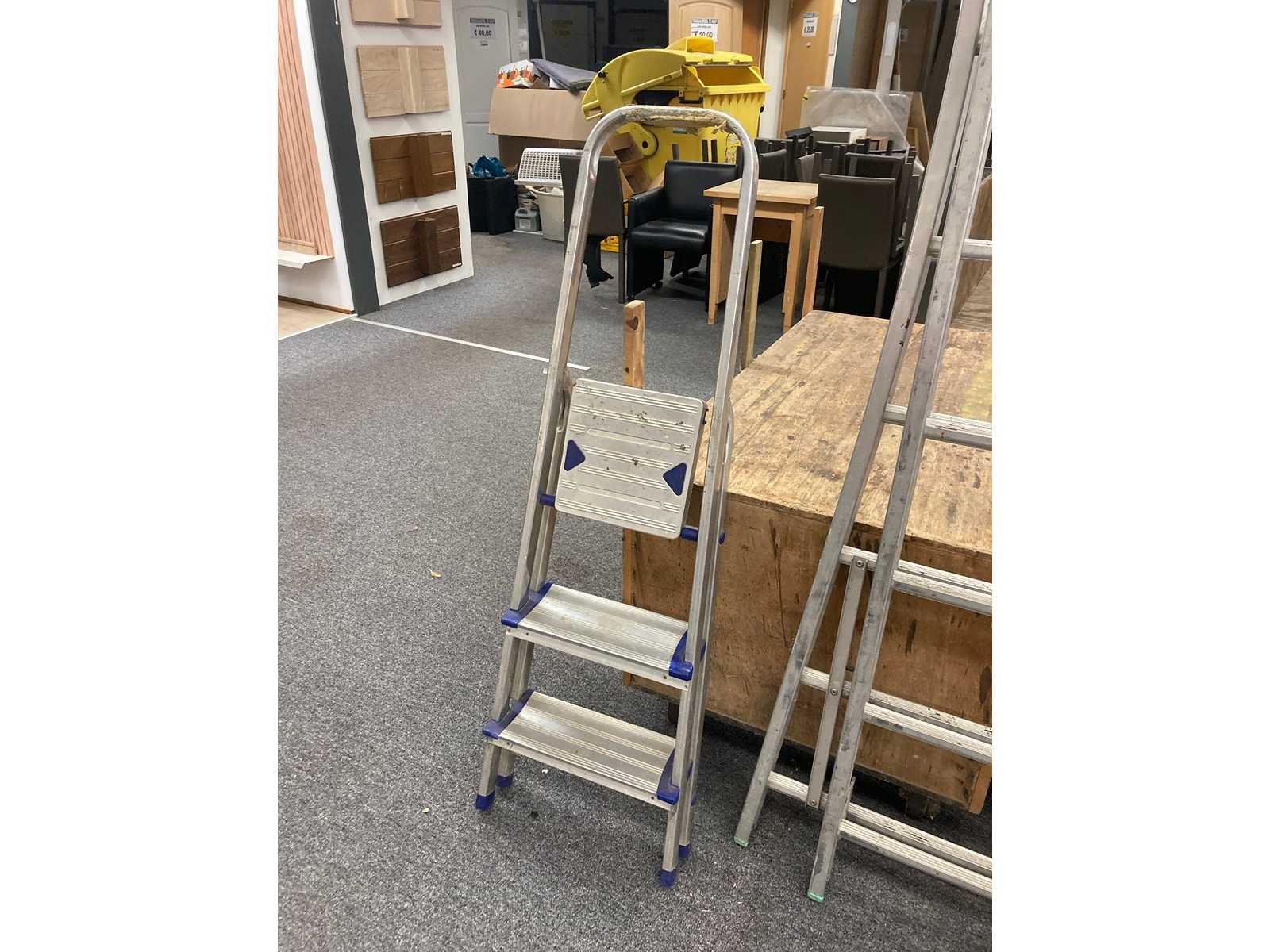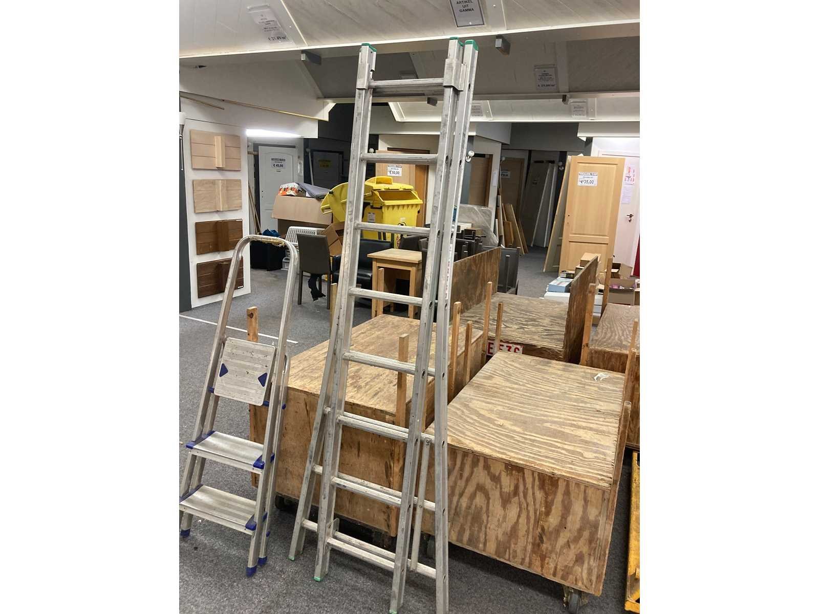 Partij magazijnmateriaal : 5 houten dozen op wielen, 1 transpalet, 2 carren, 1 steekwagen en 1 panneelwagen + 2 ladders Nee