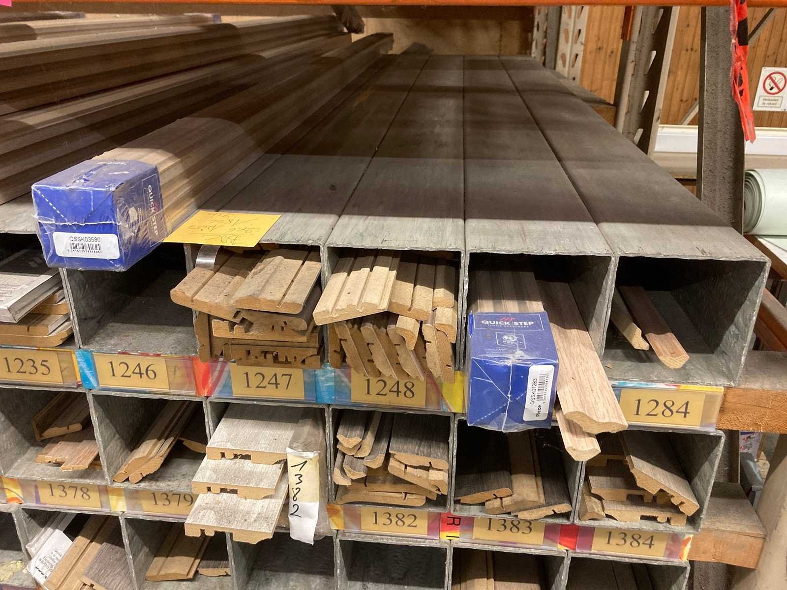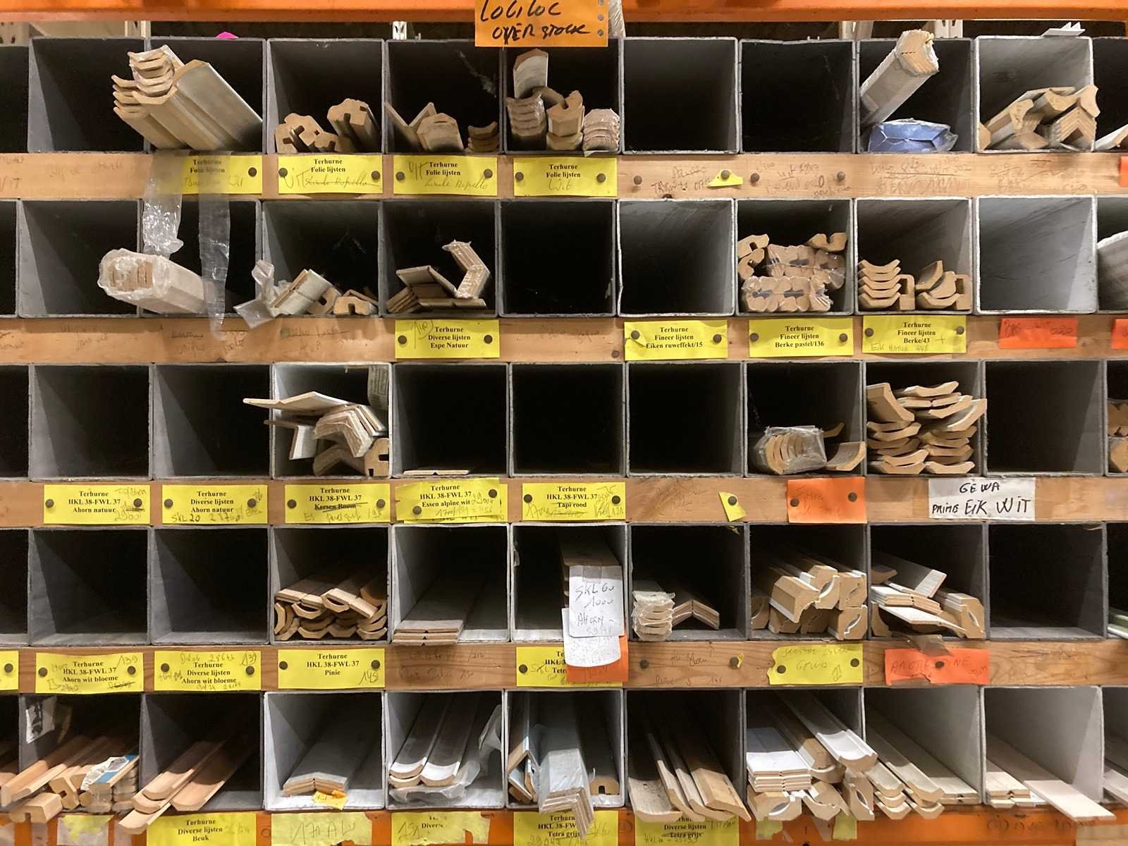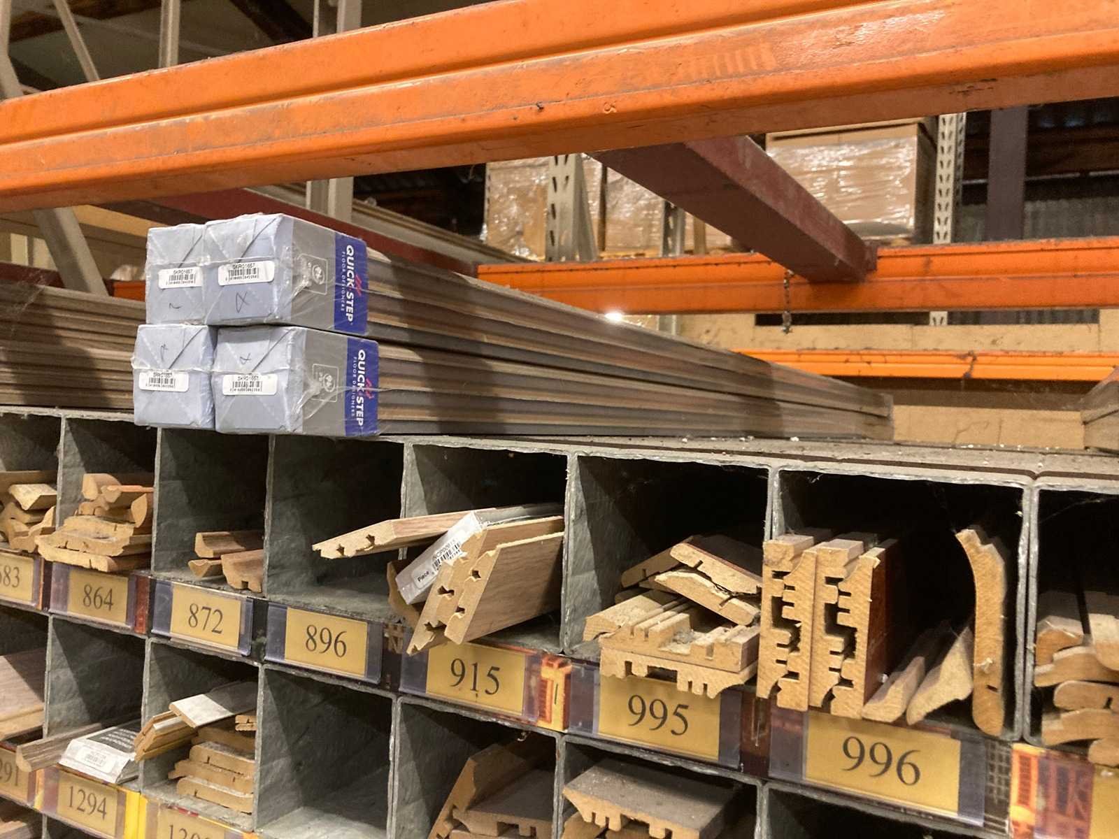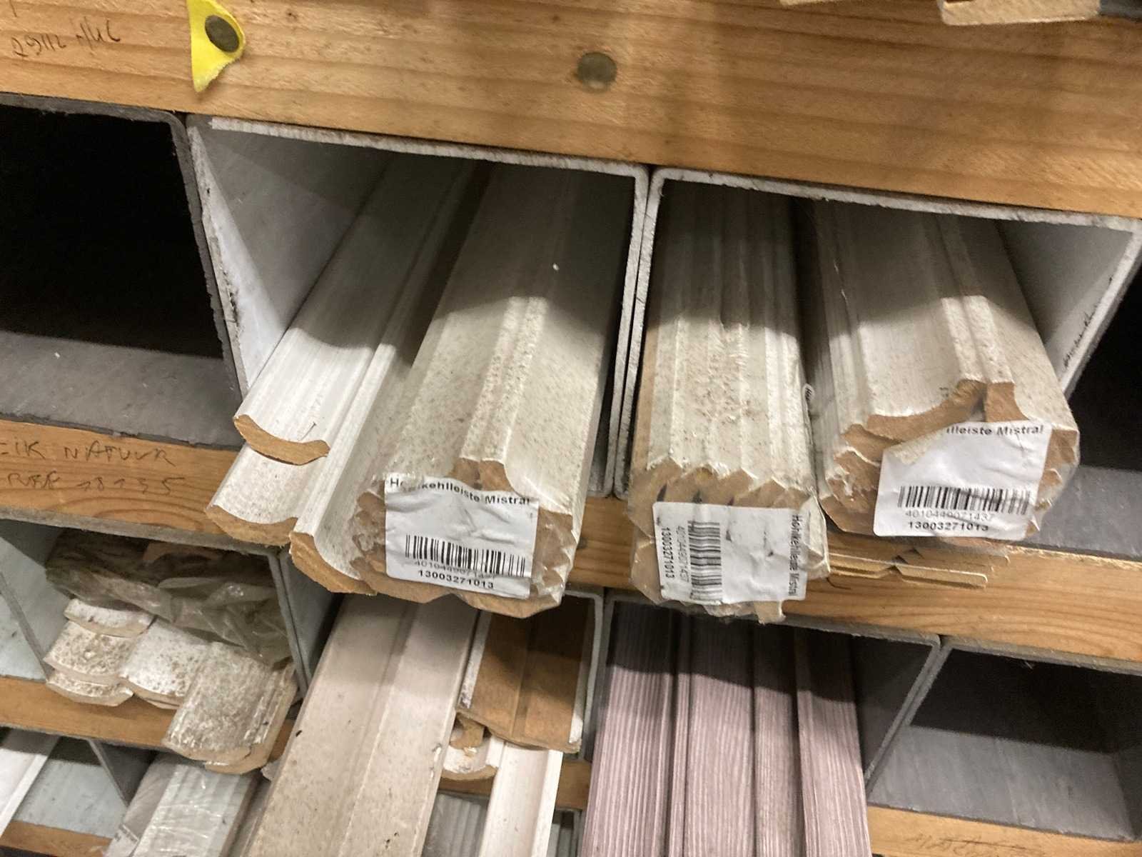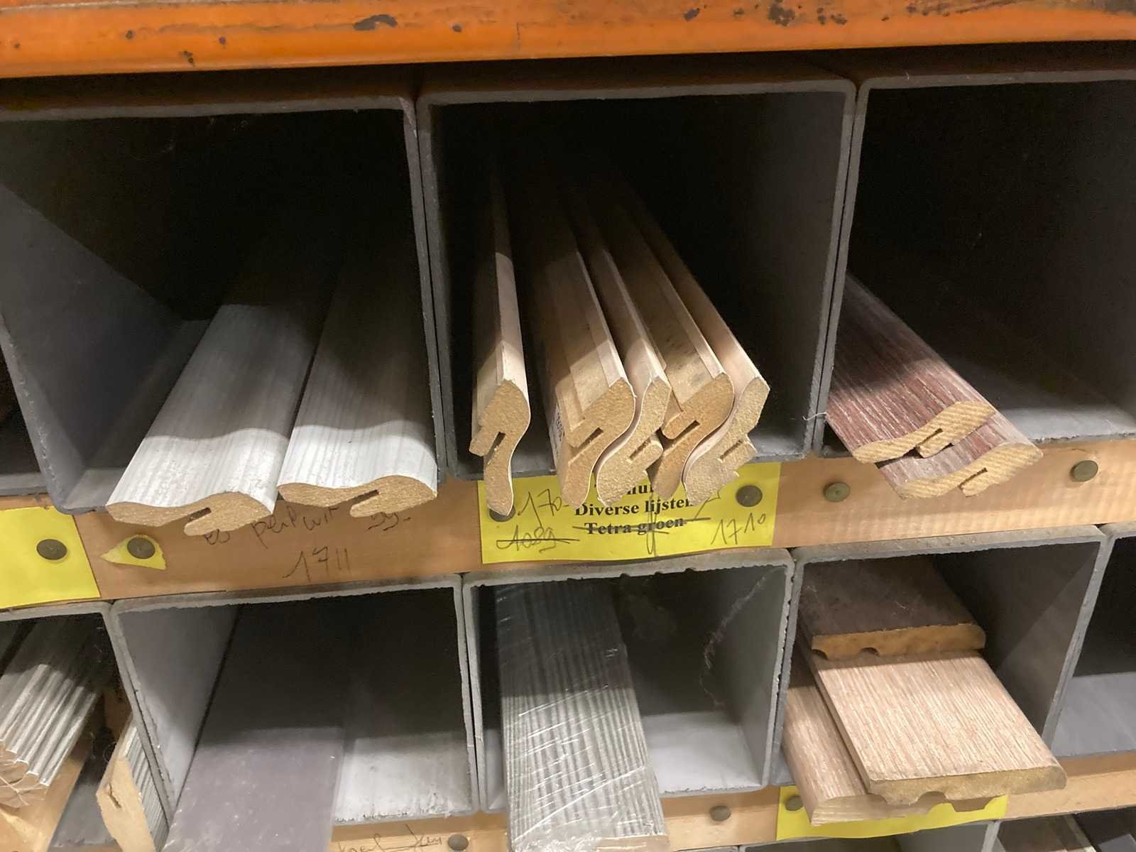 Groot lot profielen en plinten (zie fotos) Met organisatie systeem : 792 pvc kokers van 12x12x250a260cm + 66x PVC kokers van 73x12x12cm (magazijnrek niet inbegrepen, die wordt in een apart lot verkocht) => zélf te demonteren bij ophaling Nee