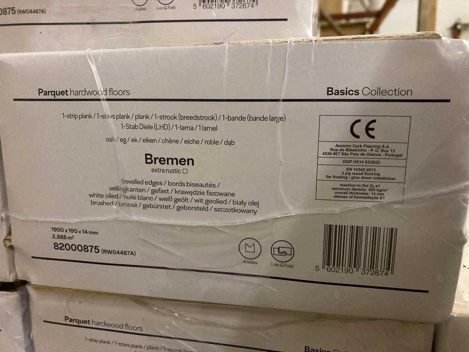 Semi-massief vloer Bremen 2.88m² per verpakking en er zijn 36 volledige verpakkingen (+1 die open is geweest) (voor ophaling: 1 deel zit in de showroom en 1 deel in het magazijn achter) Nee