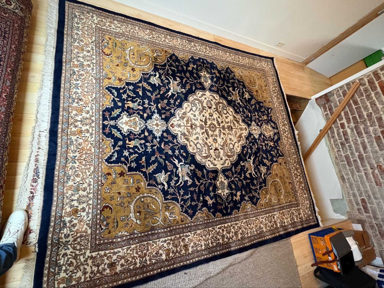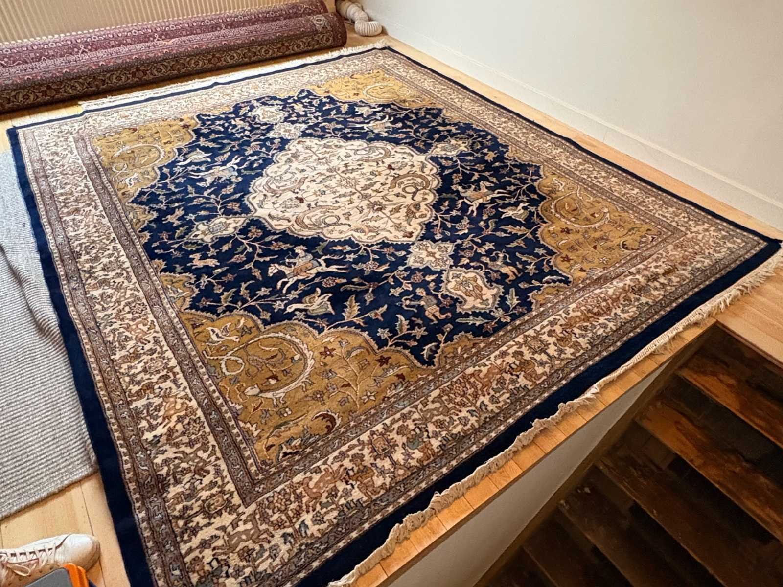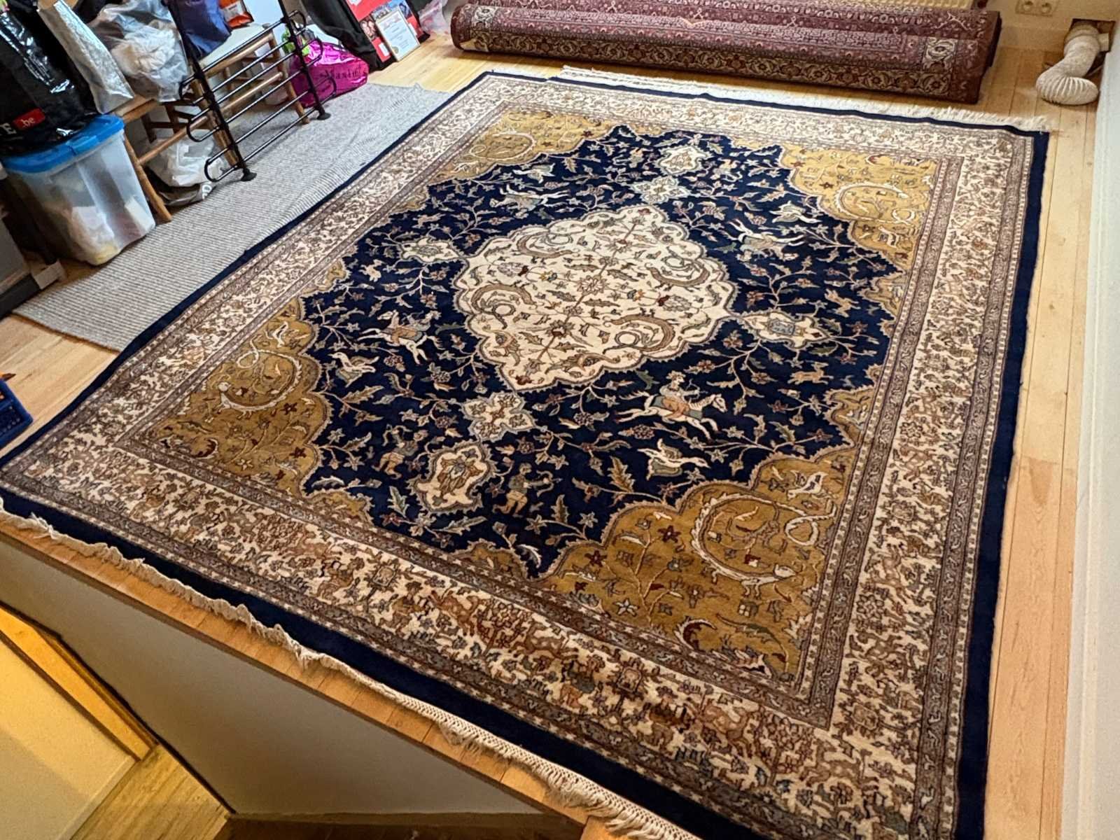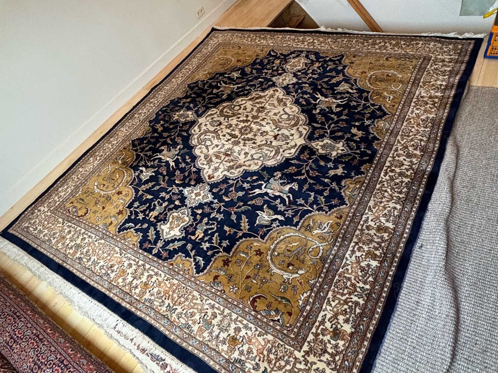 Goed bewaard tapijt met gebruikssporen passend bij leeftijd No Land: Iran Regio: Bidjar Fabrikant: Handgeknoopt atelier, Iran Materiaal: Wol op katoen schering Model: Bidjar tapijt Periode: 1985-1990 Product type: Handgeknoopt Perzisch tapijt Lengte: 300cm Breedte: 255cm Herkomst: Bidjar, Iran Lage schatting: 1300 Hoge schatting: 2500 GS Code: 57011000