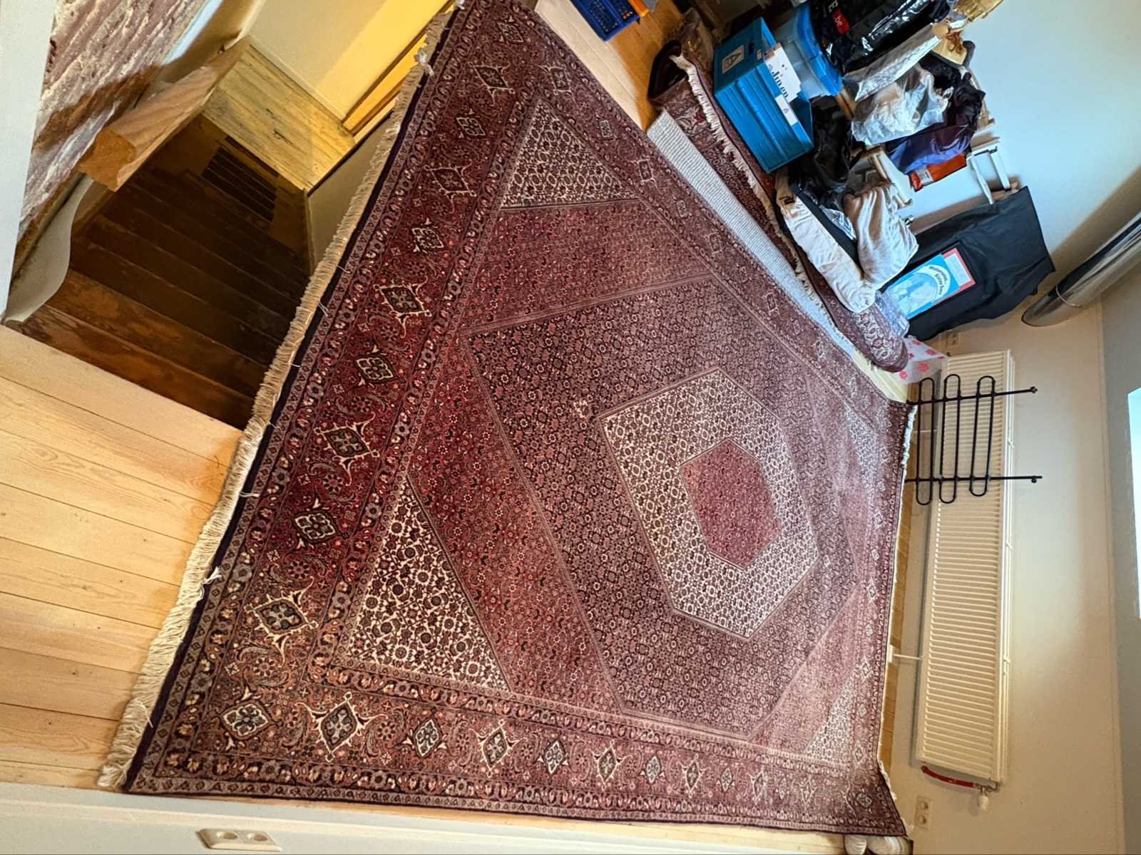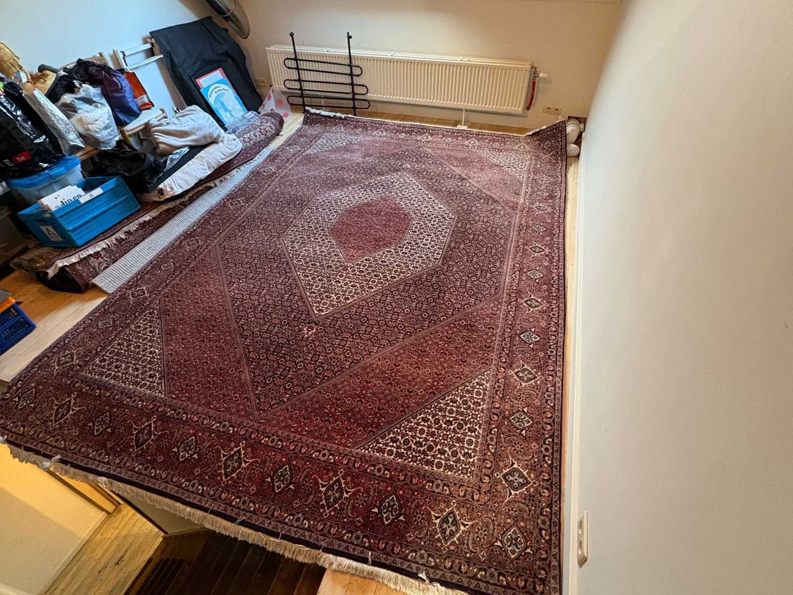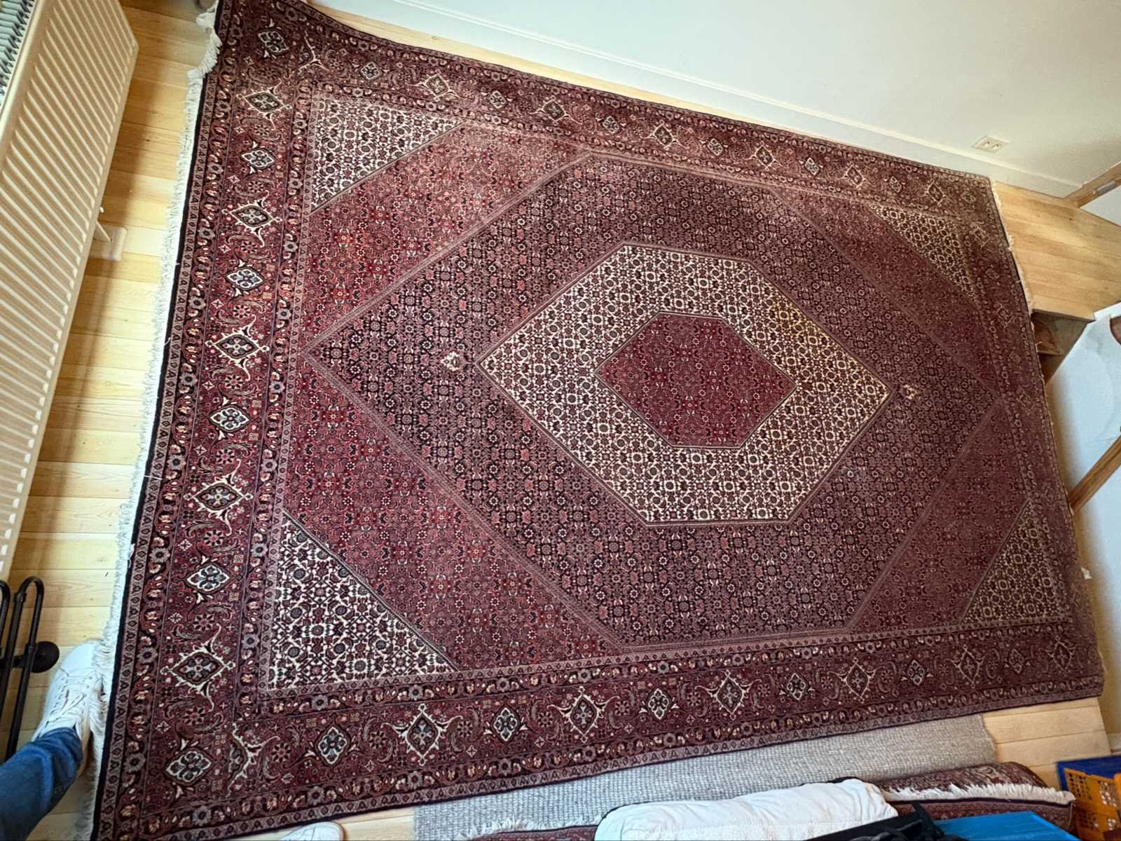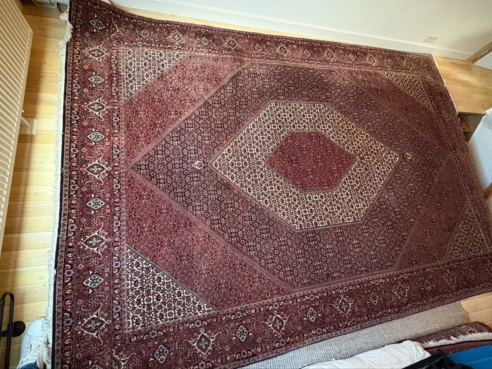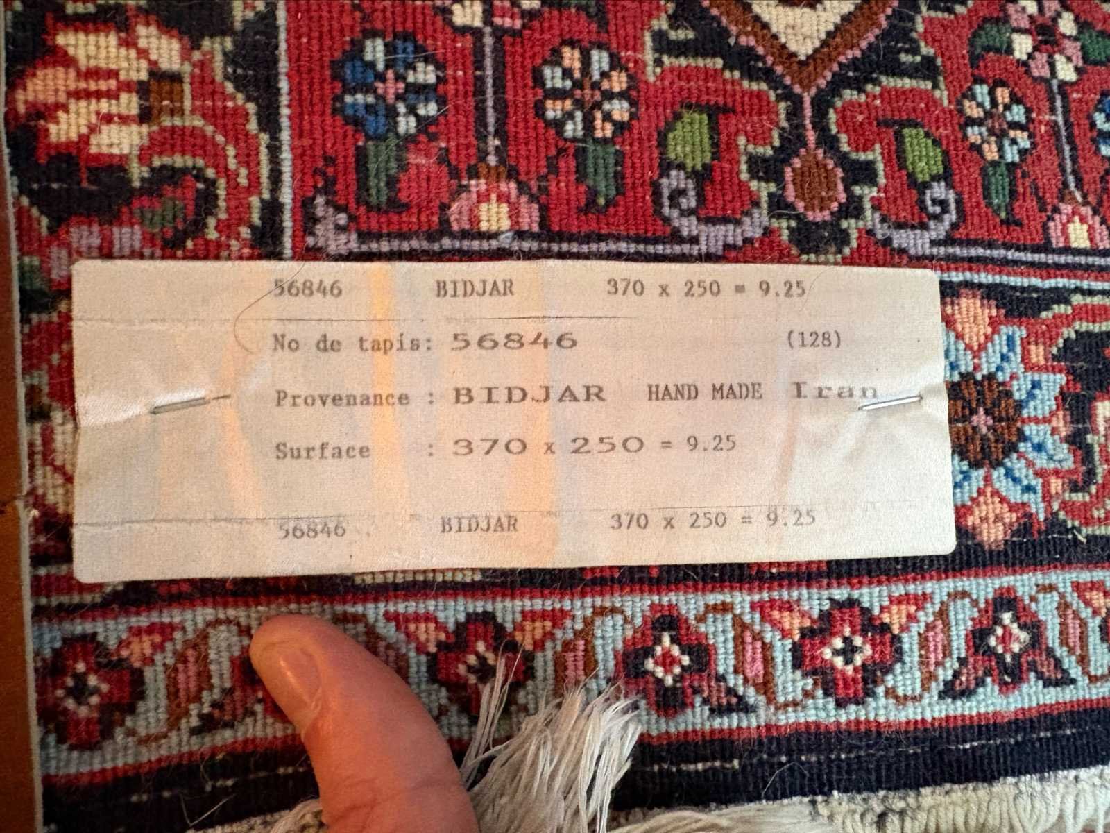 Goed bewaard tapijt met gebruikssporen passend bij leeftijd No Land: Iran Regio: Bidjar Materiaal: Wol op katoen schering Model: Bidjar Periode: 1980-1995 Product type: Handgeknoopt Perzisch tapijt Lengte: 250cm Breedte: 370cm Herkomst: Iran Lage schatting: 3000 Hoge schatting: 7500