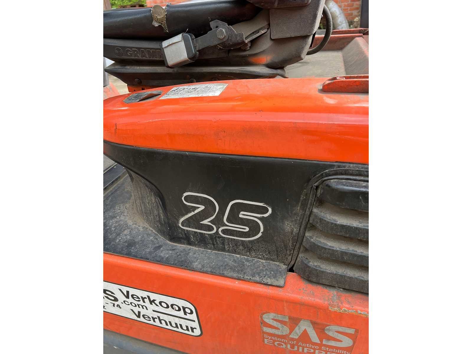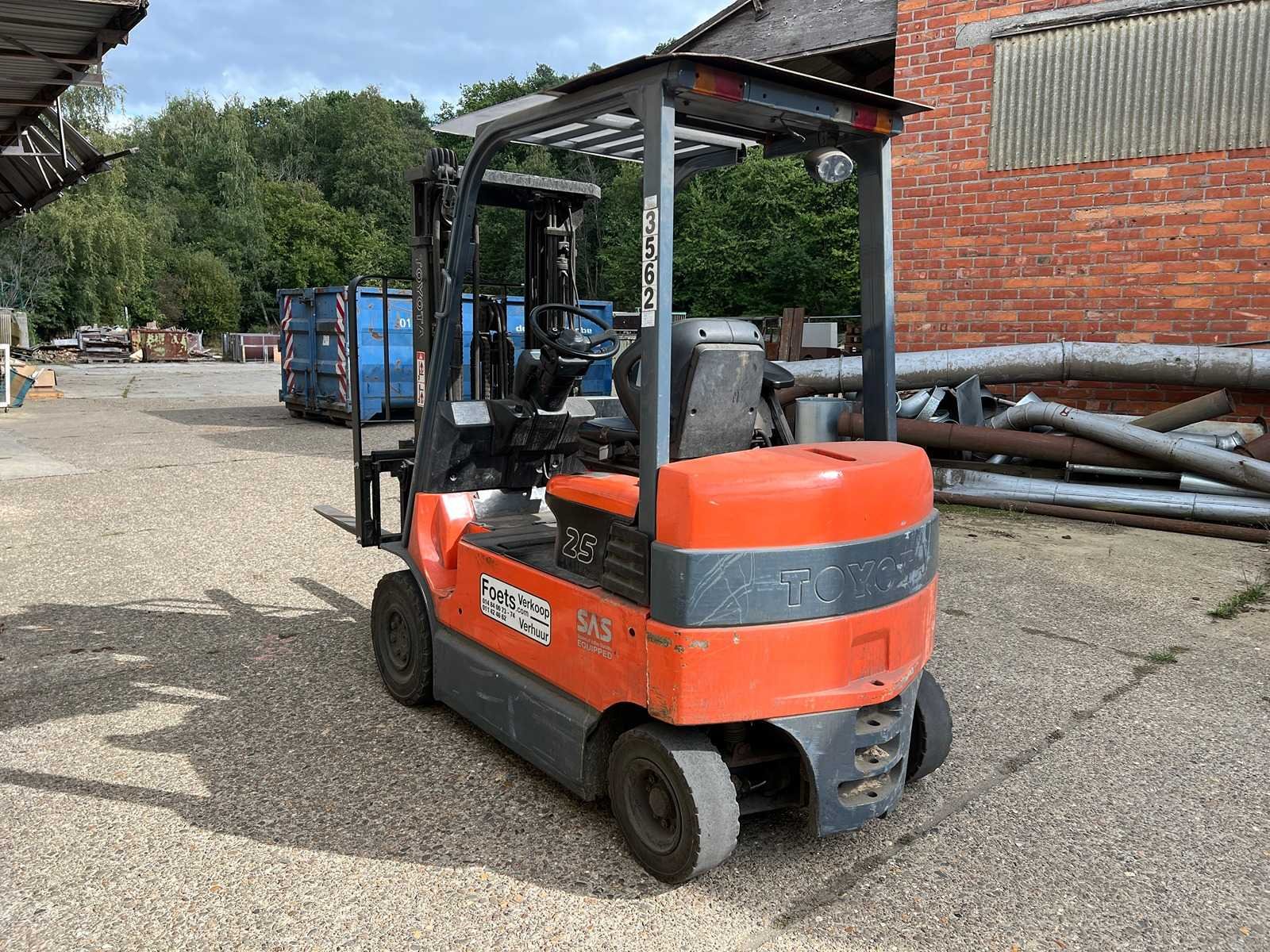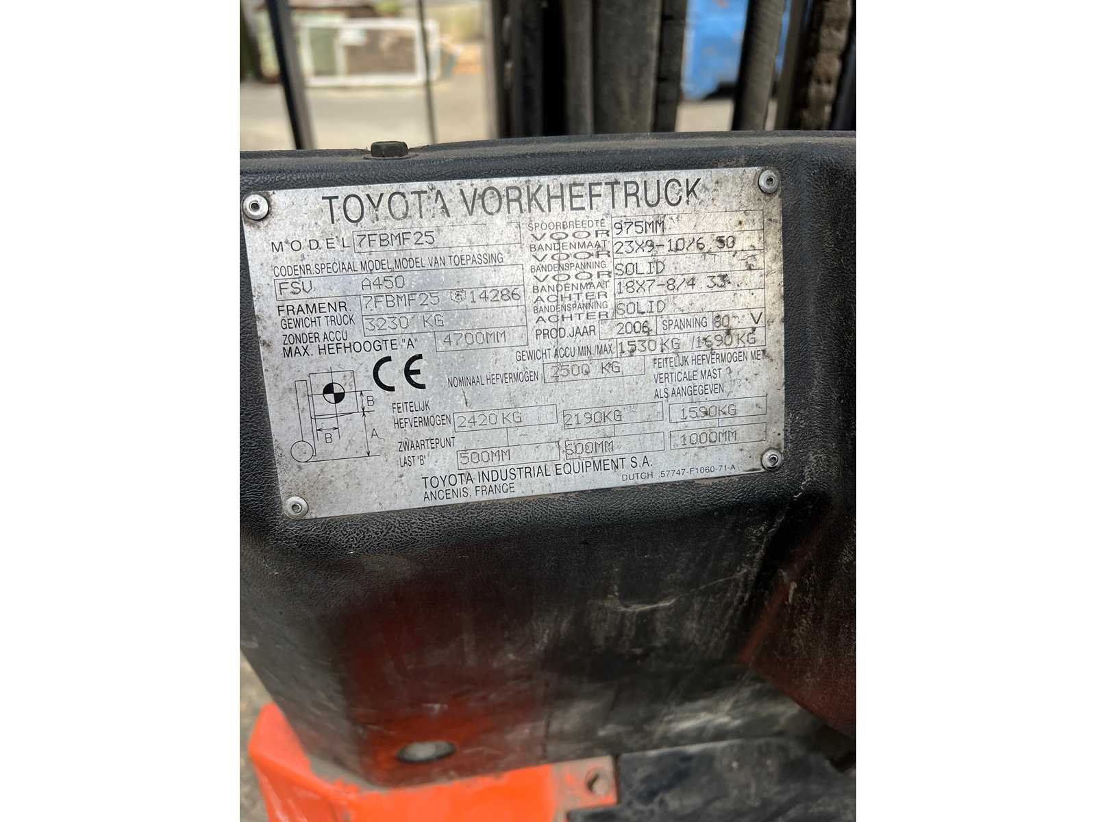 Toyota 7FBMF25 elektrische heftruck. Degelijke en betrouwbare vorkheftruck uit de 7-serie van Toyota, ontworpen voor intensief gebruik in magazijnen en productiehallen. Uitgerust met drieweg hydrauliek en ergonomische bediening. Specificaties Fabrikant: Toyota Type: 7FBMF25 Uitvoering: Elektrische vorkheftruck, 4-wiel Hefvermogen: 2.500 kg Hefhoogte: ca. 3.000 – 4.700 mm (afhankelijk van masttype, standaard duplex/triplex) Doorrijhoogte: ca. 2.100 – 2.300 mm Aandrijving: elektrisch, 80V tractiebatterij Bediening: hydraulische hendels, stuurbekrachtiging Voorzien van: sideshift Gewicht (incl. batterij): ca. 4.000 – 4.500 kg Ophaling op afspraak na de 2e afhaaldag ( vanwege gebruik tijdens afhaaldagen). Nee Merk: TOYOTA Type: 7FBMF25 Bouwjaar: 2006 Serienummer: 7FBMF25 Brandstof: elektrisch Aantal wielen: 4 Afgelezen urenstand: 30812 Accu lader: true Eigen gewicht: 3230kg Hefvermogen: 2500kg Lepellengte: 1200mm Hefhoogte: 4700mm Luchtbanden: false Vol rubber banden: true Minimale doorrijhoogte: 2200mm Totale afmeting L: 3600mm Totale afmeting Breedte: 1200mm Totale afmeting Hoogte: 2200mm