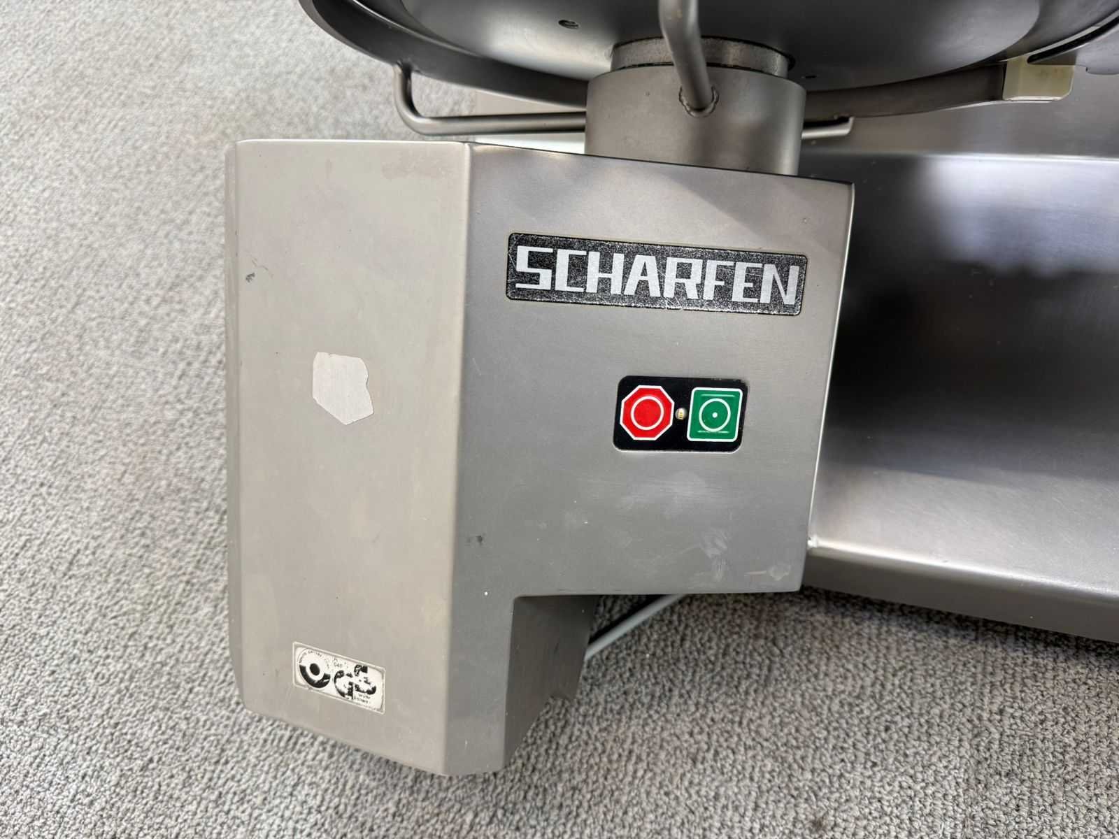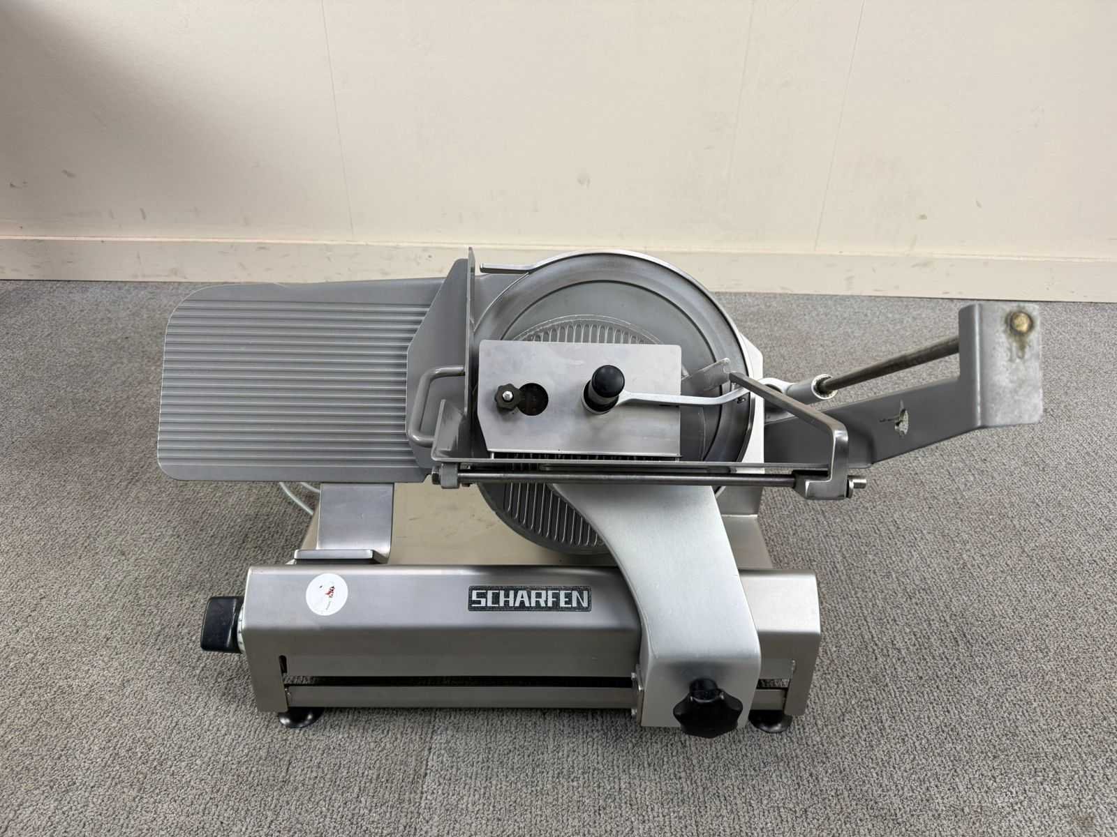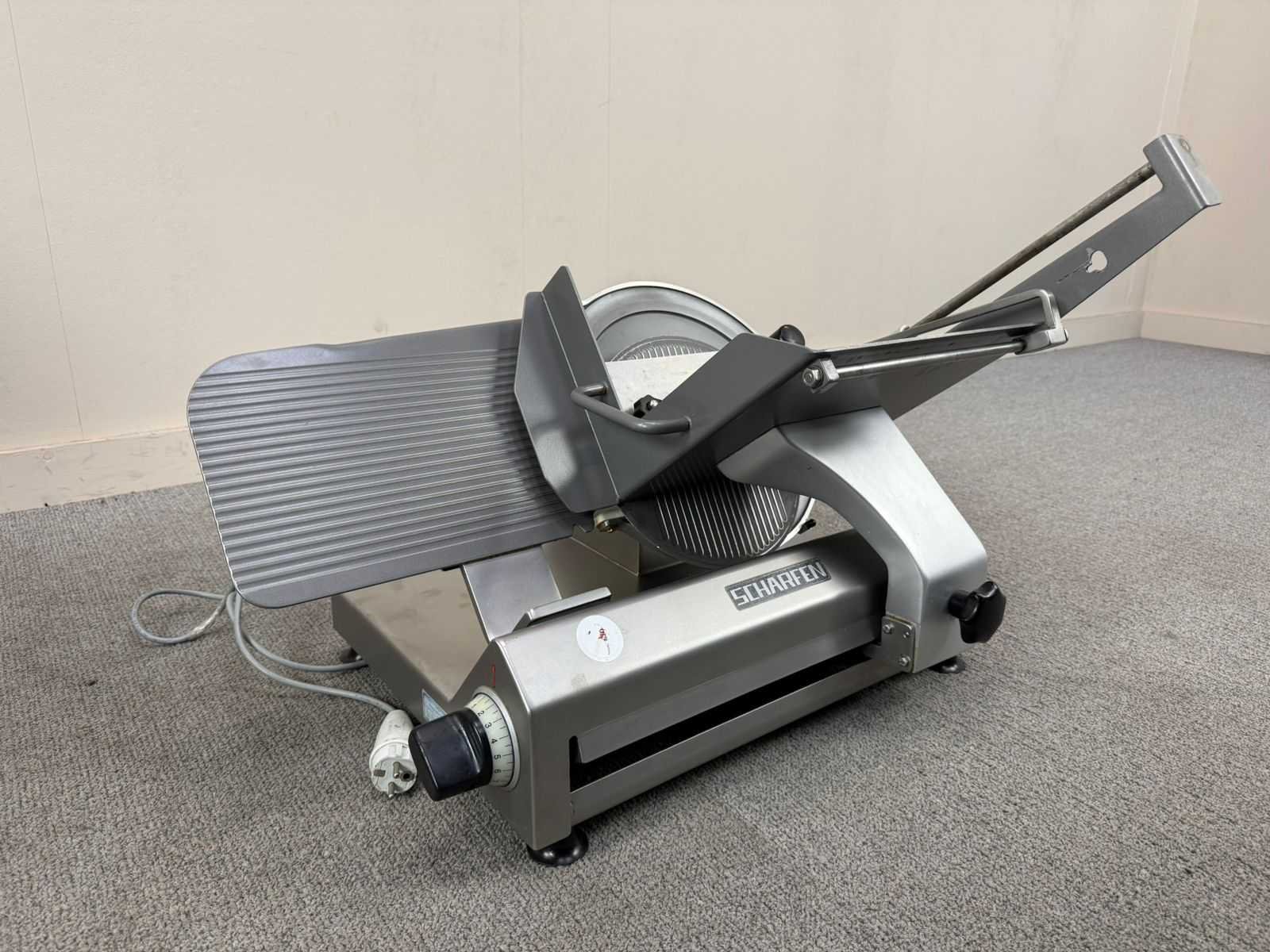 Professionele snijmachine van Scharfen, geschikt voor het snijden van vleeswaren, kaas en andere voedingsproducten. Robuuste horeca-uitvoering met verstelbare snijdikte en geïntegreerde veiligheidsvoorzieningen. Nee Merk: SCHARFEN