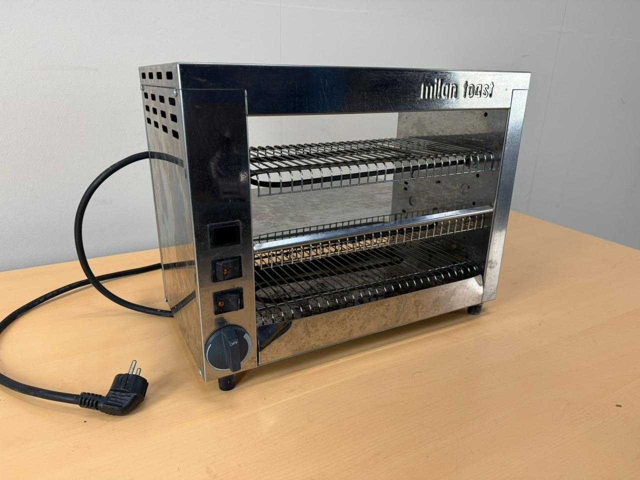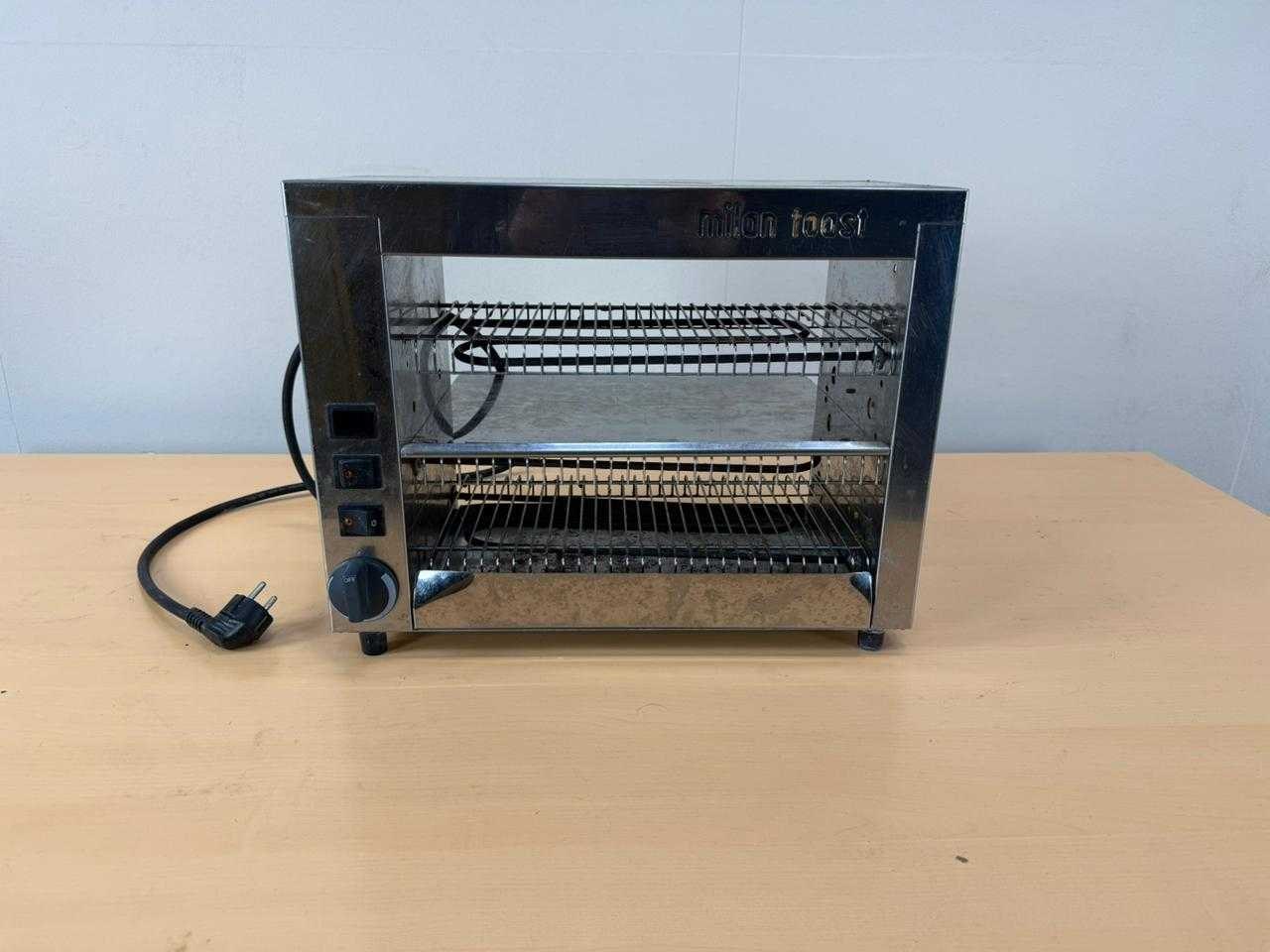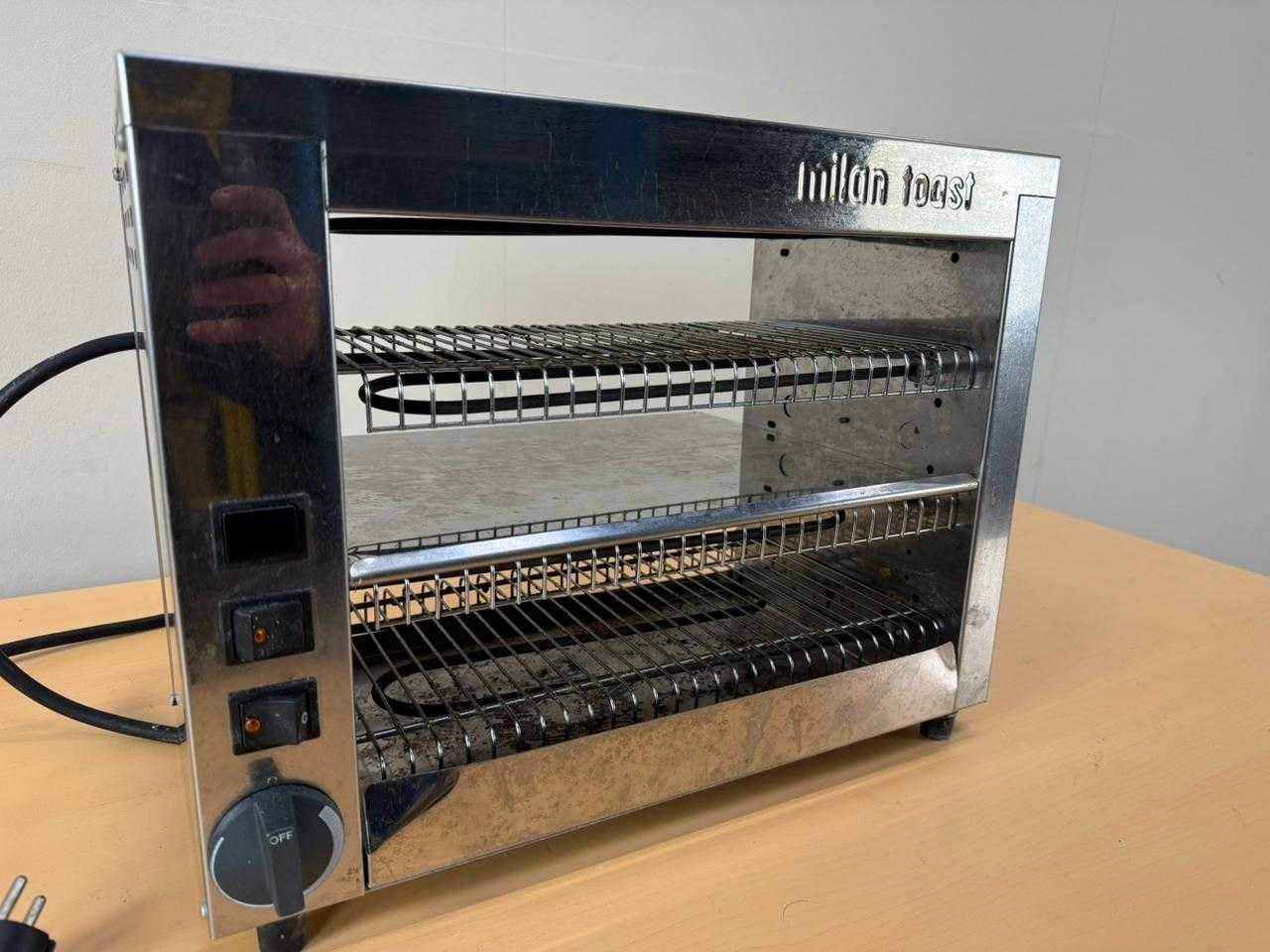 Professionele Milan Toasti salamander / broodrooster in RVS uitvoering. Geschikt voor het roosteren en gratineren van toast, broodjes en lichte bereidingen in horeca-omgevingen zoals cafés, broodjeszaken en grootkeukens. Voorzien van dubbele roosterhoogte. Nee Merk: Milan Toasti Type: broodrooster