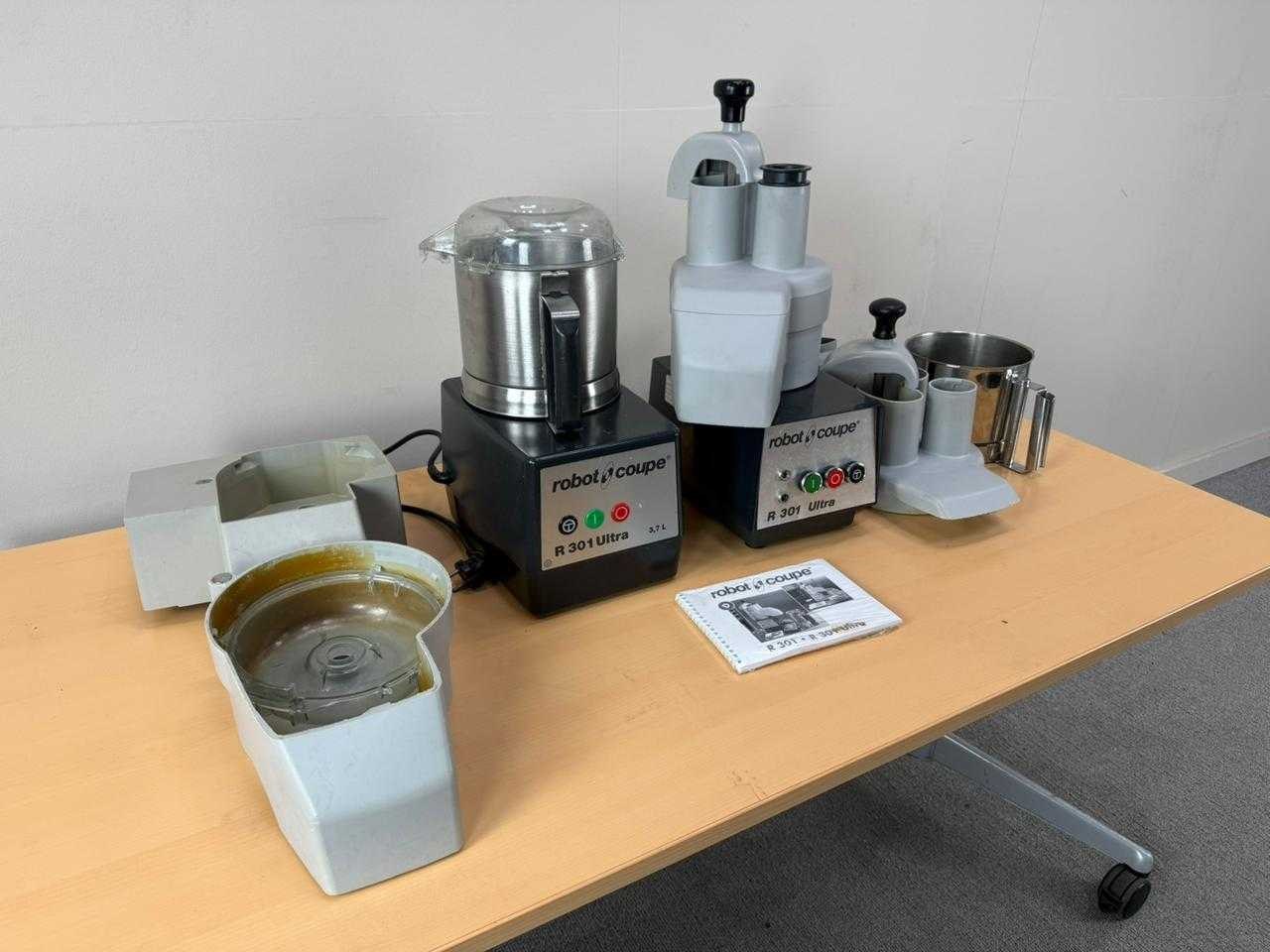 Professionele foodprocessor / groentesnijder van Robot Coupe, model R301 Ultra. Set bestaande uit twee motorblokken met bijhorende opzetstukken en accessoires. Geschikt voor intensief gebruik in horeca, catering, grootkeuken of traiteur. Samenstelling (zichtbaar op foto) 2× Robot Coupe R301 Ultra motorblok Cutter-opzetstuk met transparante kom en mes Groentesnijder-opzetstuk Diverse invoerbuizen en drukstempels RVS opvangkom Kunststof beschermkappen Handleiding inbegrepen Nee Merk: Robot coupe Type: R301 Ultra