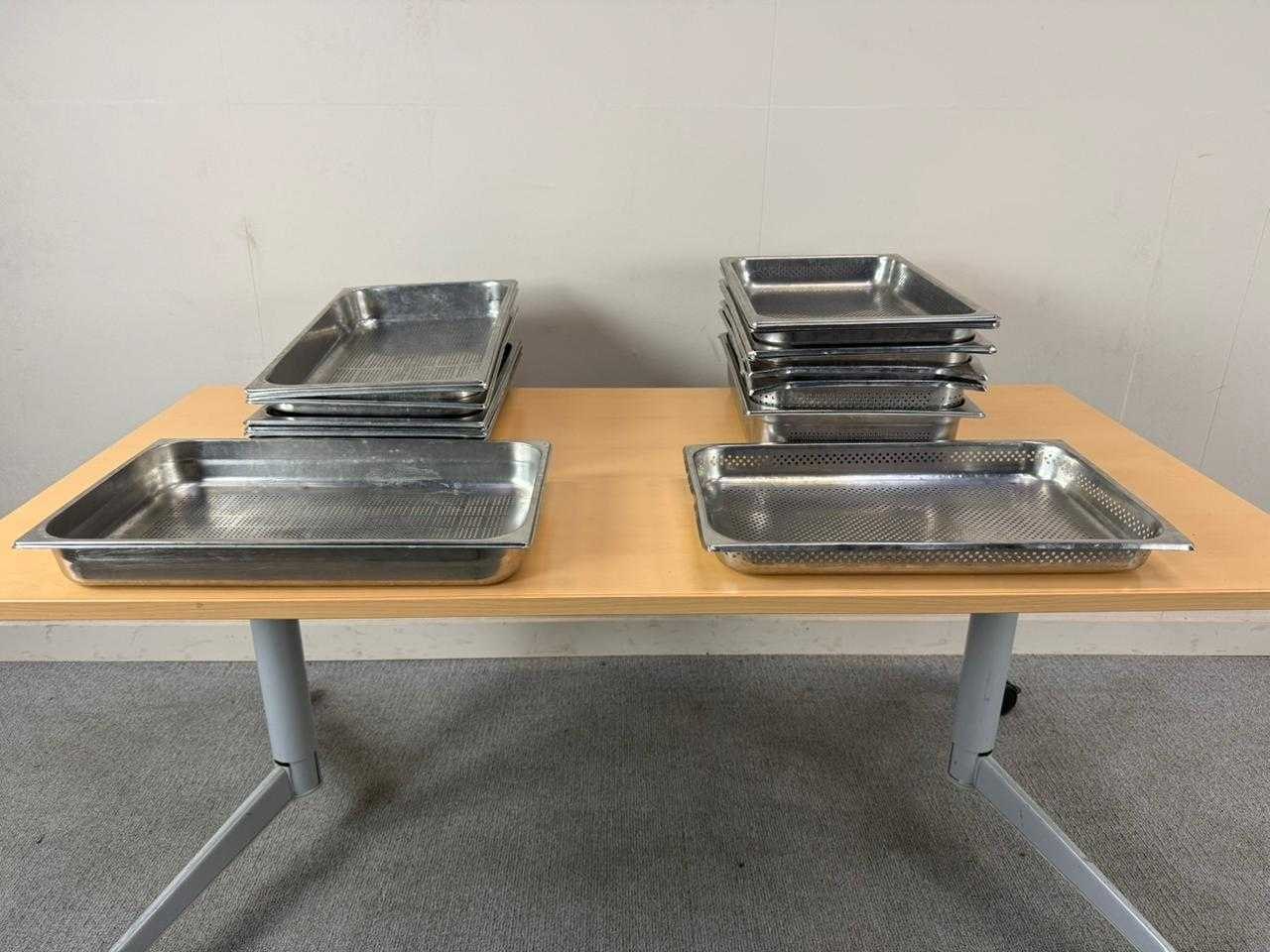 Varia gastronormbakken 17 stuks Partij professionele gastronorm bakken en geperforeerde inzetbakken in roestvrij staal. Geschikt voor horeca, grootkeuken, catering of voedingsverwerking. Ideaal voor bereiden, bewaren, uitlekken en presenteren van voedingsmiddelen. Nee