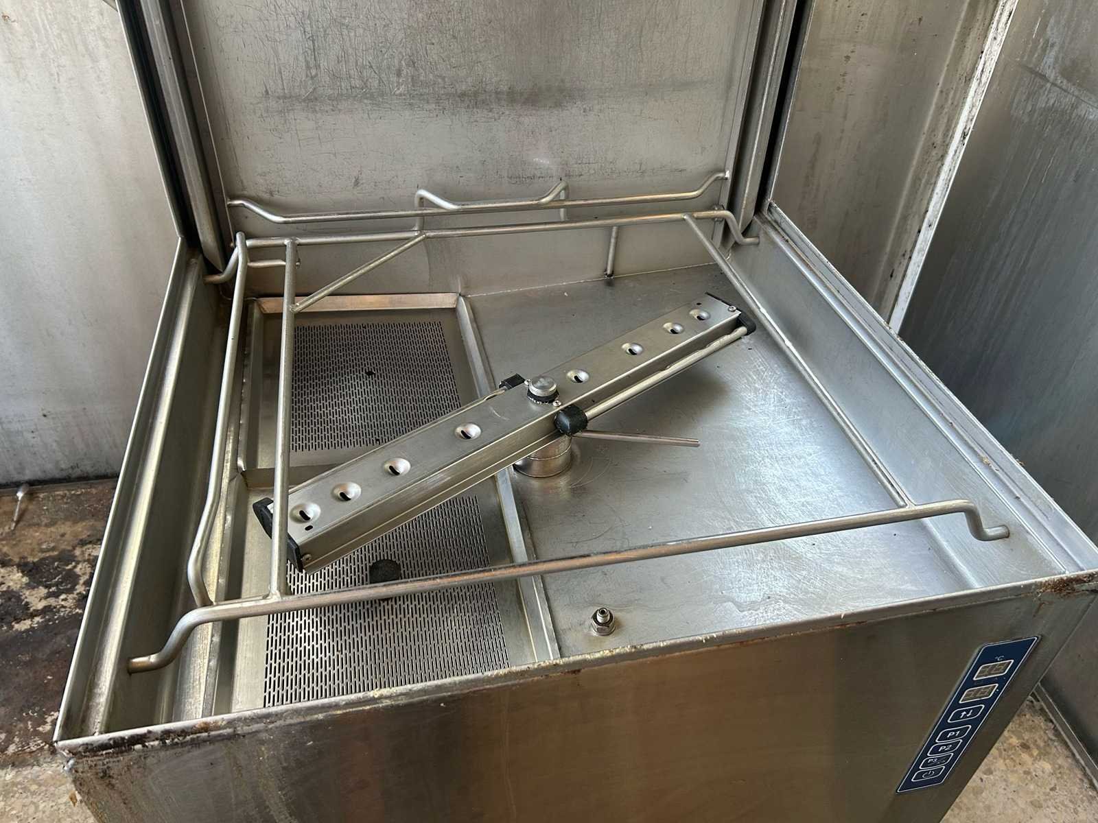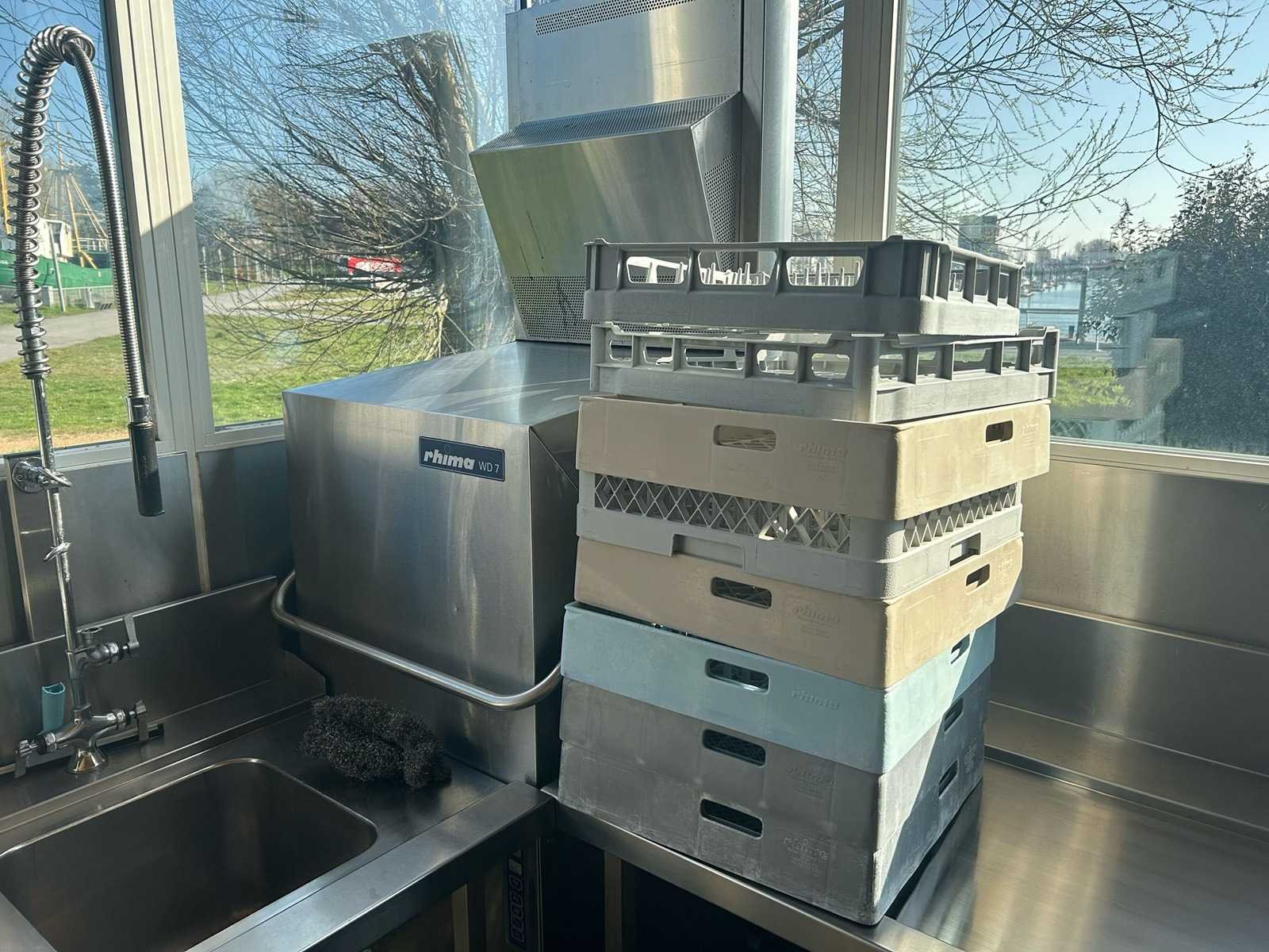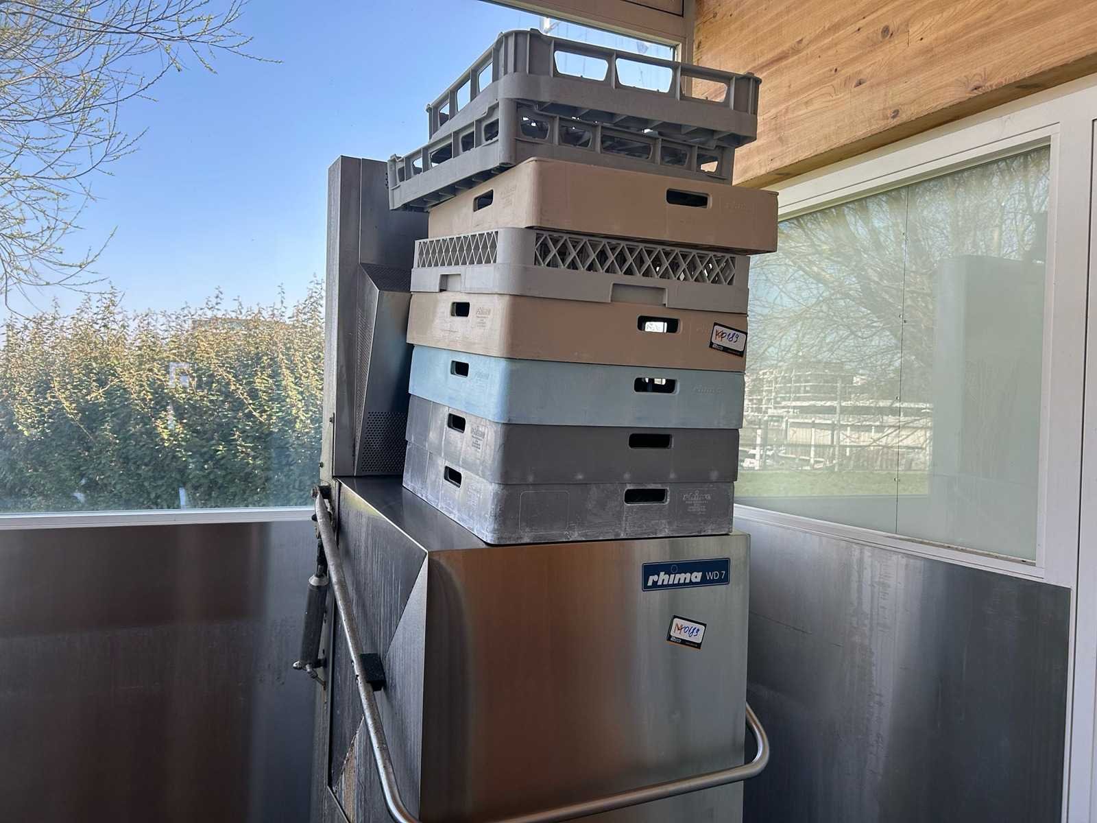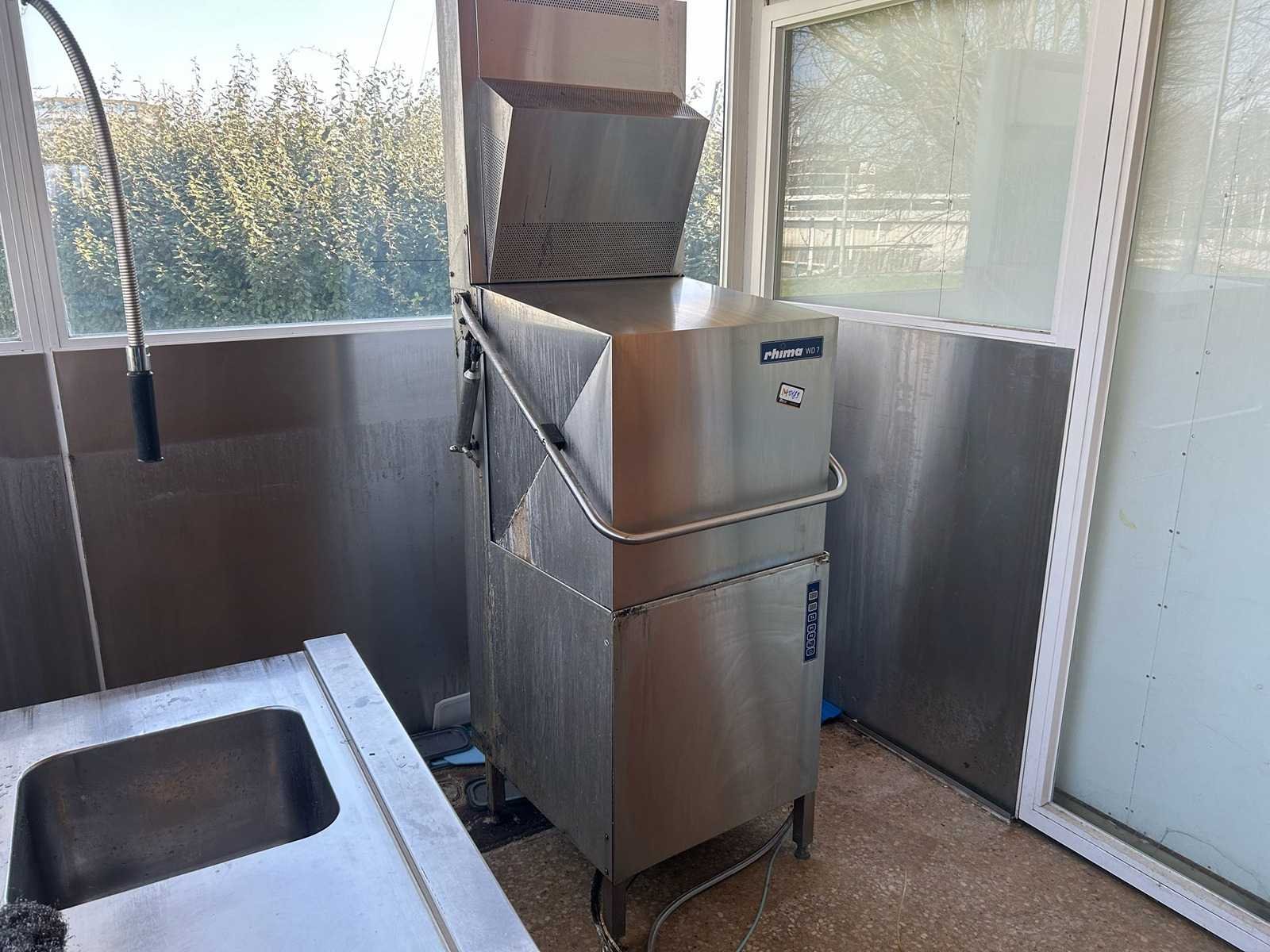 Professionele doorschuifvaatwasmachine Rhima WD 7, uitgevoerd in roestvrij staal. Geschikt voor intensief gebruik in horeca-omgevingen zoals restaurants, bedrijfskeukens, grootkeukens en catering. Verkocht in de staat waarin het zich bevindt Nee Merk: RHIMA Model: WD7