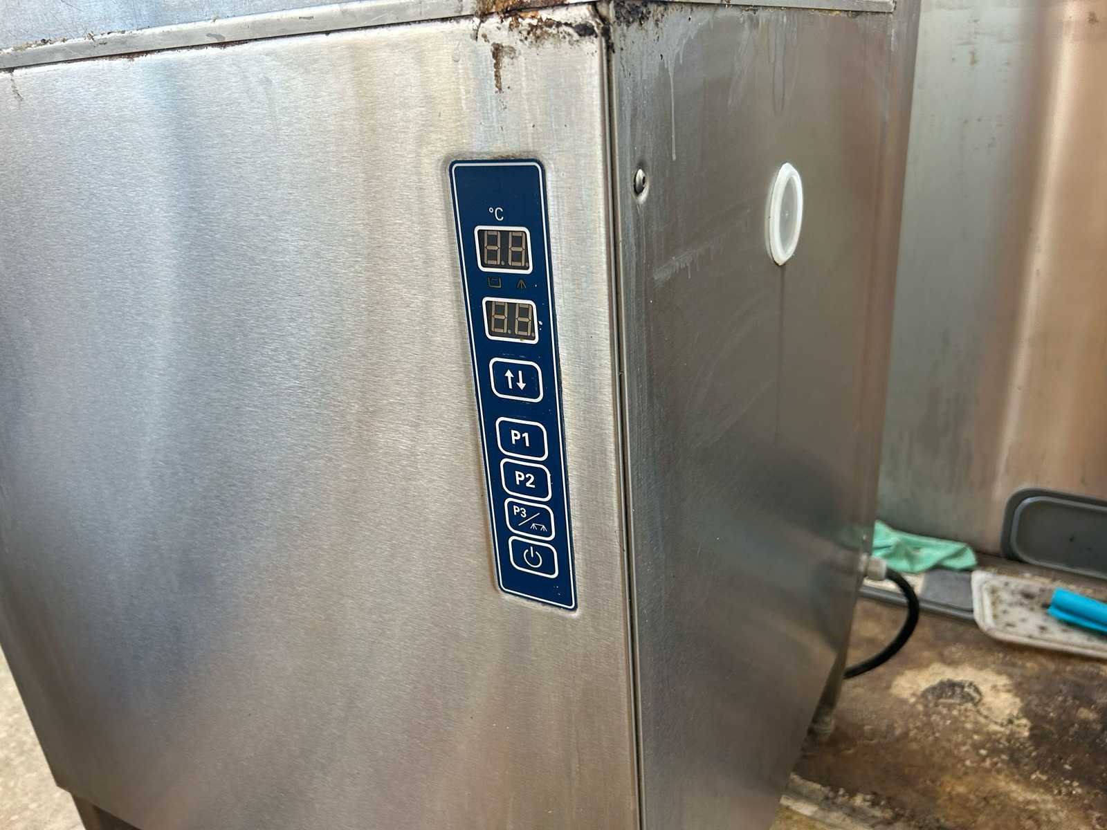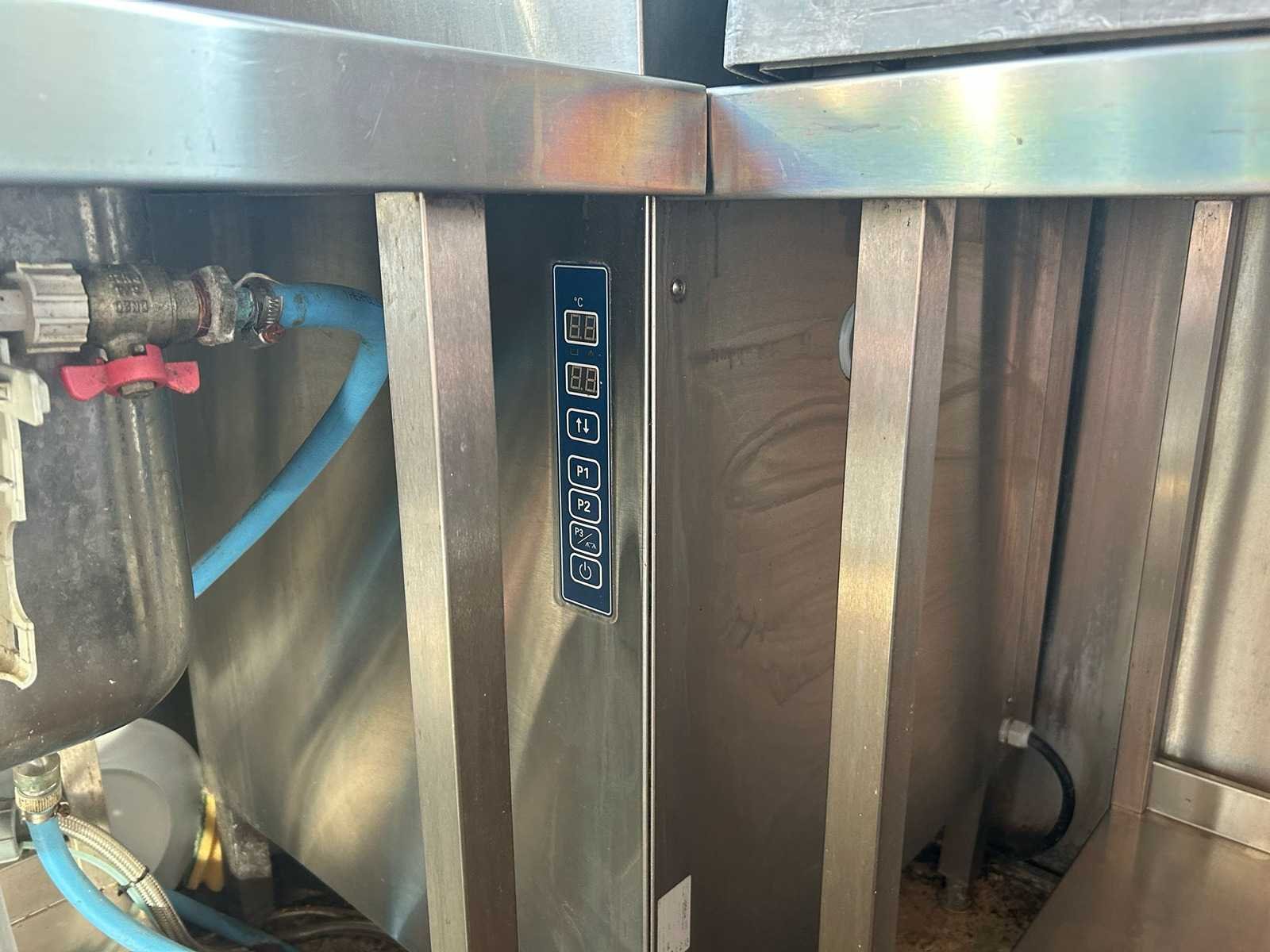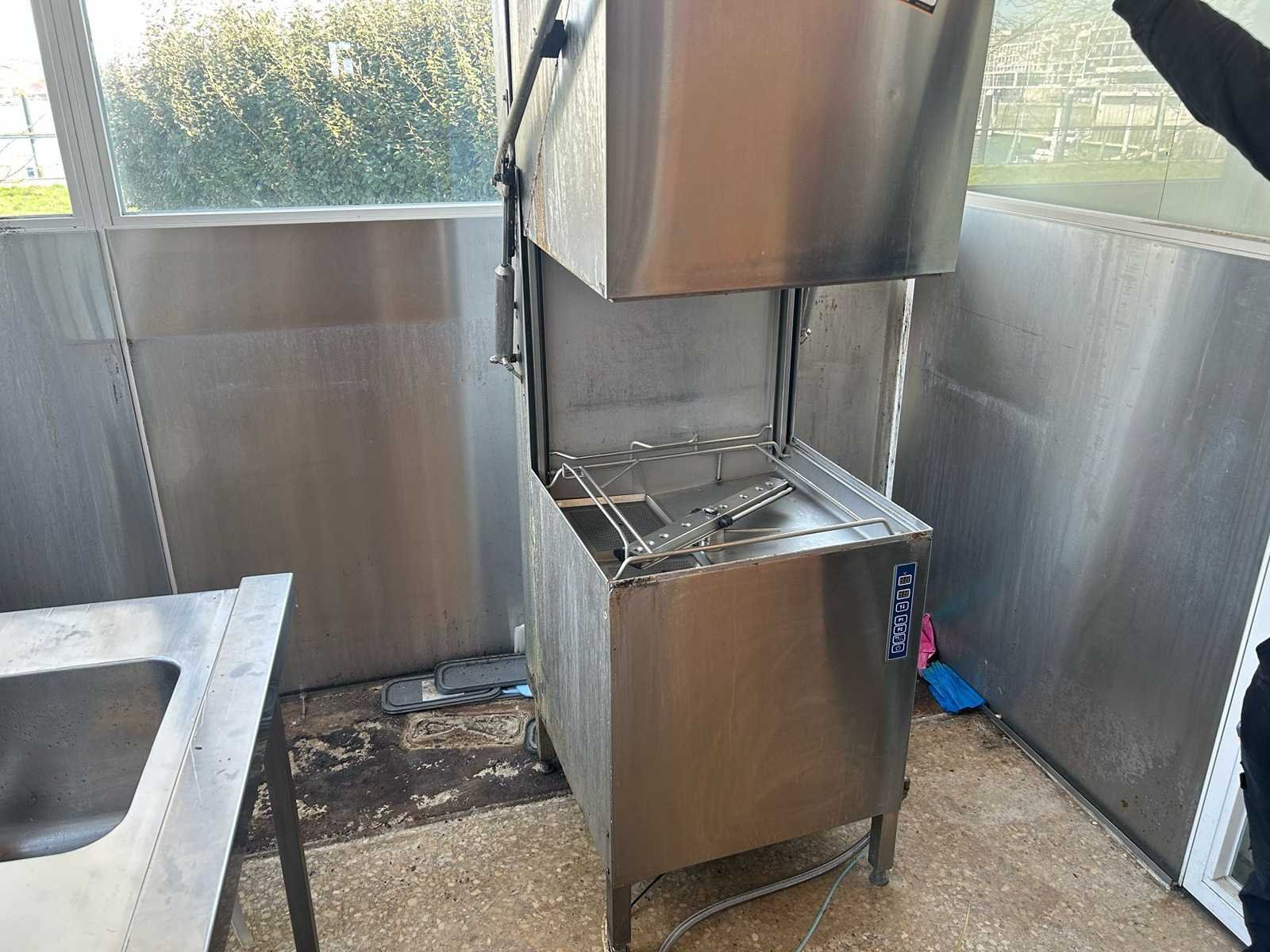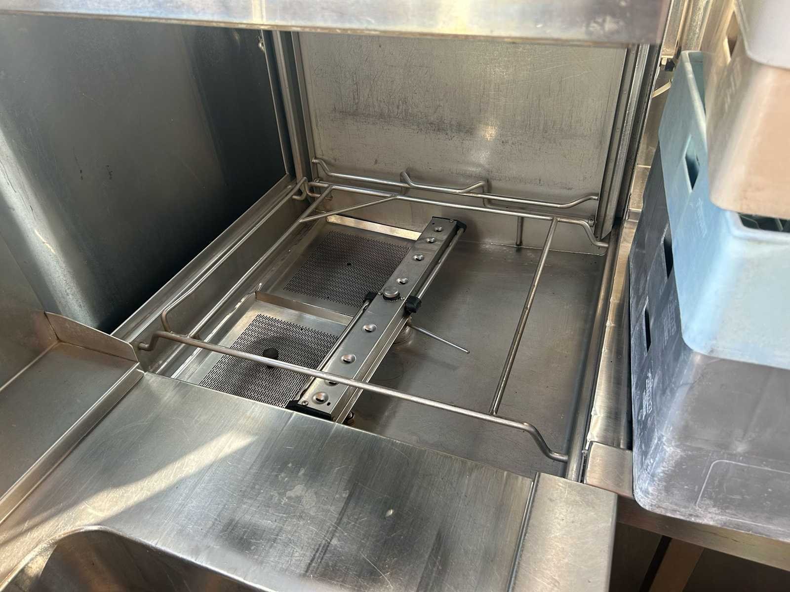 Professionele doorschuifvaatwasmachine Rhima WD 7, uitgevoerd in roestvrij staal. Geschikt voor intensief gebruik in horeca-omgevingen zoals restaurants, bedrijfskeukens, grootkeukens en catering. Verkocht in de staat waarin het zich bevindt Nee Merk: RHIMA Model: WD7