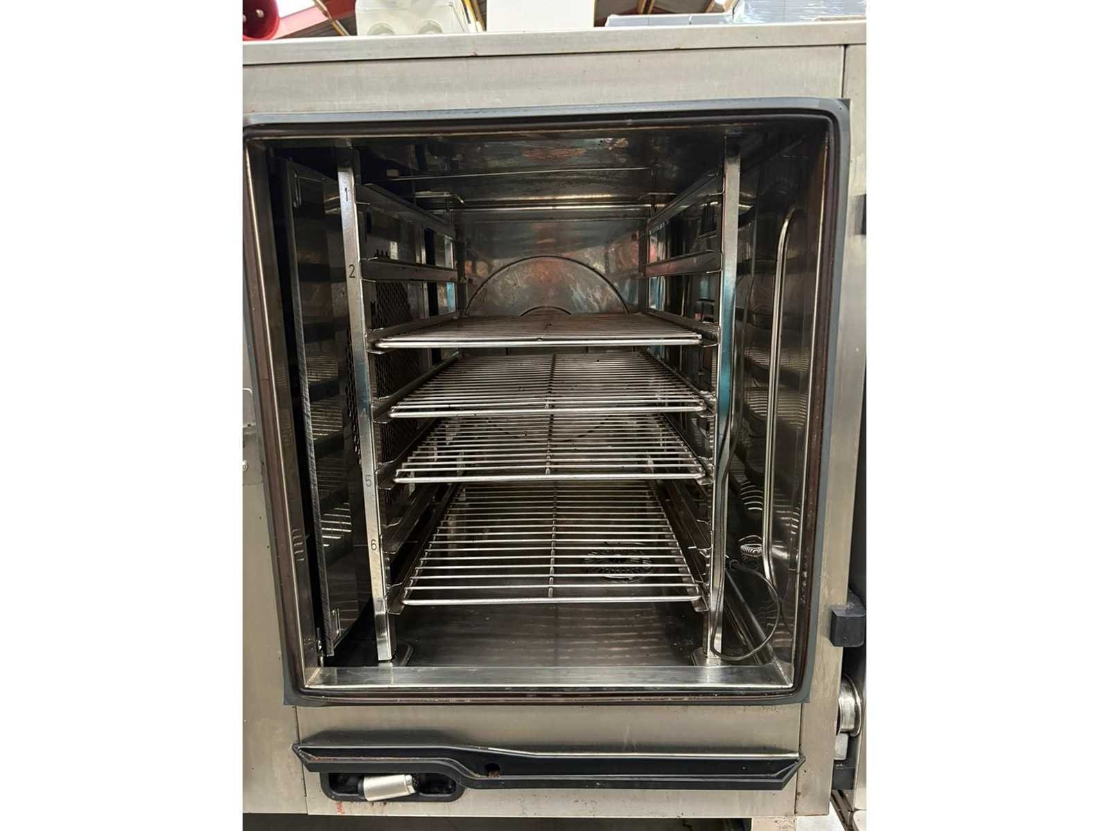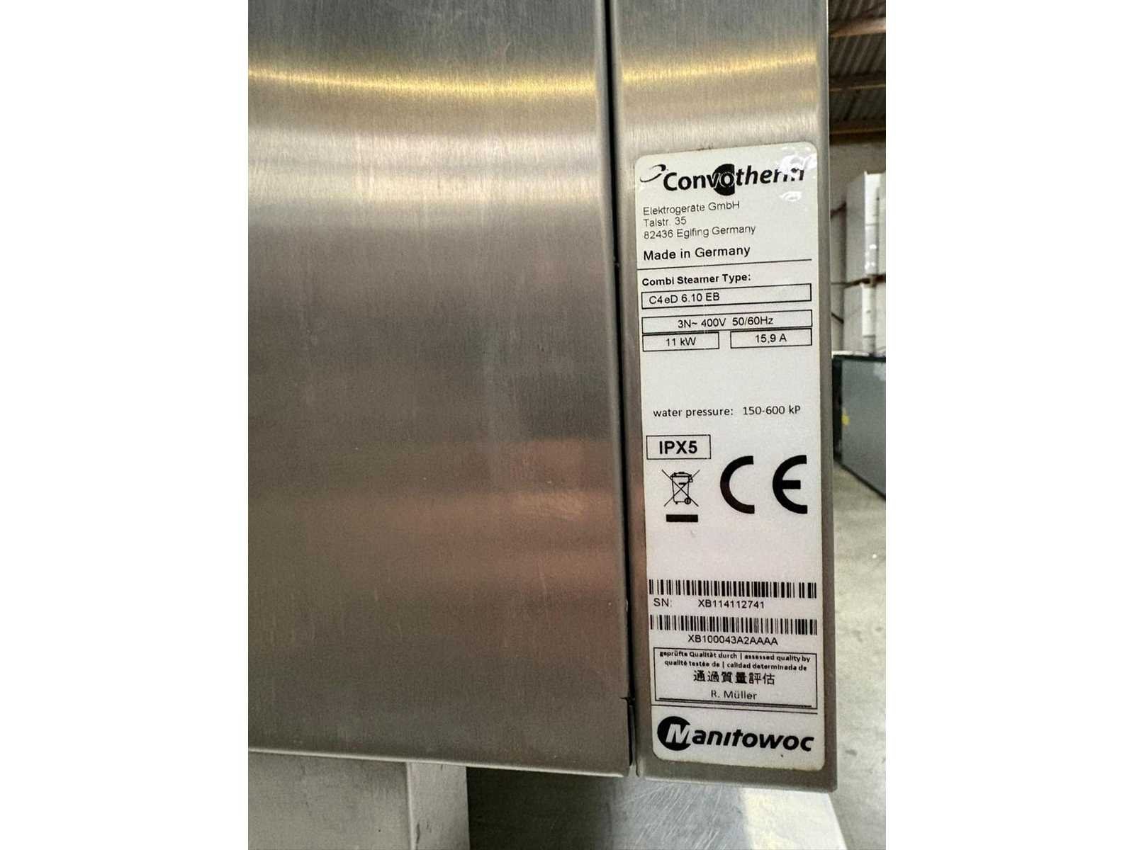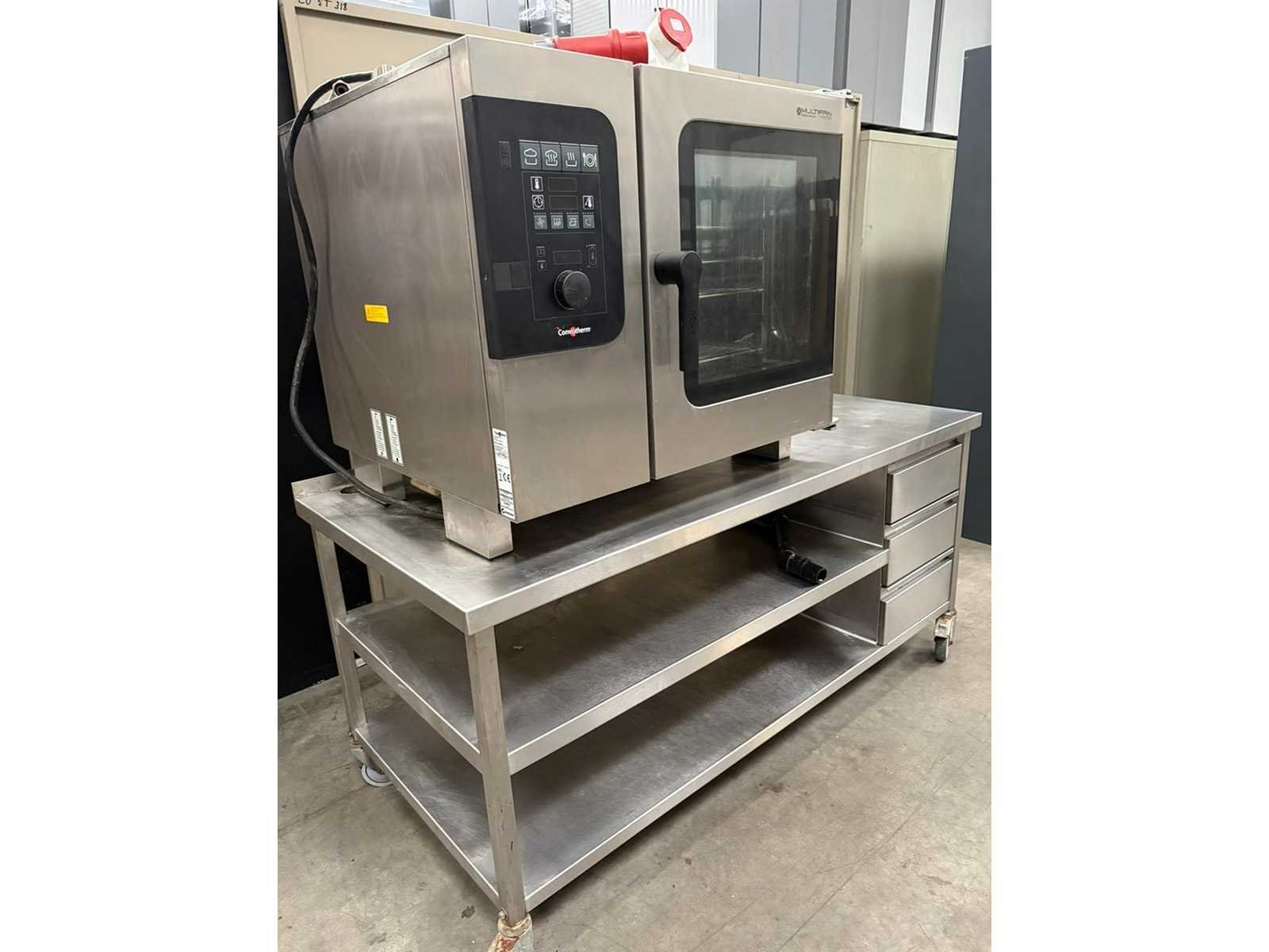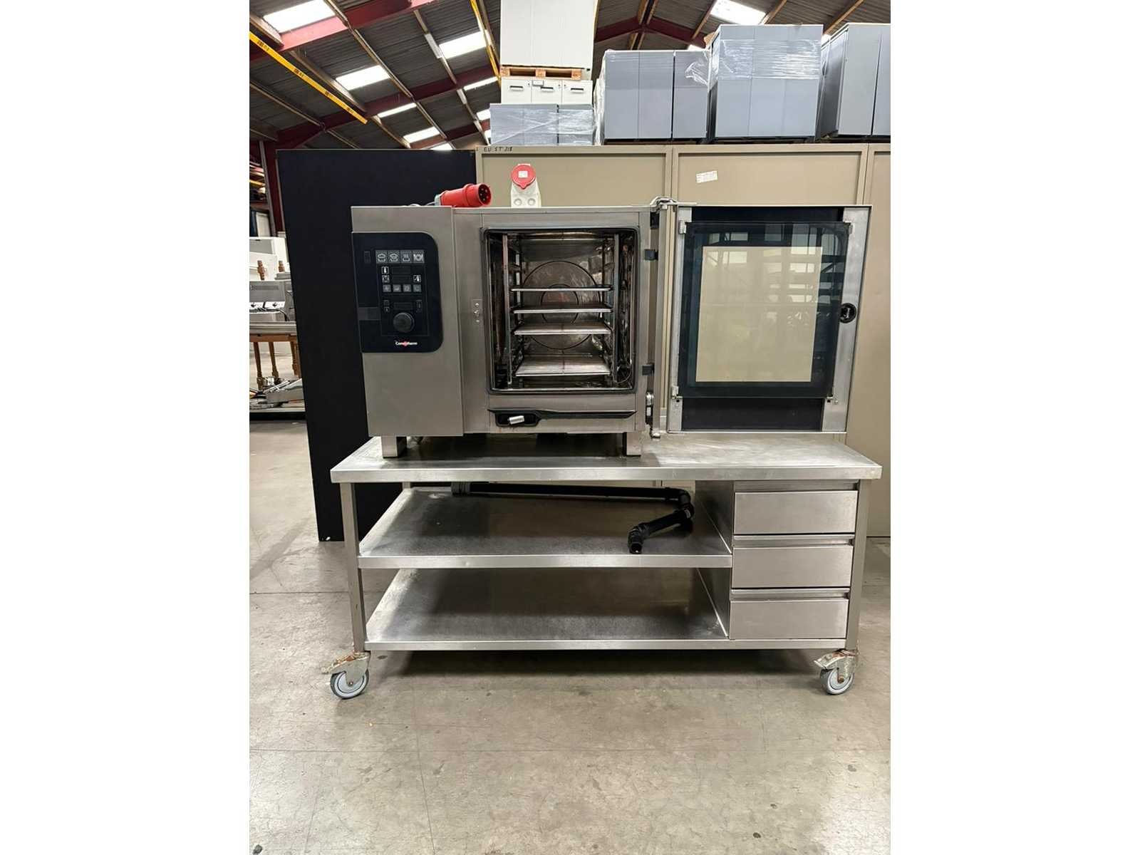 Professionele combisteamer van het merk Convotherm, type C4e D 6.10 EB, geschikt voor intensief horeca- en grootkeukengebruik. De oven combineert hete lucht en stoom en is geplaatst op een verrijdbare inox werktafel met opberglades. Verkoop als één geheel. Merk & type Merk: Convotherm Type: C4e D 6.10 EB Made in Germany Technische gegevens (volgens typeplaat) Capaciteit: 6 × GN 1/1 Aansluiting: 3N~400V Vermogen: 11 kW Frequentie: 50/60 Hz Beschermingsklasse: IPX5 Afmetingen Oven: h 79 × b 92 × d 79 cm Werktafel: h 80 × l 172 × b 81 cm Nee Merk: Convotherm Type: C4e D 6.10 EB Totale afmeting L: 172cm Totale afmeting Breedte: 81cm Totale afmeting Hoogte: 160cm