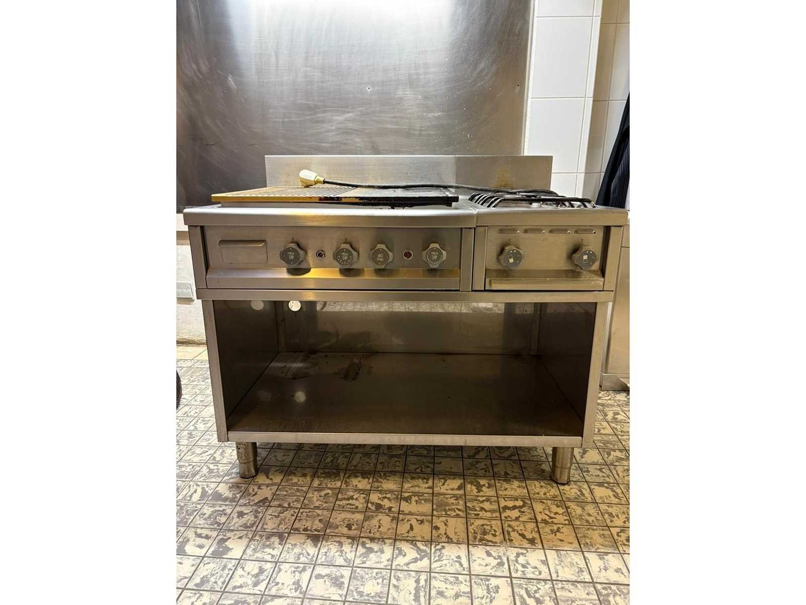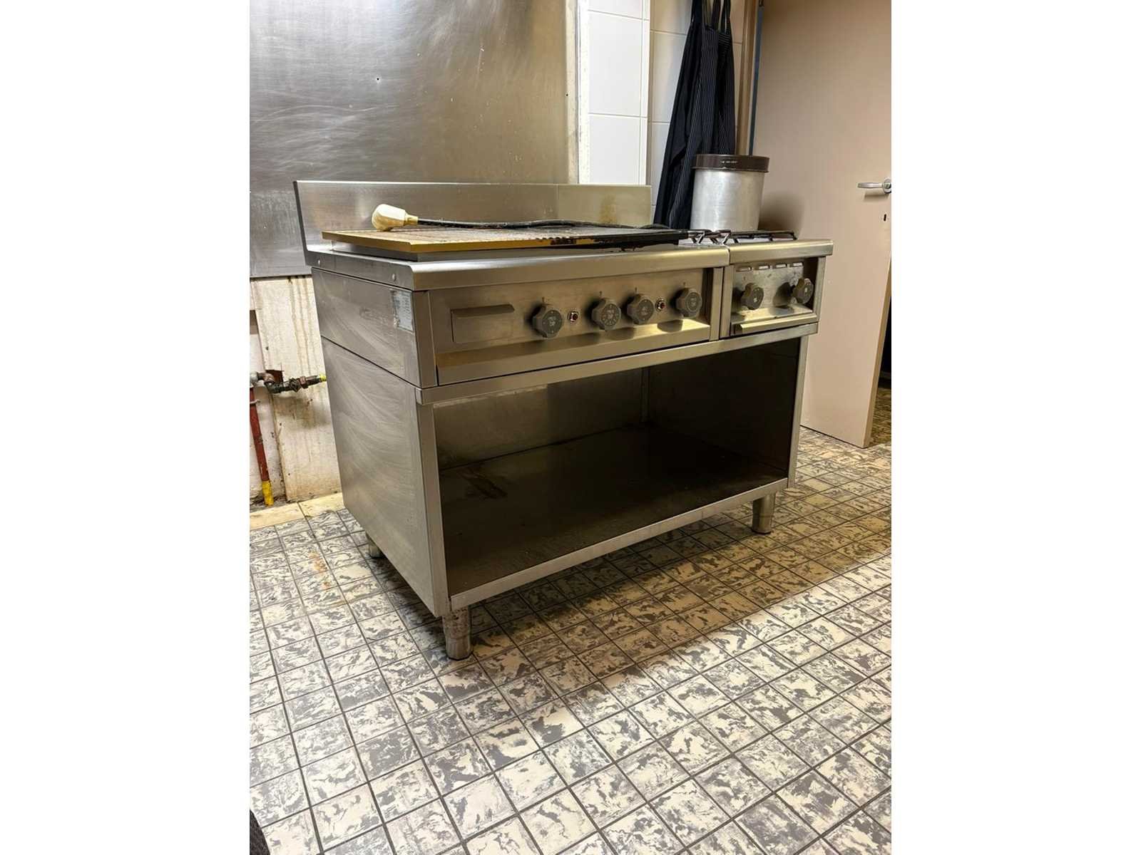 Professionele horeca kooklijn in inox uitvoering, bestaande uit een grote bakplaat/grillplaat en een gasfornuis met meerdere branders. Voorzien van achteropstand en open onderstel. Zware kwaliteit, geschikt voor professionele keukens, foodtrucks of grootkeukens. Nee Type: Combinatie unit Elektrisch verwarmd: true Gasgestookt: true