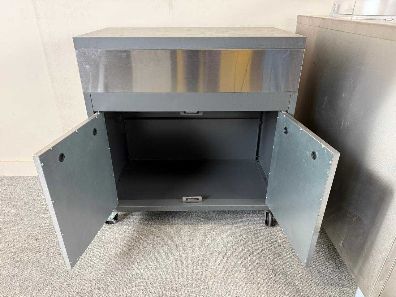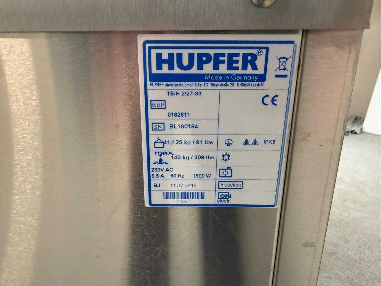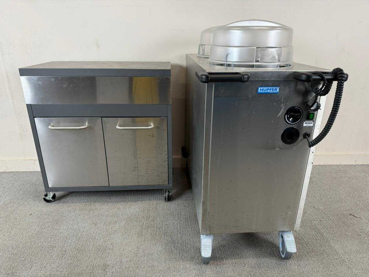Professionele HUPFER warmhoud- en bordenwagen voor horeca- en grootkeukentoepassingen, geschikt voor het warmhouden en transporteren van borden of bereide gerechten. Het toestel is geplaatst op zwenkwielen en wordt geleverd samen met een verrijdbare RVS kast met dubbele deur, ideaal voor stockage of ondersteuning in de keuken. Nee Merk: HUPFER