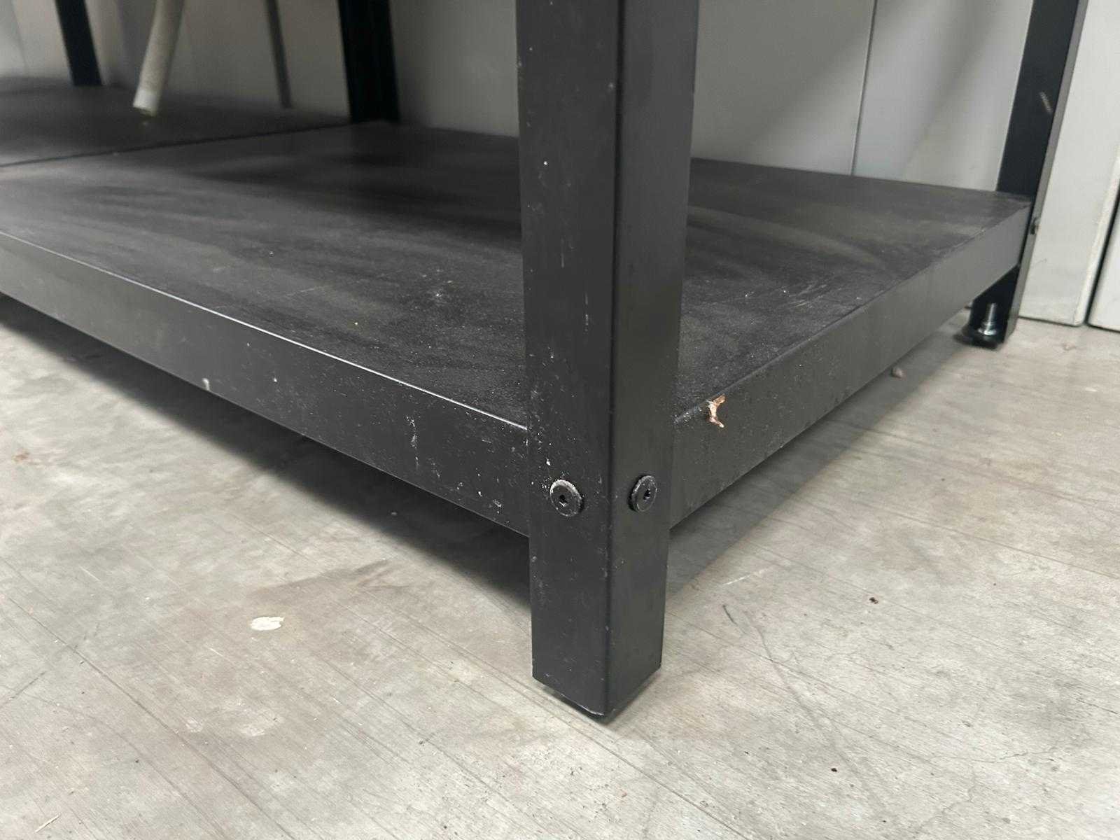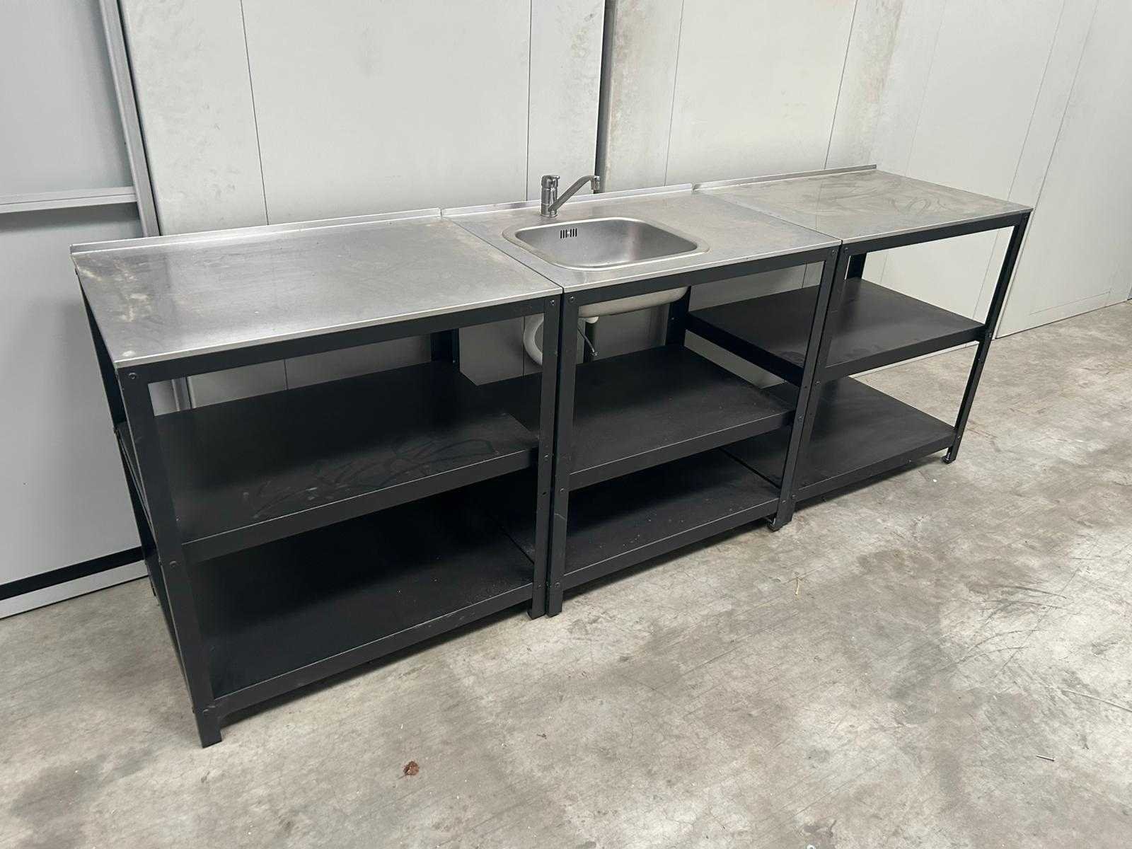 Set van 3 modulaire keukeneilanden in metalen frame-uitvoering met open legplanken. Eén module is uitgerust met een ingebouwde kraan en spoelgedeelte. (Afmetingen is per eiland), Met gebruikssporen, staat kan variëren per item. Nee Product type: Modulair keukeneiland Kleur: Zwart / Metaal Gewicht: 95kg Lengte: 61cm Breedte: 86cm Hoogte: 92cm Materiaal: Zwart Metaal