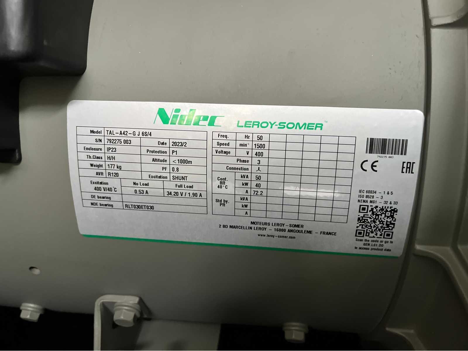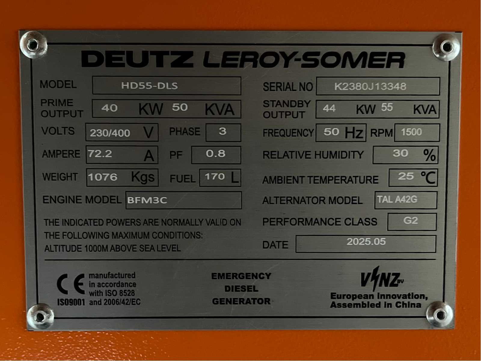 <ul> <li><strong>noodstroomaggregaat</strong></li> <li><strong>motor:</strong> Deutz BFM3C</li> <li><strong>type:</strong> 4-cilinder turbo diesel met intercooler</li> <li><strong>motorinhoud:</strong> 3168 cc</li> <li><strong>motorvermogen:</strong> 50 kW bij 1500 t/min</li> <li><strong>alternator:</strong> Leroy-Somer TAL-A42-G – 4-polige alternator</li> <li><strong>vermogen:</strong> 55 kVA standby / 50 kVA prime (cos φ 0,8)</li> <li><strong>spanning:</strong> 230/400 V – 50 Hz</li> <li><strong>maximale stroom:</strong> 72,2 A</li> <li><strong>isolatieklasse:</strong> H / H</li> <li><strong>beschermingsklasse:</strong> IP23</li> <li><strong>controller:</strong> DeepSea DSE6120</li> <li><strong>batterij:</strong> Varta 12 V – 80 Ah startbatterij</li> <li><strong>dieseltank:</strong> 170 liter dieseltank</li> <li><strong>voorverwarming:</strong> koelvloeistof voorverwarming voor extreem wintergebruik</li> <li><strong>behuizing:</strong> heavy duty geluidswerende behuizing</li> <li><strong>transport:</strong> voorzien van vorkkokers en hijsogen</li> <li><strong>gewicht:</strong> 1076 kg</li> <li><strong>afmetingen:</strong> 225 x 96 x 151 cm (L x B x H)</li> <li><strong>onderhoudspunten:</strong> aftappunten voor diesel, motorolie en koelvloeistof</li> <li><strong>documentatie:</strong> handleidingen inbegrepen</li> <li><strong>sleutels:</strong> sleutels inbegrepen</li> <li><strong>staat:</strong> ongebruikt, volledig startklaar</li> </ul> Nee Merk: Deutz — Leroy-Somer Type: 55 kVA