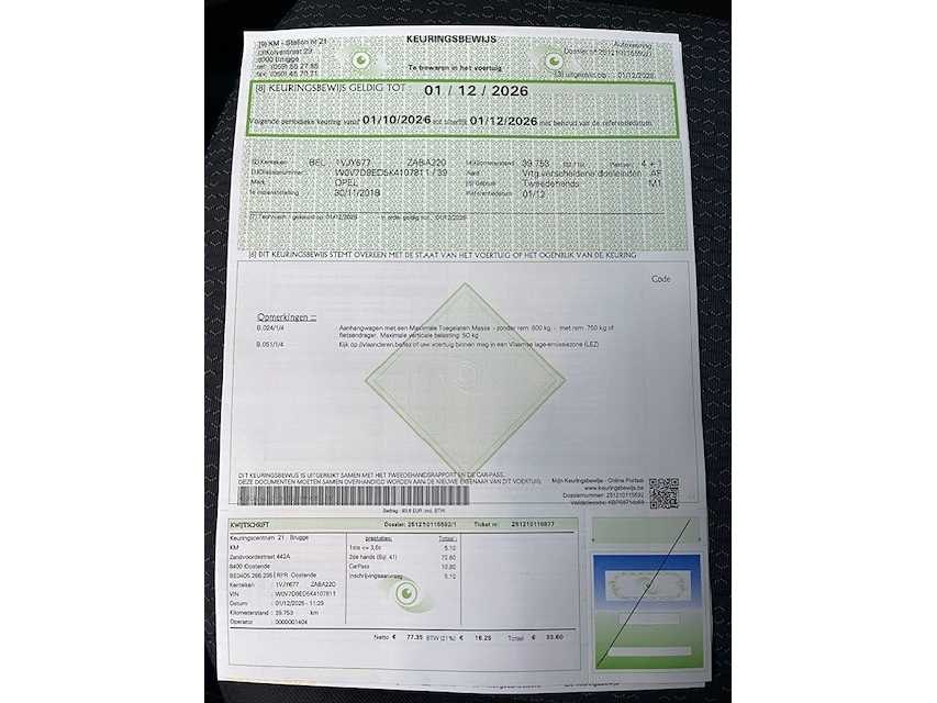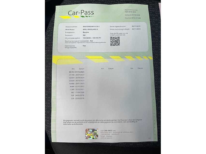 Opel Crossland X 1.2 Ecotec met slechts 39.753KM, auto is al gekeurd voor verkoop en kan nog ingeschreven worden tot 1 februari 2026. Inschrijvingsformulier beschikbaar, ook onderhoudshistorie op car-pass. Alle documenten beschikbaar deel 1, deel 2, inschrijvingsformulier, COC, 2 sleutels. https://public.car-pass.be/verify/7405-6916-8603?lang=nl Nee Merk: Opel Model: Crossland X Type: Ecotec Bouwjaar: 2018 Afgelezen kilometerstand: 39753km Cilinderinhoud: 1200cc Vermogen (kW): 81kW Brandstof: BENZINE Chassisnummer: W0V7D9ED5K4107811 Datum eerste toelating: 30/11/2018 APK vervaldatum: 01/12/2026 Vermogen (pk): 81hp Energielabel: A Aandrijving: VOORWIEL Aantal zitplaatsen: 5 Kleur: ZWART Transmissie: MANUEEL Aantal deuren: 5 Aantal sleutels: 2 Aantal cilinders: 3 Nationaliteit documenten: BELGISCH Onderhoudshistorie: CARPASS Start en rijdt: JA Keuringsrapport geldig tot: 01/12/2026 Technische fiche: true Vavato voert geen technische keuring uit.: true Airconditioning: true Navigatie: true Inschrijvingsbewijs - deel 1 : JA Inschrijvingsbewijs - deel 2: JA