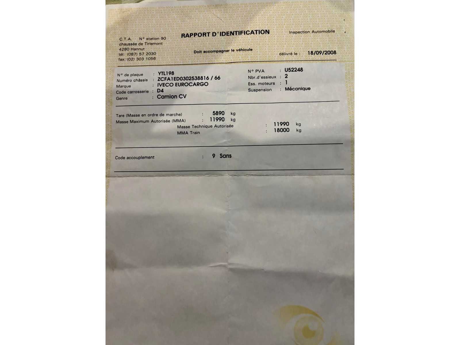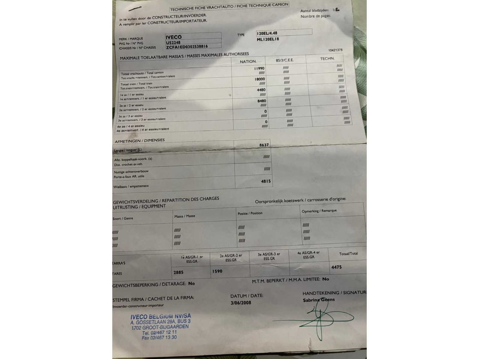 Een goed onderhouden Iveco Eurocargo 120EL18 uit 2008, uitgerust met een gesloten opbouw met schuifzeilen en een hydraulische laadklep. Deze 12-tons vrachtwagen is ideaal voor distributie, logistiek, bouwtransport, pallets en volumegoederen - Euro 5 motor → ook in lage-emissiegebieden inzetbaar - hydraulische laadklep 525kg - Belgische papieren compleet - Laatste technisch keuring 5/9/2023 (en nadien niet meer mee gereden volgens verklaring verkoper): Enkel lichte opmerkingen: Oppervlakteroest aan chassis/Lichte corrosie dragende structuur/Koplampafstelling te controleren - Motor start goed met booster; batterij is aan vervanging toe. Door de lage accuspanning was de kilometerstand niet leesbaar bij opname - vrachtwagen wordt verkocht ZONDER INHOUD Nee Merk: Iveco Type: Eurocargo 120EL18 Bouwjaar: 2008 Chassisnummer VIN: ZCFA1ED0302538816 Cilinderinhoud: 3920cc Kilometerstand bij opname: 140000km Datum eerste toelating: 8/9/2008 Type transmissie: Handmatig Aantal assen: 2 Fuel Type: Diesel Laadvermogen: 6100kg Emissieklasse: Euro 5 Hydraulische laadklep: true Eigen gewicht: 5890kg Totale afmeting L: 8200mm Nationaliteit documenten: B Kentekenpapieren compleet?: true Aantal zitplaatsen: 3 Zelf rijdend exporteren: Mogelijk Handgeschakelde versnellingsbak: true Diesel: true