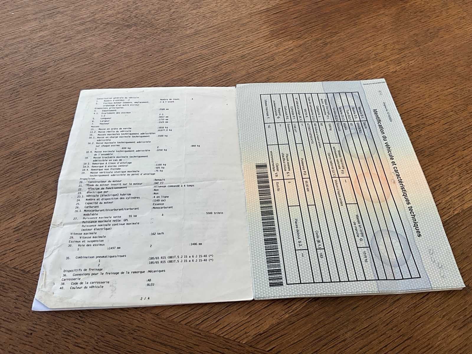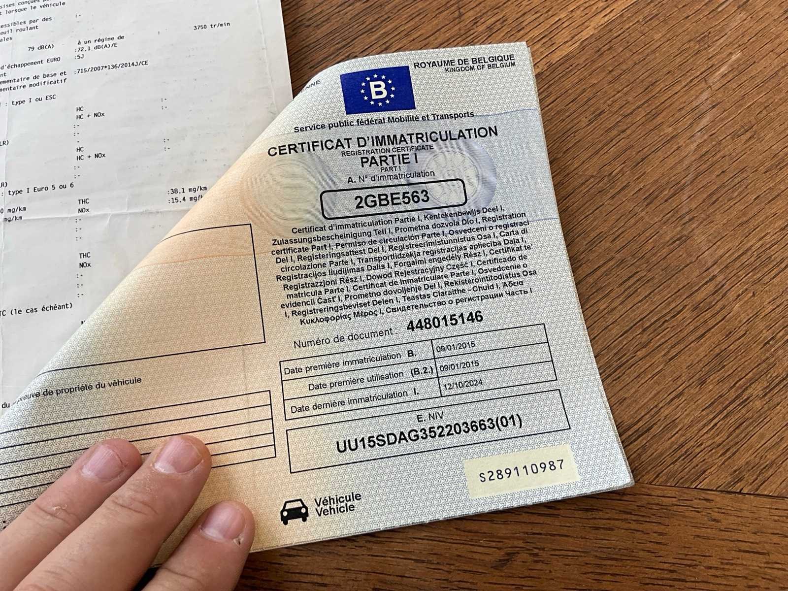 Merk: Dacia Model: Sandero Variant/Versie: SSDAG / SSDAG03 Type carrosserie: AB – Voiture à hayon arrière (Hatchback) Categorie voertuig: M1 (personenwagen) Euronorm: Euro 5b Brandstof: Benzine Kleur: Blauw Chassisnummer (VIN): UU15SDAG352203663(01) Plaats chassisnummer: op het voertuig zichtbaar (gezien in technische fiche) Technische kenmerken Cilinderinhoud: 1.598 cm³ Motorvermogen: 55 kW (75 pk) Aantal cilinders: 4 in lijn Max. vermogen bij toerental: 55 kW bij 5.500 t/min Koppel: 128 Nm bij 3.000 t/min Maximumsnelheid: 162 km/u Massa in rijklare toestand: 1.016 kg Maximaal toegelaten massa (F.2): 1.500 kg Aantal zitplaatsen: 5 Registratie Kentekenplaat: 2GBE563 Documentnummer: 448015146 Datum eerste inschrijving: 09/10/2015 Datum eerste ingebruikname: 09/10/2015 Datum laatste inschrijving: 12/10/2024 Keuring Laatste keuring: 11/10/2024 Geldig tot: 11/10/2025 Kilometerstand bij keuring: 168.860 km Nee Merk: Dacia Bouwjaar: 2015 Afgelezen kilometerstand: 178665km Cilinderinhoud: 1598cc Vermogen (kW): 55kW Brandstof: benzine Chassisnummer: UU15SDAG352203663(01) Datum eerste toelating: 09/10/2015 Vermogen (pk): 75hp Aantal zitplaatsen: 5 Transmissie: handgeschakkeld Stuurwiel: links Emissieklasse: 5B Aantal deuren: 5 Aantal sleutels: 1 Carrosserie: Hatchback Nationaliteit documenten: belg Gelijkvormigheidsattest aanwezig: true Vavato voert geen technische keuring uit.: true Inschrijvingsbewijs - deel 1 : ja Inschrijvingsbewijs - deel 2: ja