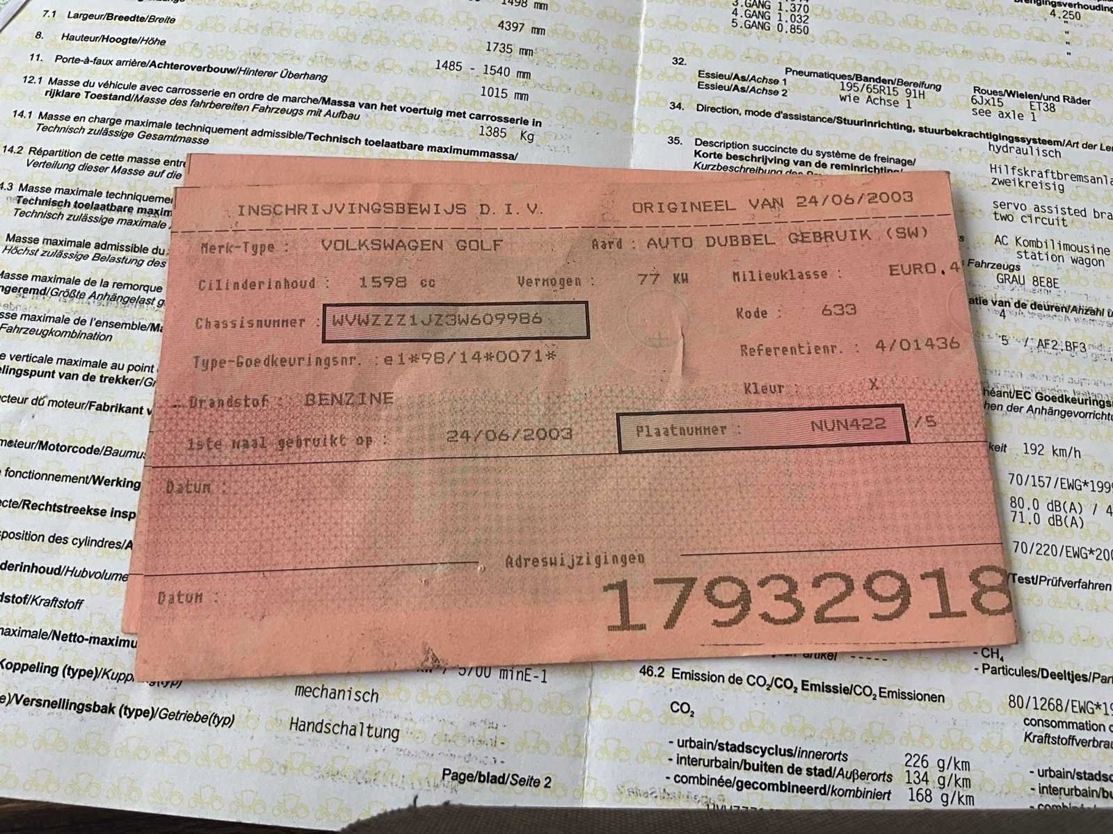 Nee Merk: Volkswagen Model: Golf Bouwjaar: 2003 Brandstof: benzine Chassisnummer: 9986