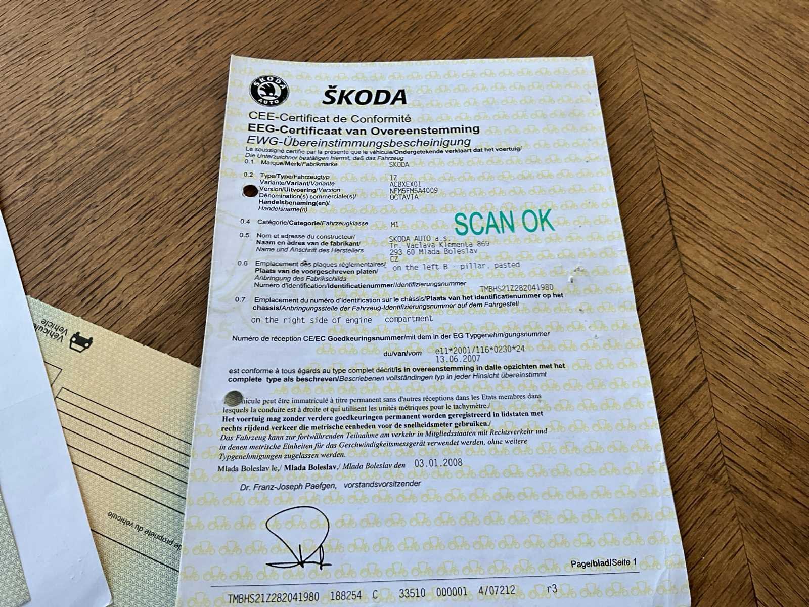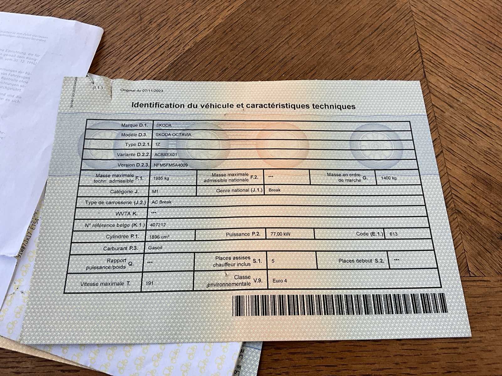 Merk: Skoda • Model: Octavia • Type: 1Z • Variant: ACZBEX01 • Versie: NFM5FM5A009 • VIN / Chassisnummer: TMBHS21Z282041980 • Carrosserietype: Break (AC Break / Break familiale) • Categorie: M1 (personenwagen) • Brandstof: Diesel (Gasoil) • Milieunorm: Euro 4 • Vermogen: 77 kW (ongeveer 105 pk) • Cilinderinhoud: 1.896 cm³ ⸻ ⚙️ Technische kenmerken • Maximaal toegelaten massa (F.2): 1.895 kg • Massa in rijklare toestand (G): 1.400 kg • Aantal zitplaatsen: 5 • Toegestane snelheid: 191 km/u • Trekhaakgegevens: • Remgewicht toegestaan: 1.400 kg • Max verticale kogeldruk: 75 kg • Max sleepgewicht met rem: 650 kg Nee Merk: Skoda Model: Octavia Bouwjaar: 2008 Afgelezen kilometerstand: 279000km Cilinderinhoud: 1898cc Vermogen (kW): 77kW Chassisnummer: TMBHS21Z282041980 Vermogen (pk): 105hp Aantal zitplaatsen: 5 Transmissie: Handgeschakeld Emissieklasse: 4 Aantal deuren: 5 Nationaliteit documenten: Belg Gelijkvormigheidsattest aanwezig: true Vavato voert geen technische keuring uit.: true Inschrijvingsbewijs - deel 1 : Aanwezig Inschrijvingsbewijs - deel 2: Aanwezig