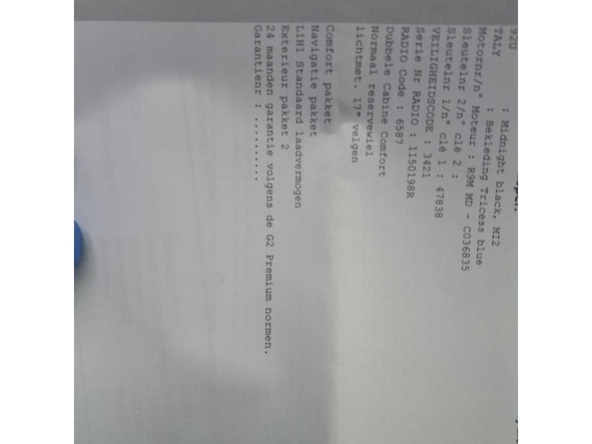 Merk / Model: Opel Vivaro Type: Lichte vracht Cabine: Dubbele cabine Zitplaatsen: 5 Motor: 1.6 CDTI Diesel Vermogen: 85 kW Emissienorm: Euro 5b Eerste inschrijving: 26/03/2015 Kilometerstand: 175.000 km Chassisnummer (VIN): W0L3F7004FV623328 Aantal sleutels: 2 Uitrusting & opties Comfort cabine Comfortpakket Navigatiepakket Radio Achteruitrijcamera Airconditioning Centrale vergrendeling Lichtenpakket 17 inch velgen Normaal reservewiel Standaard zetels Onderhoud & staat 175.000 km 4 nieuwe banden Rookvrije wagen Motor en versnellingsbak in goede staat Normale gebruikssporen volgens leeftijd en kilometerstand Beschrijving Te koop aangeboden: Opel Vivaro van de eerste eigenaar, steeds correct onderhouden en betrouwbaar in gebruik. Deze lichte vracht met dubbele cabine en 5 zitplaatsen is ideaal voor zelfstandigen of wie werk en comfort wil combineren. De 1.6 CDTI dieselmotor staat bekend om zijn zuinig verbruik en degelijkheid. Dankzij de achteruitrijcamera, navigatie en comfortopties is de wagen aangenaam in dagelijks gebruik. Rondom krassen en kleine deukjes + achter de linker voordeur. Nee Merk: Opel Model: Vivaro Bouwjaar: 2015 Afgelezen kilometerstand: 175000km Brandstof: DIESEL Chassisnummer: W0L3F7004FV623328