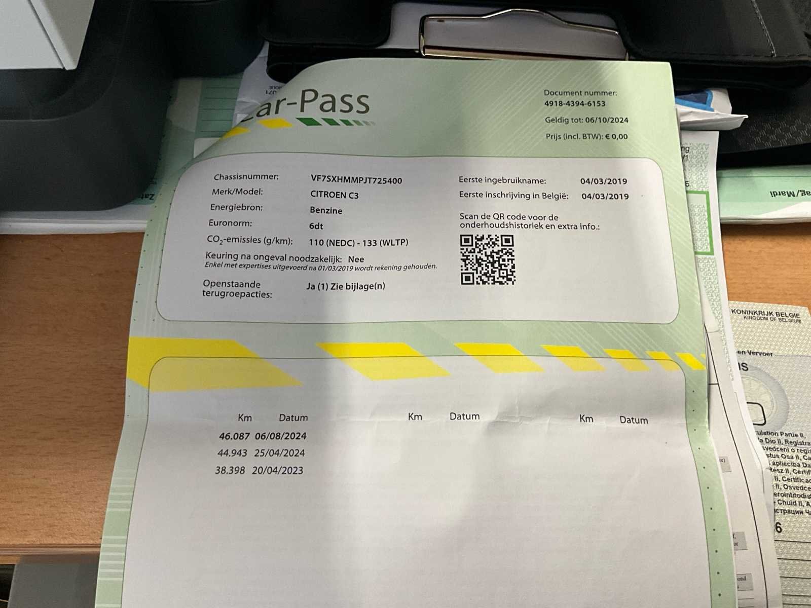 Merk / Model: Citroën C3 Type: Hatchback Variant: XHMM Versie: P/BC0 Categorie: M1 Stoelen: 5 Euronorm: 6d-TEMP Brandstof: Benzine Motorinhoud: 1199 cc Motorvermogen: 50 kW (≈ 68 pk) CO₂-uitstoot: 110 (NEDC) – 133 (WLTP) g/km Eerste ingebruikname: 04/03/2019 Chassisnummer (VIN): VF7SXHMMPJ725400 Documentnummer kentekenbewijs: 446533886 Car-Pass documentnummer: 4918-4394-6153 Koetswerktype: Hatchback Plaatsen bestuurder + inzittenden: 5 Eerste inschrijving in België: 04/03/2019 Laatste inschrijving: 09/08/2024 Max. snelheid: 164 km/u No Merk: Citroën Model: C3 Bouwjaar: 2019 Afgelezen kilometerstand: 64738km Cilinderinhoud: 1199cc Vermogen (kW): 50kW Brandstof: benzine Chassisnummer: VF7SXHMMPJ725400 Vermogen (pk): 68hp Aantal zitplaatsen: 5 Transmissie: handschakkeld Emissieklasse: 6d Start en rijdt: ja