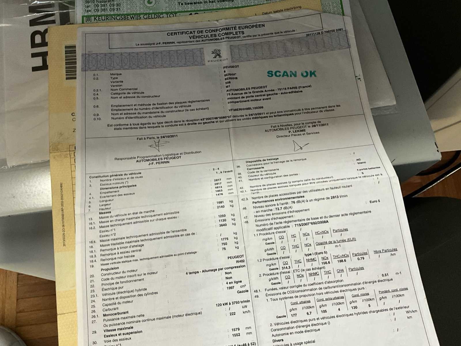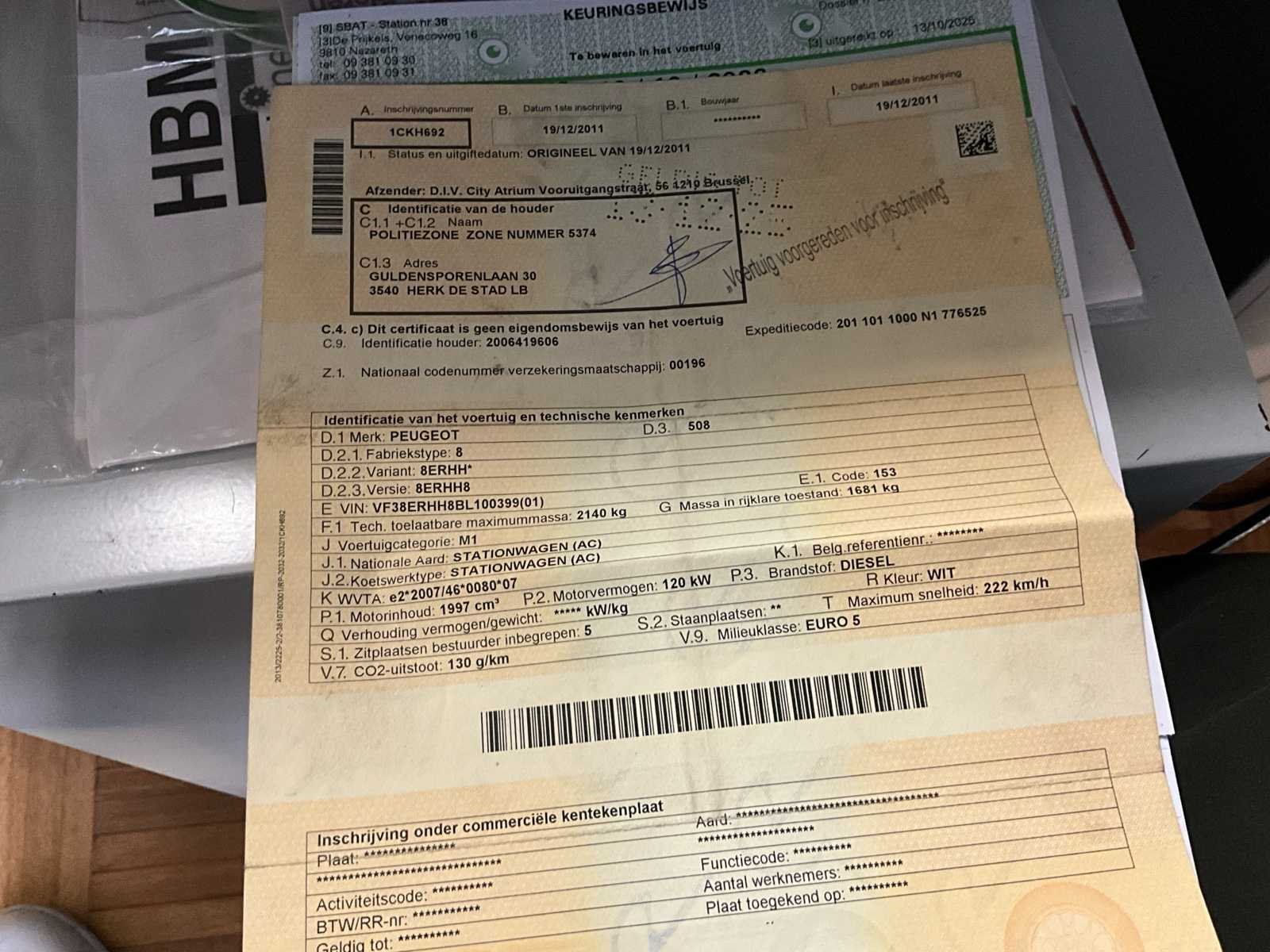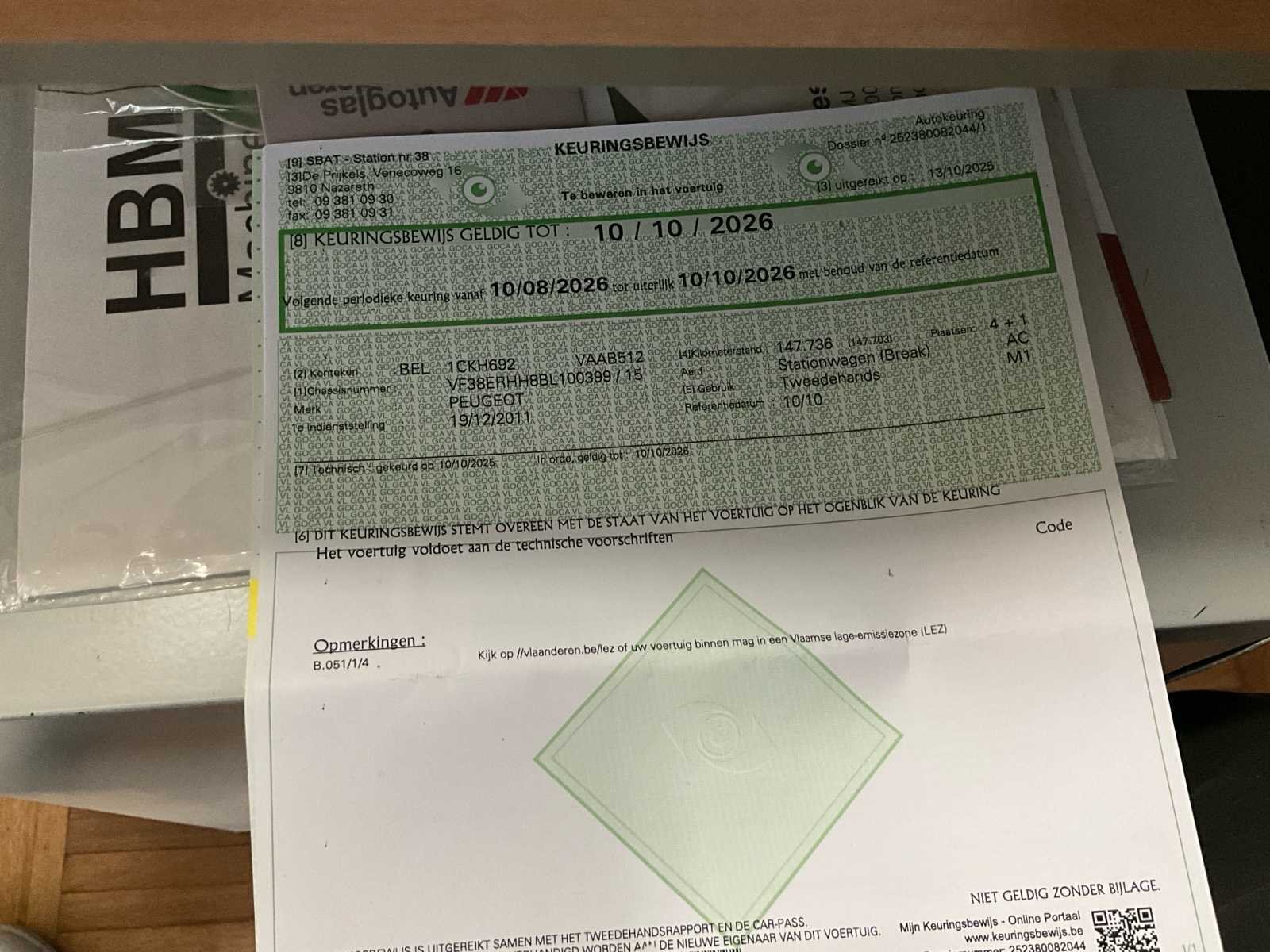 Is gekeurd voor verkoop Merk / Model: Peugeot 508 Koetswerktype: Stationwagen (Break) Type: S Variant: BERHHB Versie: BERHHB1.00399 / 15 Categorie: M1 Nationale aard: Stationwagen (AC) Kleur: Wit Zitplaatsen: 5 Datum eerste ingebruikname: 19/12/2011 Datum laatste inschrijving: 19/12/2011 Nummerplaat: 1CKH692 Chassisnummer (VIN): VF38ERHHB1L003999 Documentnummer kentekenbewijs: 2006419606 Laatste keuring: 13/10/2025 Geldig tot: 10/10/2026 Volgende keuring mogelijk vanaf: 10/08/2026 Kilometerstand keuring: 147.736 km Motorinhoud: 1997 cc Motorvermogen: 120 kW (≈163 pk) Brandstof: Diesel Maximumsnelheid: 222 km/u CO₂-uitstoot: 130 g/km Milieuklasse: EURO 5 Nee Merk: Peugeot Model: 508 Bouwjaar: 2011 Afgelezen kilometerstand: 147920km Cilinderinhoud: 1997cc Vermogen (kW): 120kW Brandstof: diesel Chassisnummer: VF7SChMNZ6FWS98267 Datum eerste toelating: 30112015 Vermogen (pk): 163hp Kleur: wit Emissieklasse: 5 Nationaliteit documenten: belg Start en rijdt: ja Inschrijvingsbewijs - deel 1 : ja Inschrijvingsbewijs - deel 2: ja