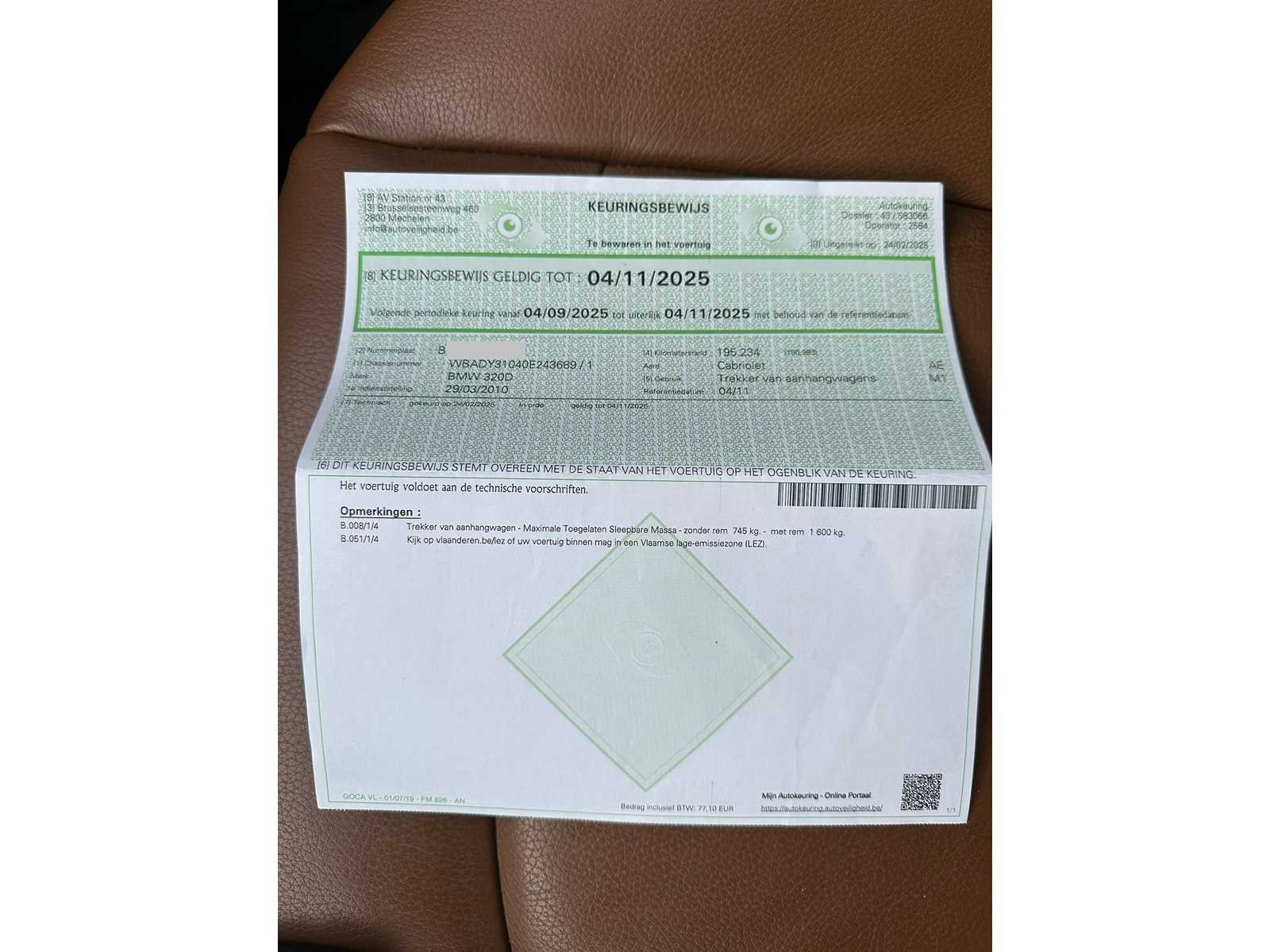Trekhaak aanwezig Start en rijd 1995cc Bj2010 Nee Merk: BMW Model: 320D cabrio Bouwjaar: 2010 Afgelezen kilometerstand: 197618km Cilinderinhoud: 1995cc Vermogen (kW): 120kW Brandstof: diesel Datum eerste toelating: 29032010 Stuurwiel: links Emissieklasse: 5 Carrosserie: cabrio Nationaliteit documenten: Belg Start en rijdt: ja Vavato voert geen technische keuring uit.: true Inschrijvingsbewijs - deel 1 : aanwezig Inschrijvingsbewijs - deel 2: aanwezig
